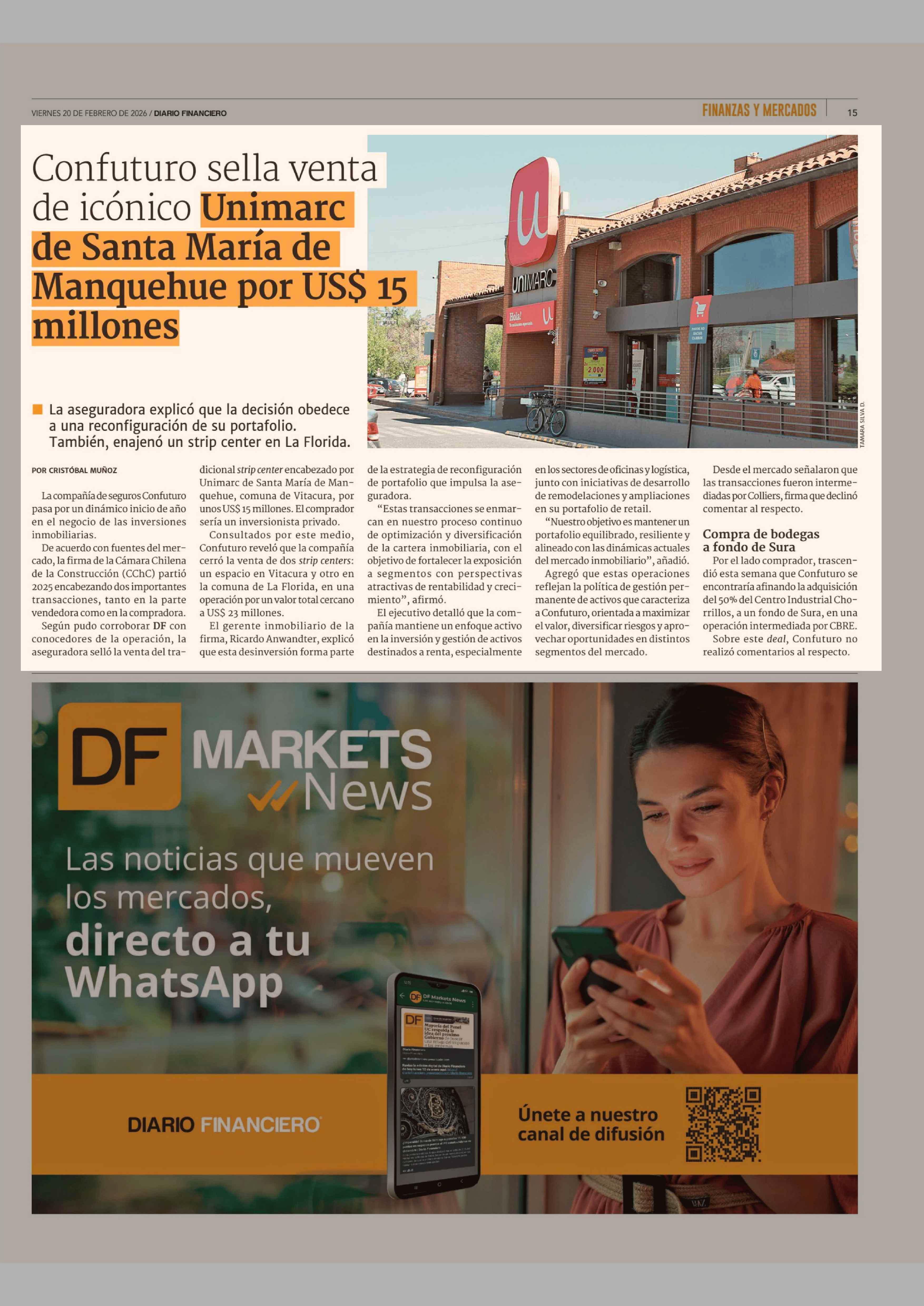 Confuturo sella venta de icónico Unimarc de Santa María de Manquehue por US$ 15 millones 20-02-2026 Diario Financiero |