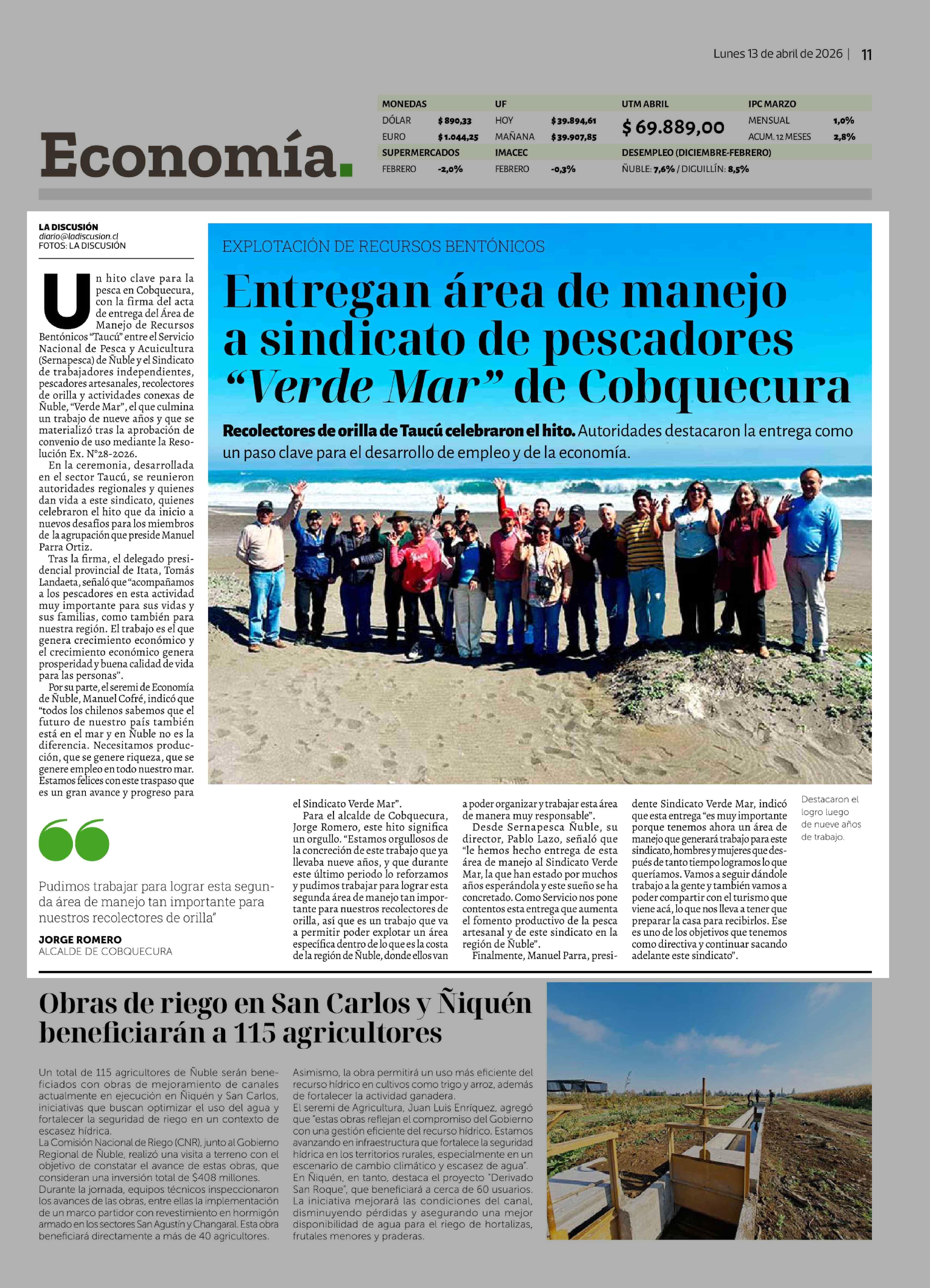 Entregan área de manejo a sindicato de pescadores "Verde Mar" de Cobquecura 13-04-2026 La Discusión |