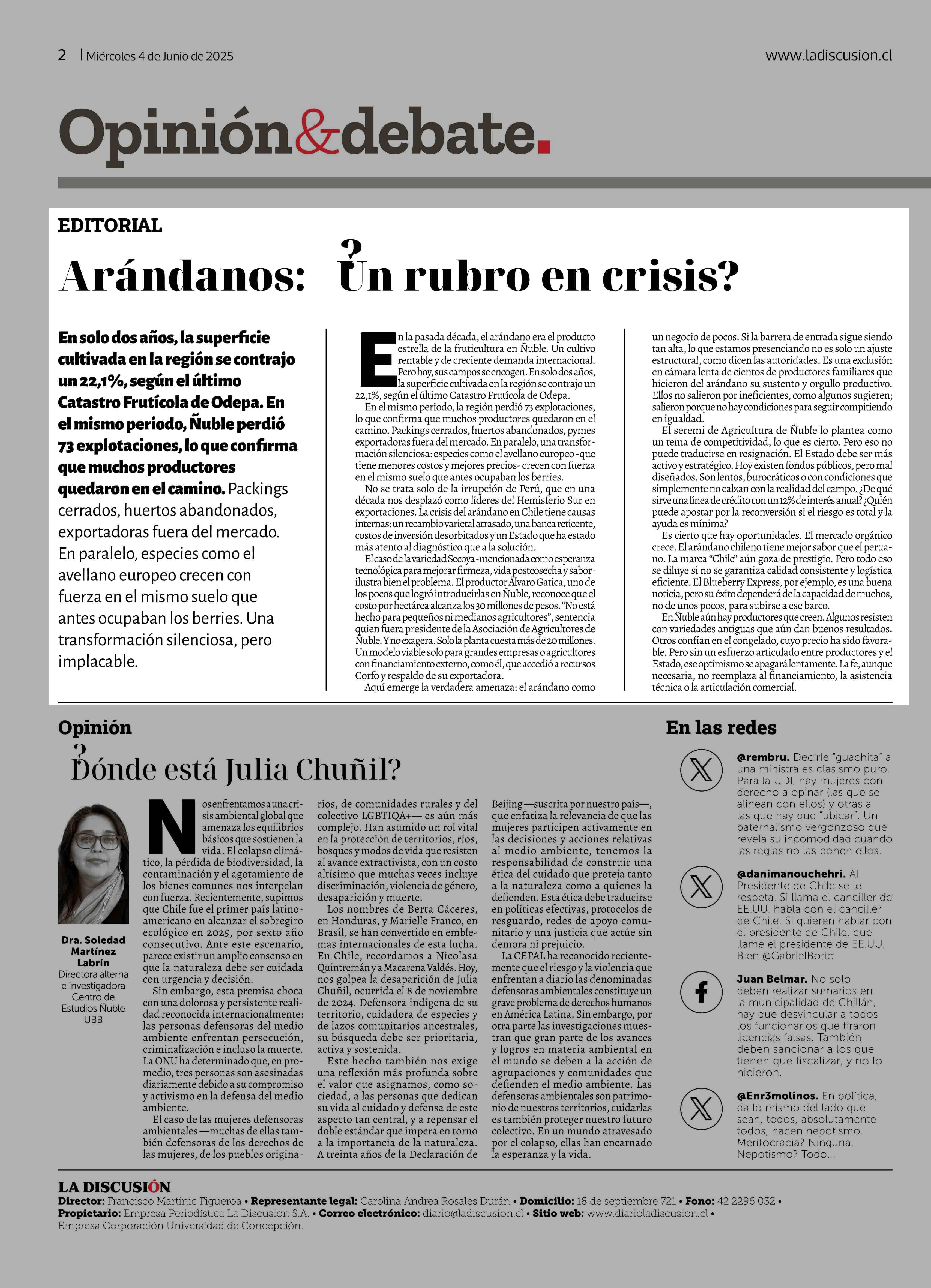 Editorial: Arándanos: ¿Un rubro en crisis? 04-06-2025 La Discusión |