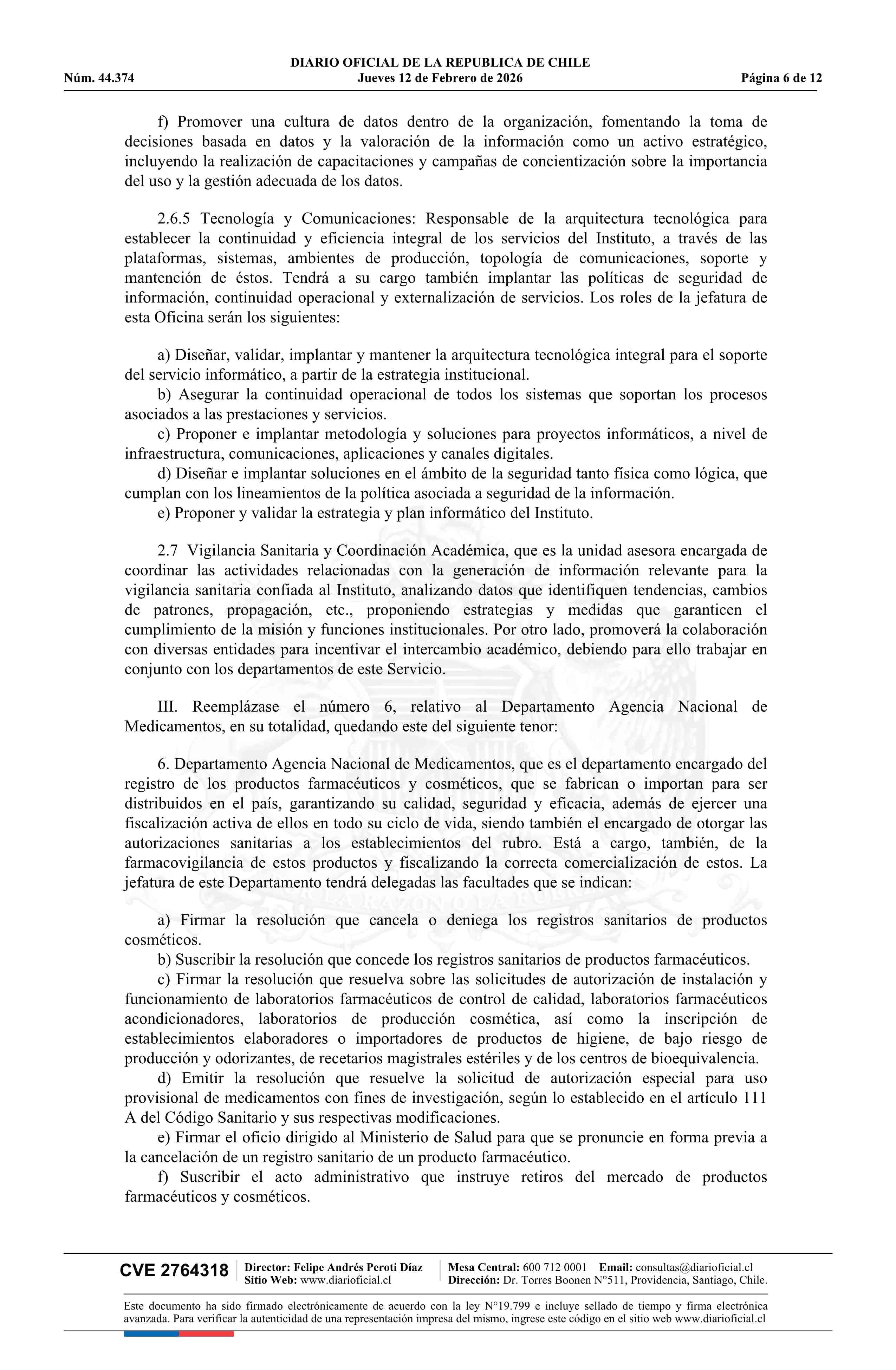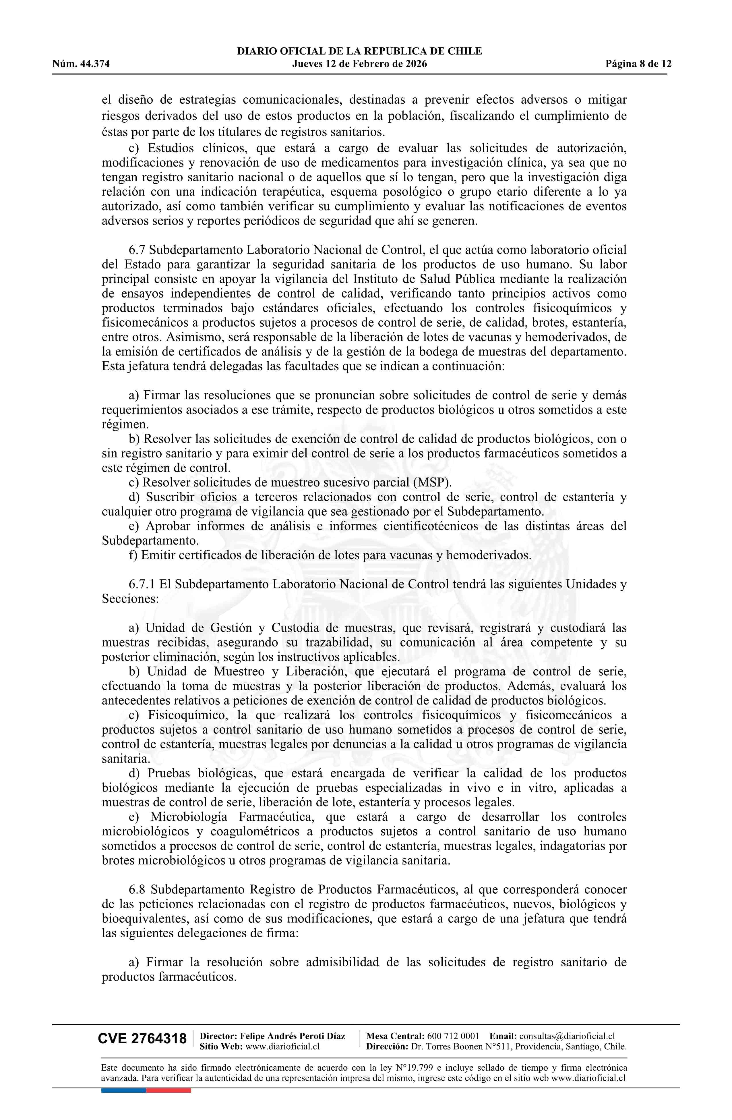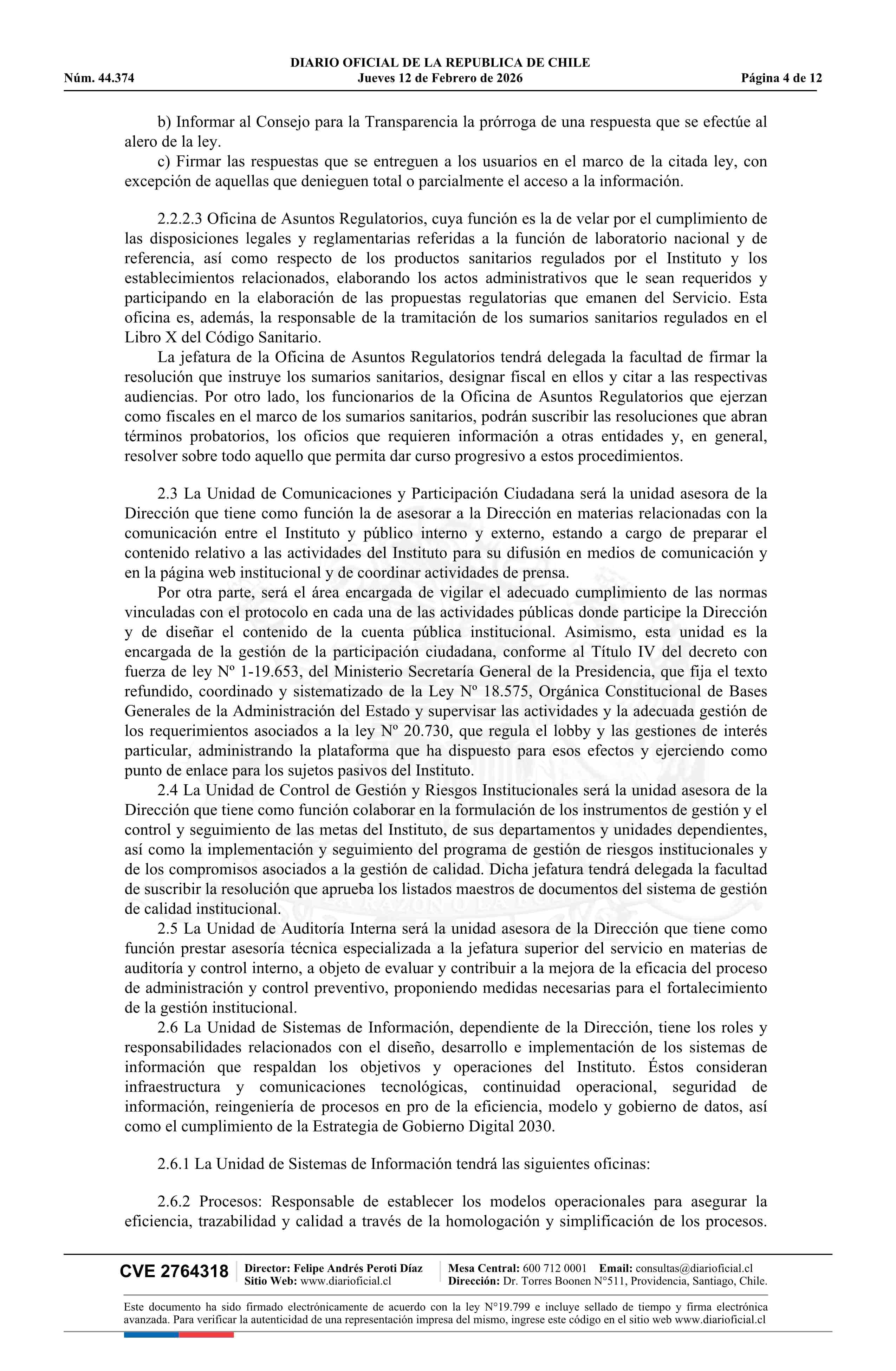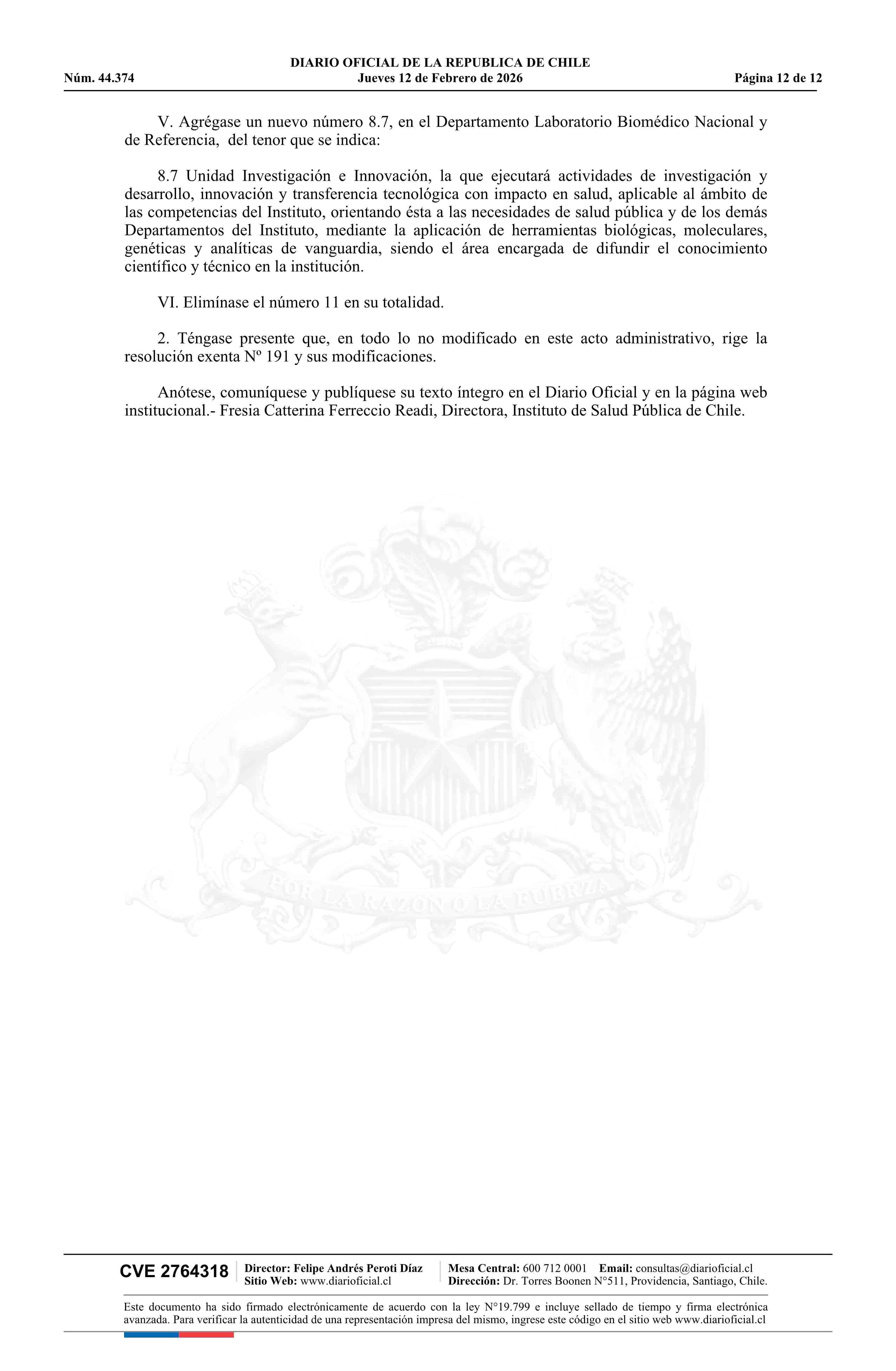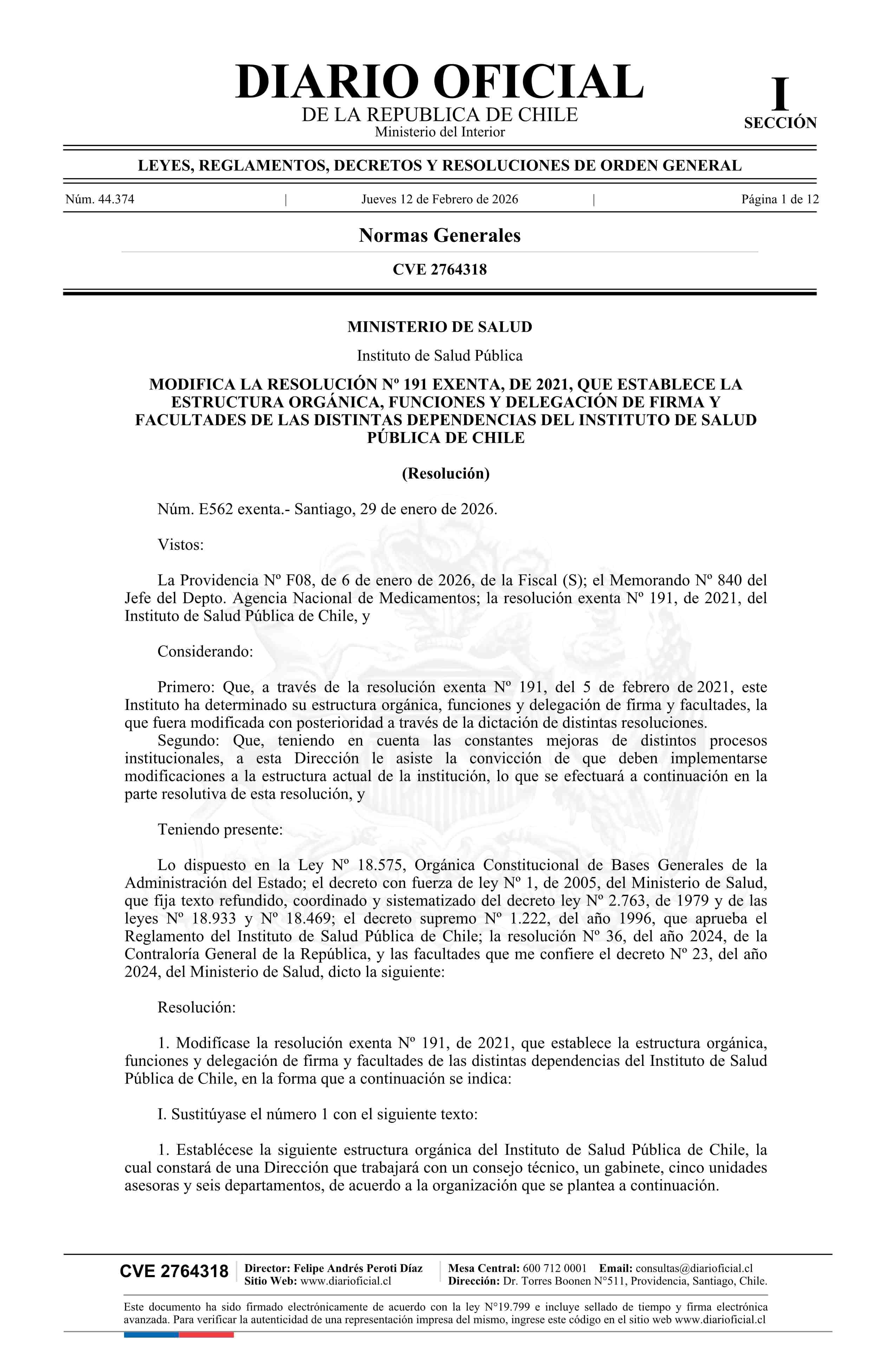 Título: Resolución exenta número E562, de 2026.- Modifica la resolución Nº 191 exenta, de 2021, que establece la estructura orgánica, funciones y delegación de firma y facultades de las distintas dependencias del Instituto de Salud Pública de Chile