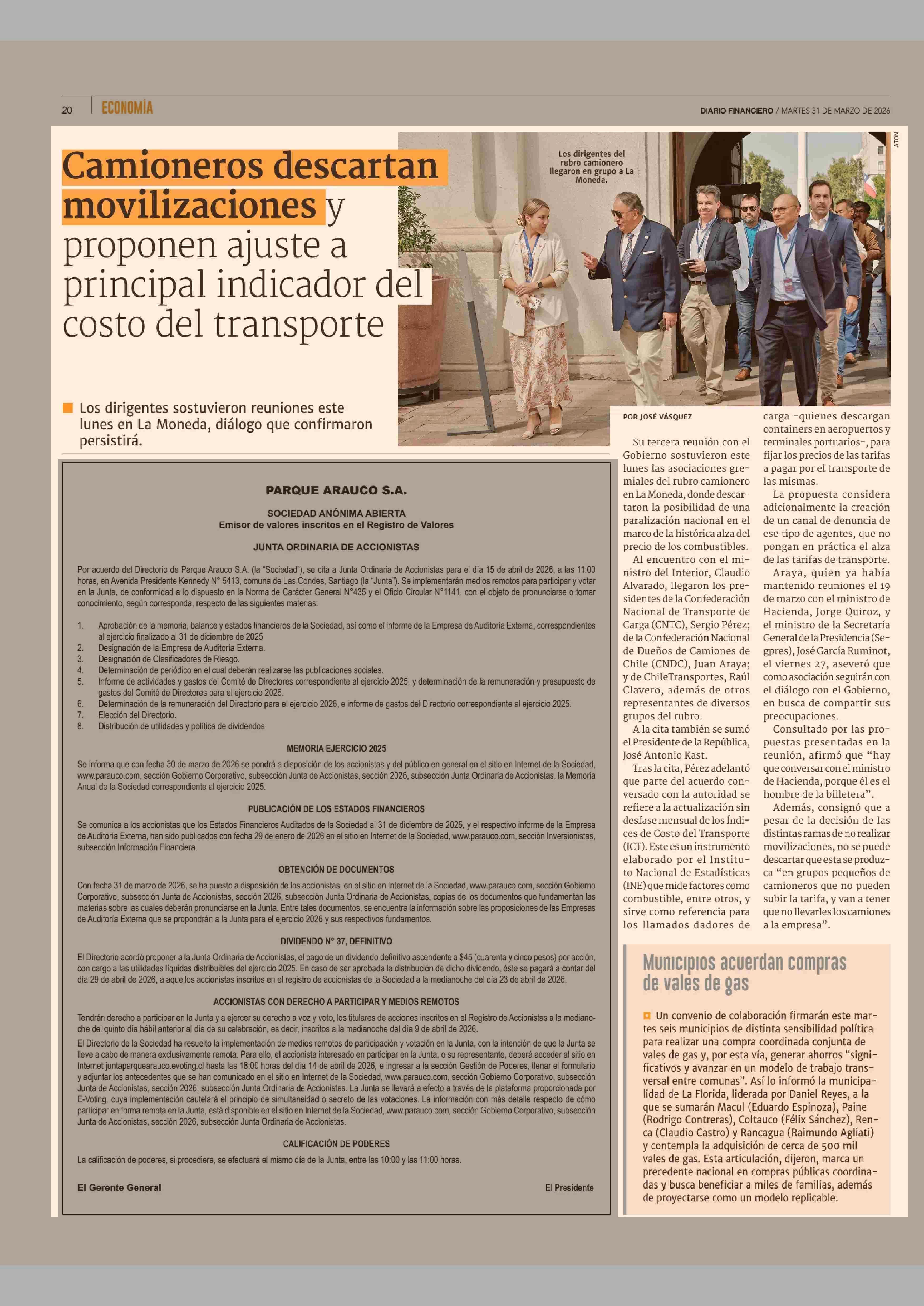 Camioneras descartan movilizaciones y proponen ajustes a principal indicador del costo del transporte 31-03-2026 Diario Financiero |