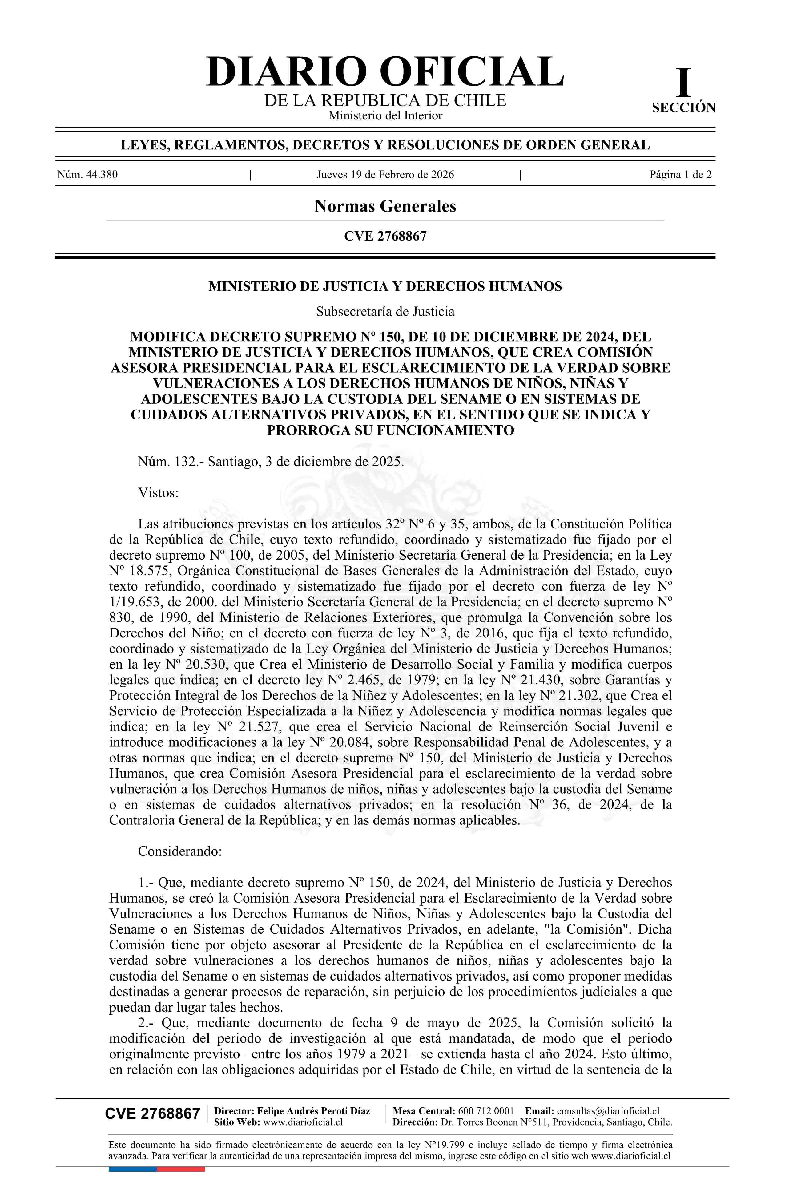 Título: Decreto número 132, de 2025.- Modifica decreto Nº 150, de 2024, que crea Comisión Asesora Presidencial para el esclarecimiento de la verdad sobre vulneraciones a los derechos humanos de niños, niñas y adolescentes bajo la custodia del Sename o en sistemas de cuidados alternativos privados, y prorrog
