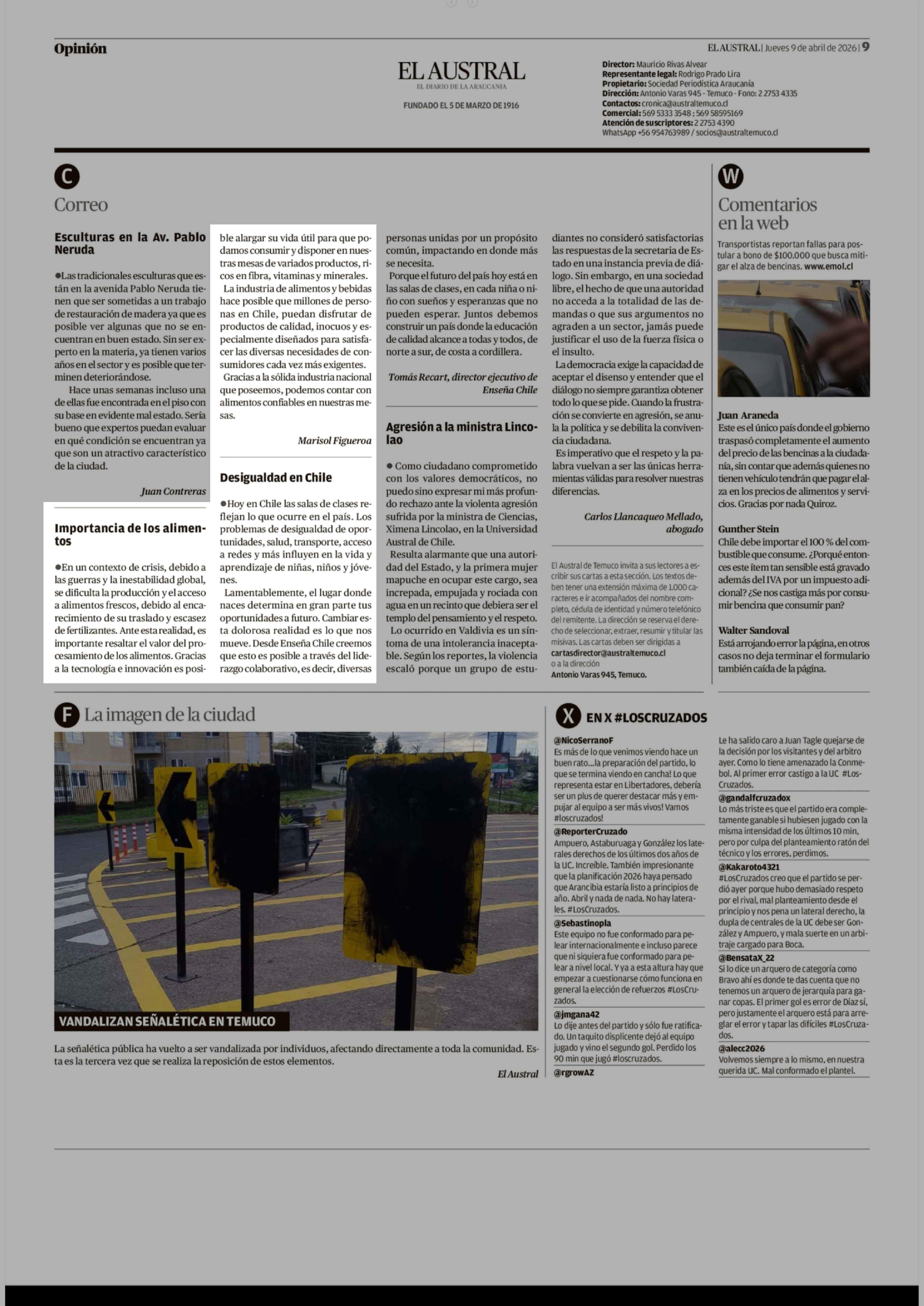 CARTAS: Importancia de los alimentos 09-04-2026 El Austral de la Araucanía |