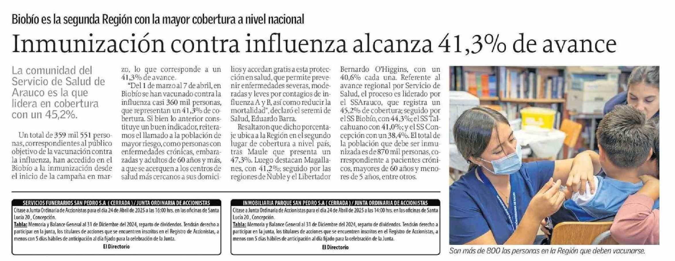 Inmunización contra influenza alcanza 41,3% de avance 09-04-2025 El Sur |