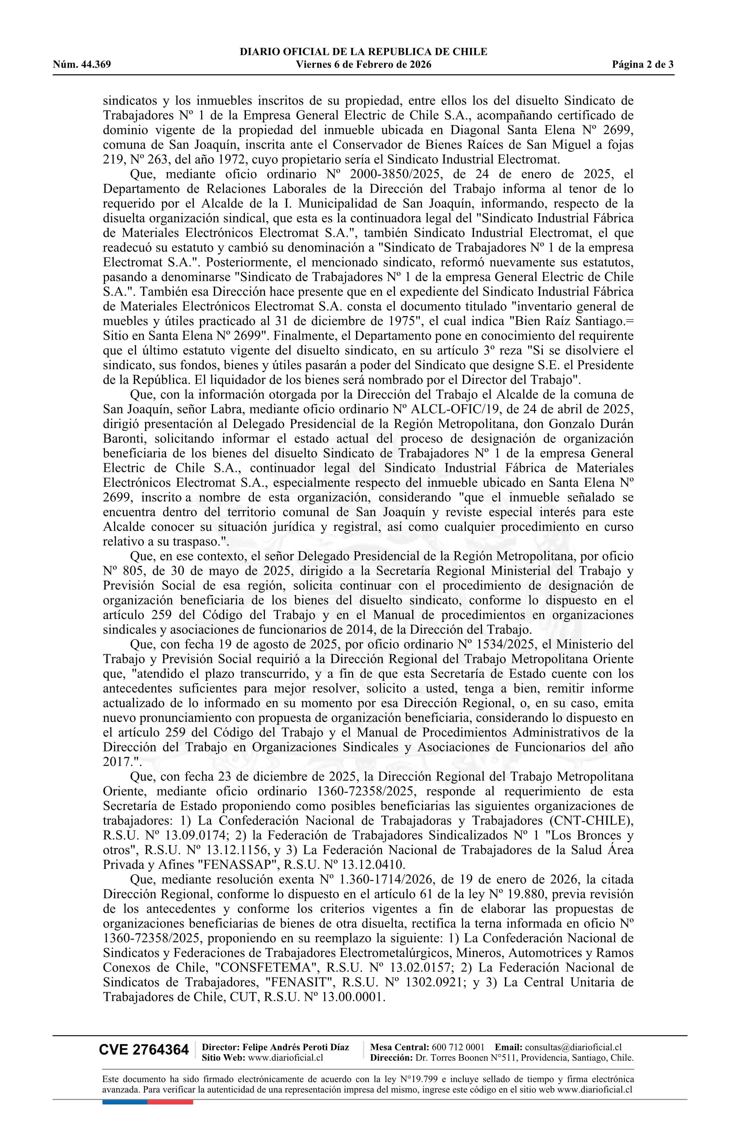 Título: Decreto exento número 12, de 2026.- Designa organización sindical beneficiaria de los bienes pertenecientes al sindicato disuelto que indica