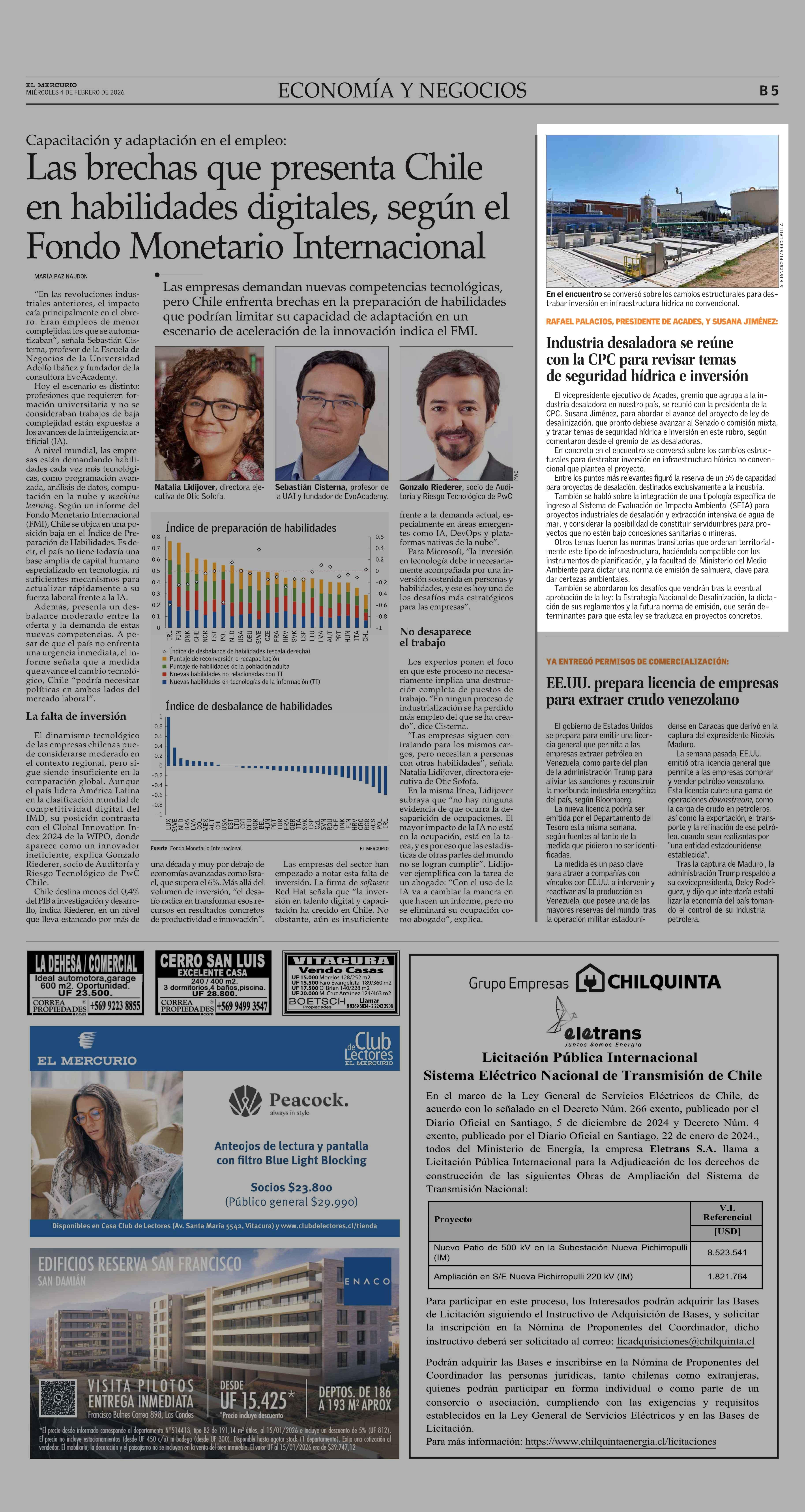 Industria desaladora se reúne con la CPC para revisar temas de seguridad hídrica e inversión 04-02-2026 El Mercurio |