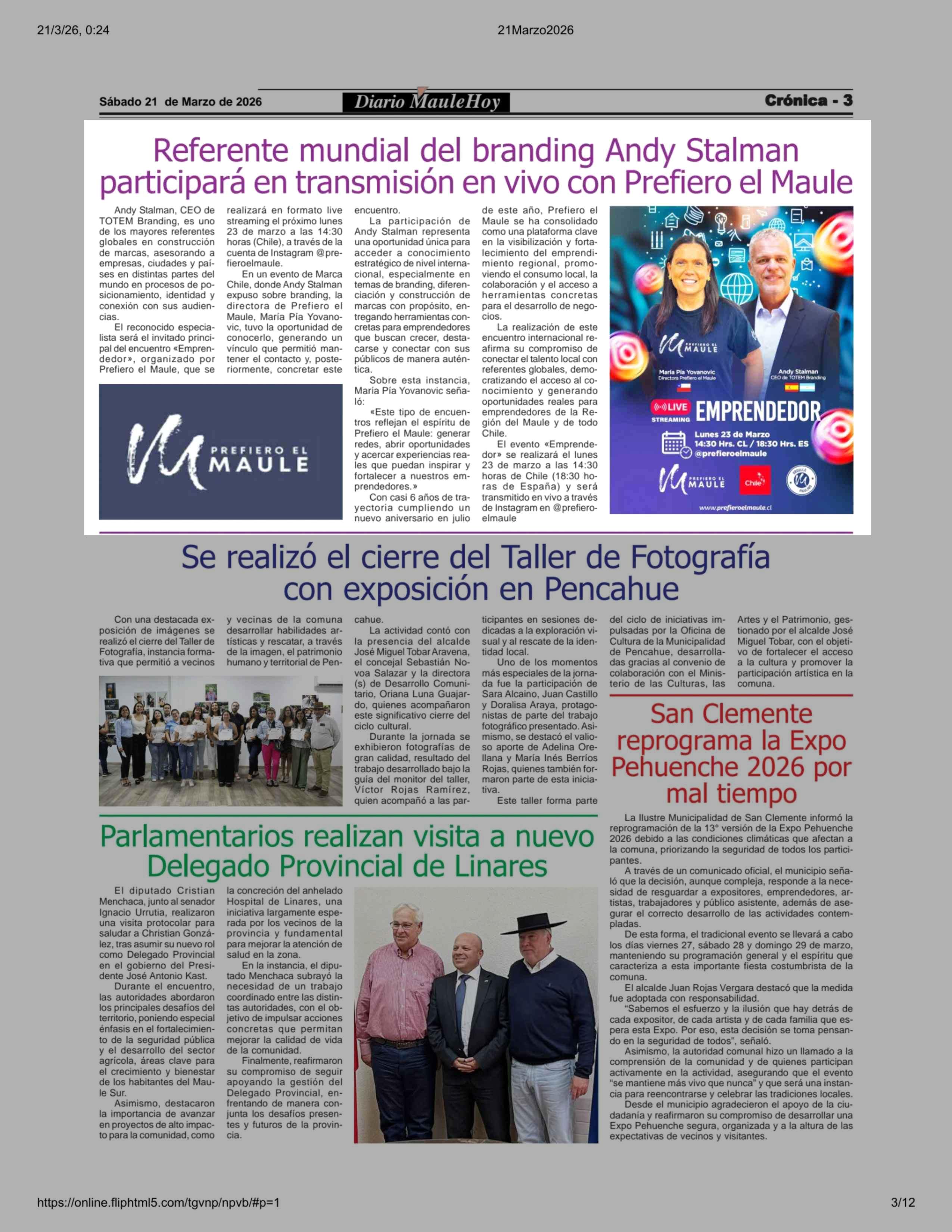 Referente mundial del branding Andy Stalman participará en transmisión en vivo con Prefiero el Maule 21-03-2026 Maule Hoy |