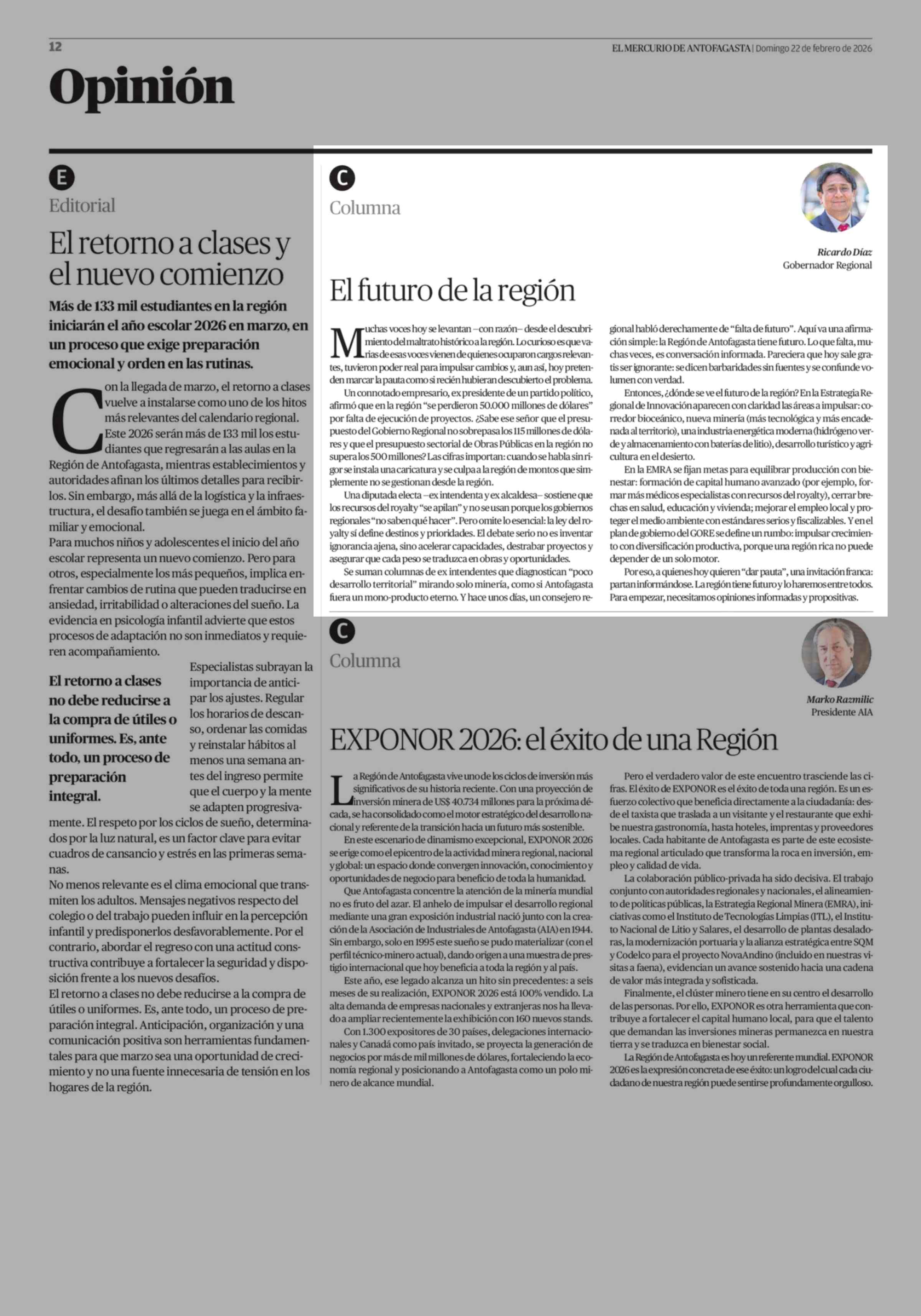 Columnas de Opinión: El futuro de la región 22-02-2026 El Mercurio de Antofagasta |