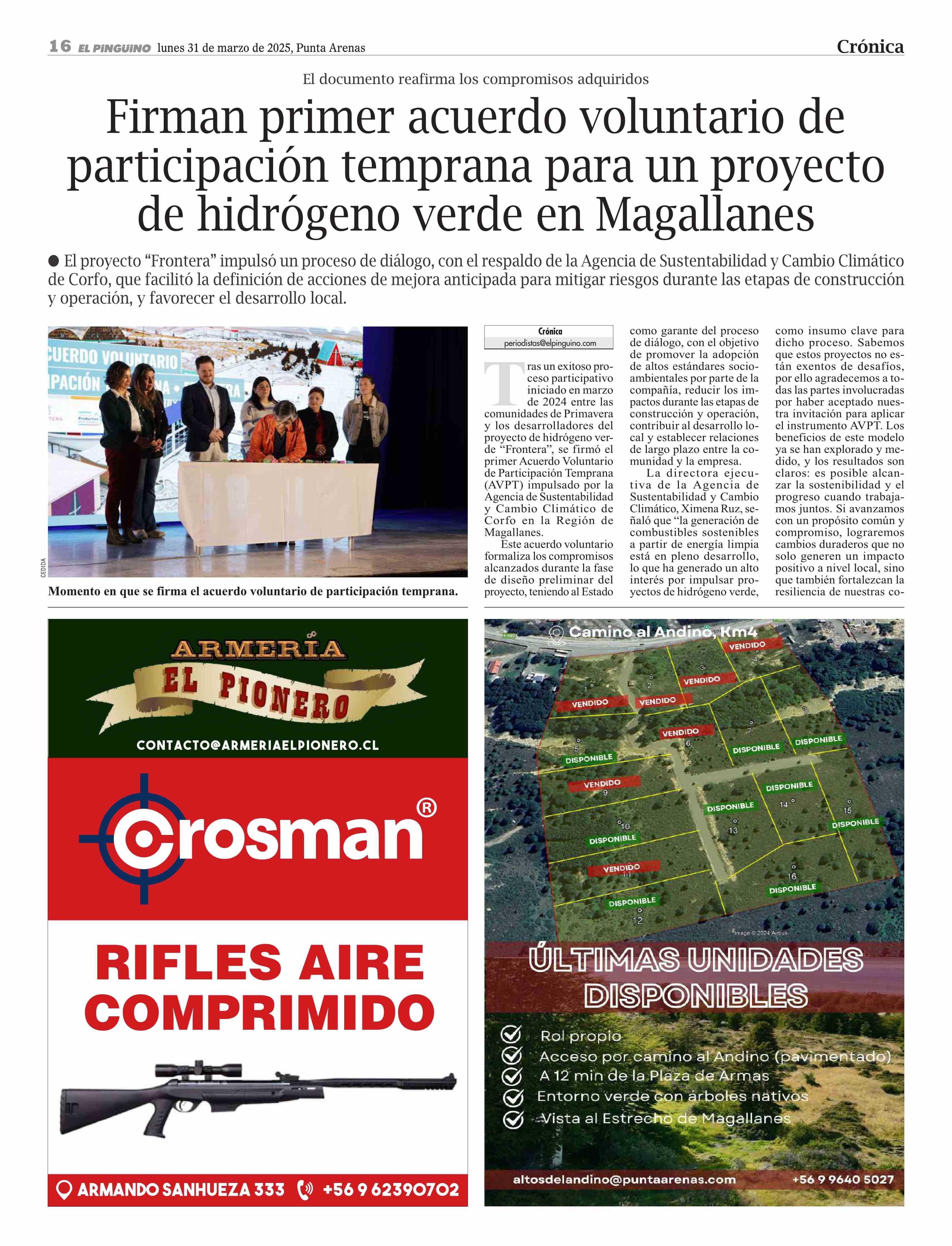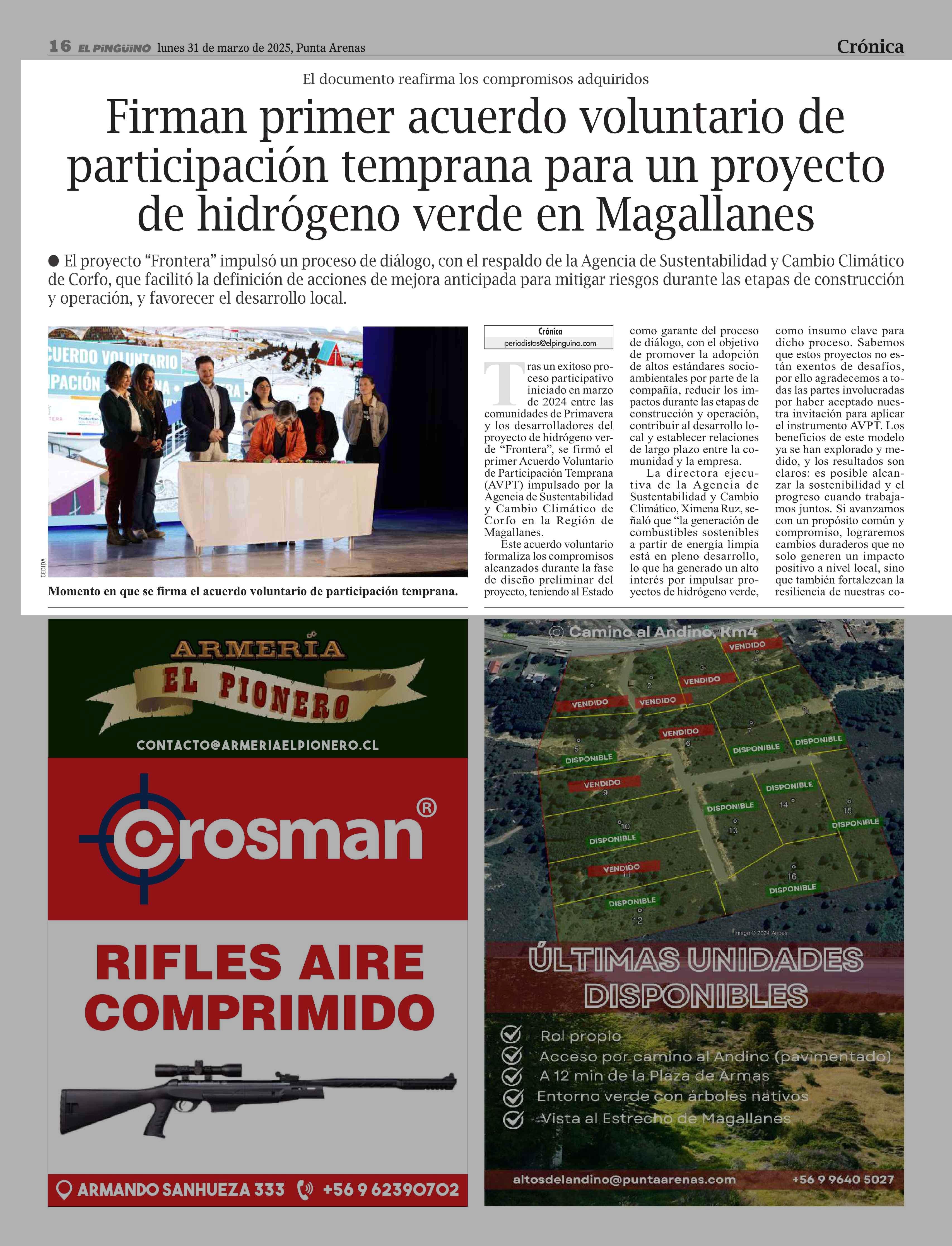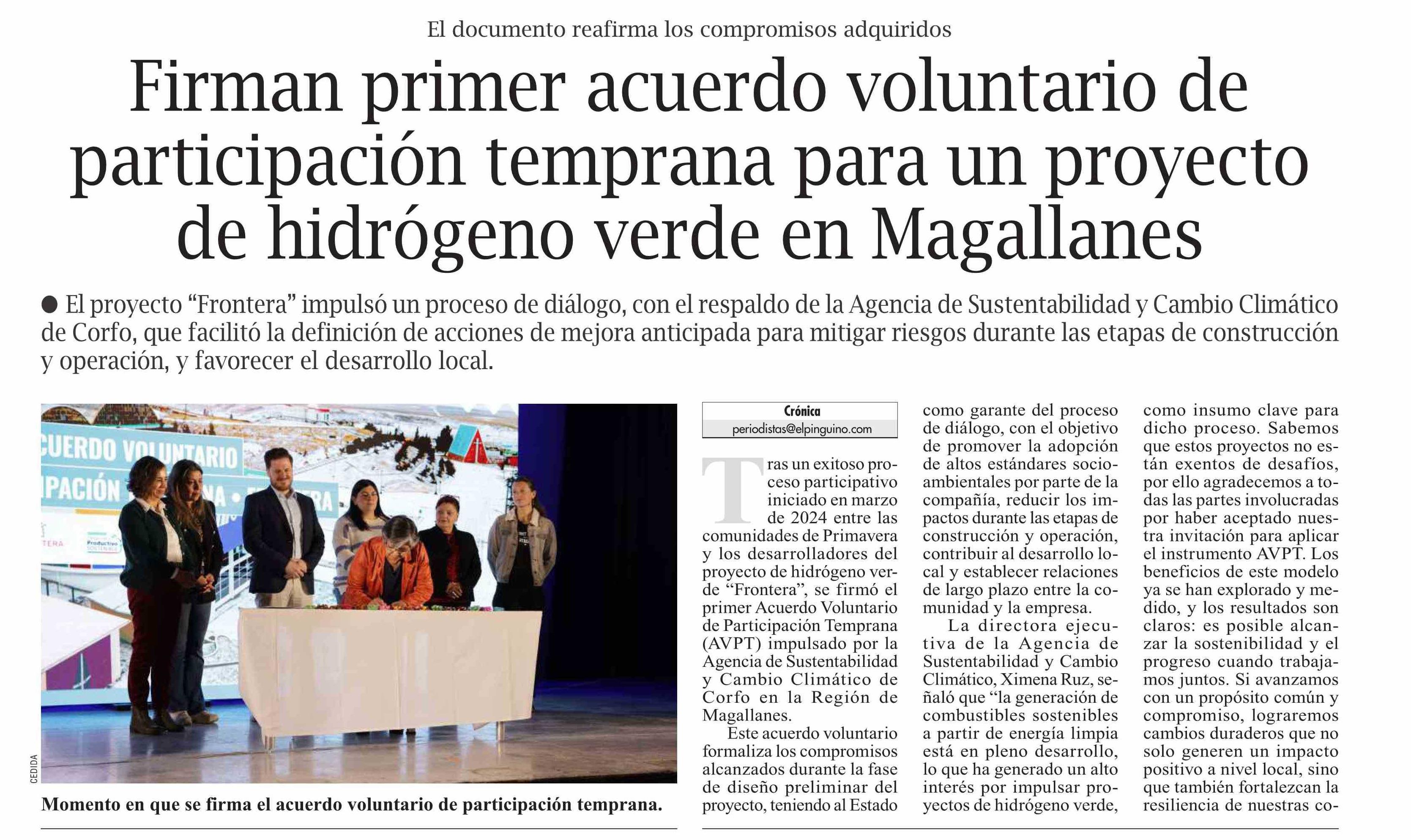 Firman primer acuerdo voluntario de participación temprana para un proyecto de hidrógeno verde en Magallanes 31-03-2025 El Pingüino |