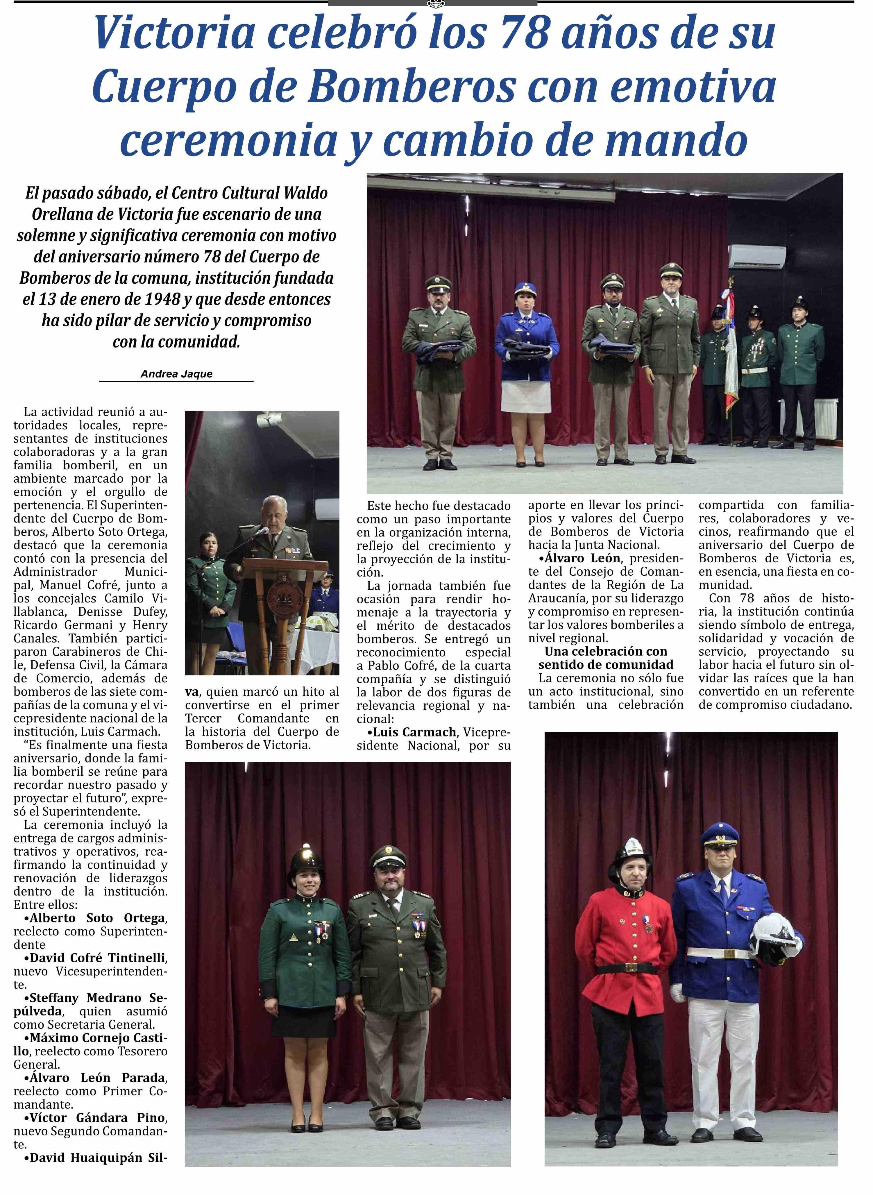 Victoria celebró los 78 años de su Cuerpo de Bomberos con emotiva ceremonia y cambio de mando 13-01-2026 Las Noticias |