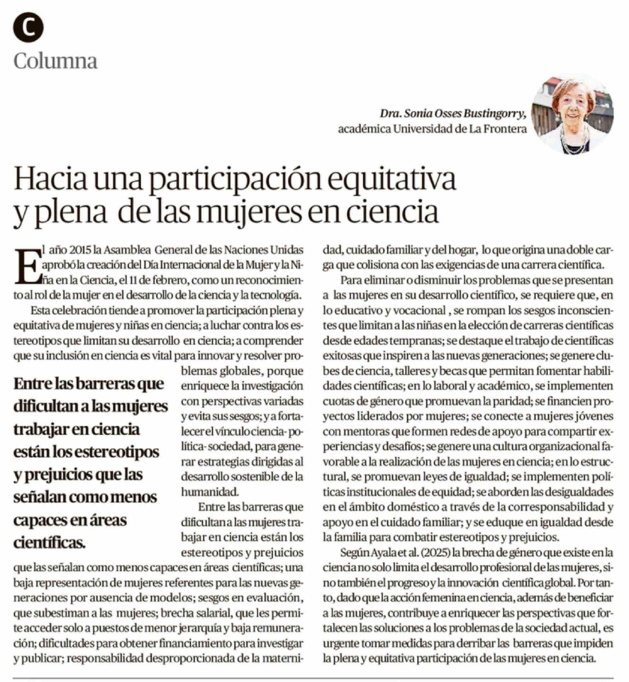 Columnas de Opinión: Hacia una participación equitativa y plena de las mujeres en ciencia