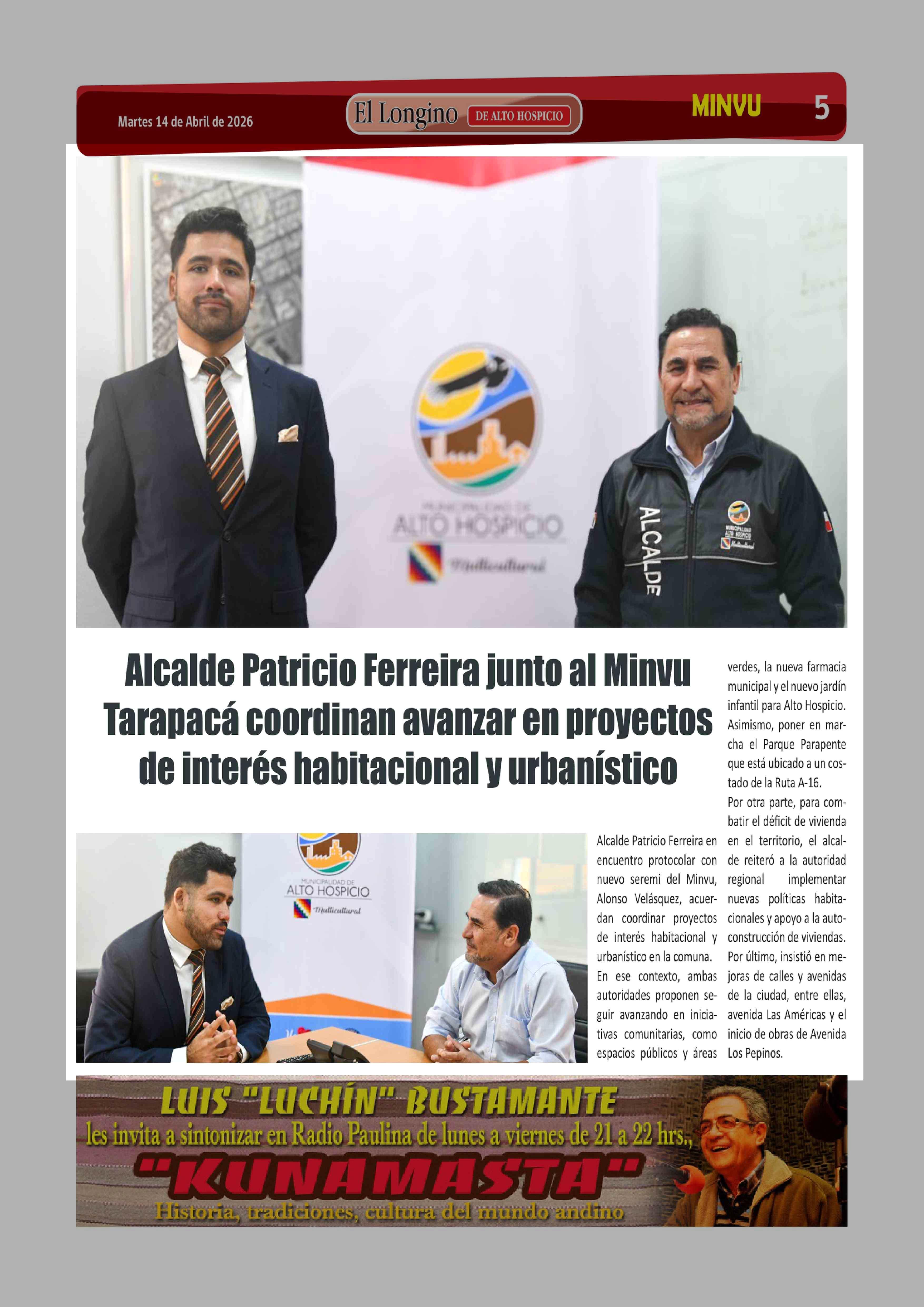 Alcalde Patricio Ferreira junto al Minvu Tarapacá coordinan avanzar en proyectos de interés habitacional y urbanístico 14-04-2026 El Longino |