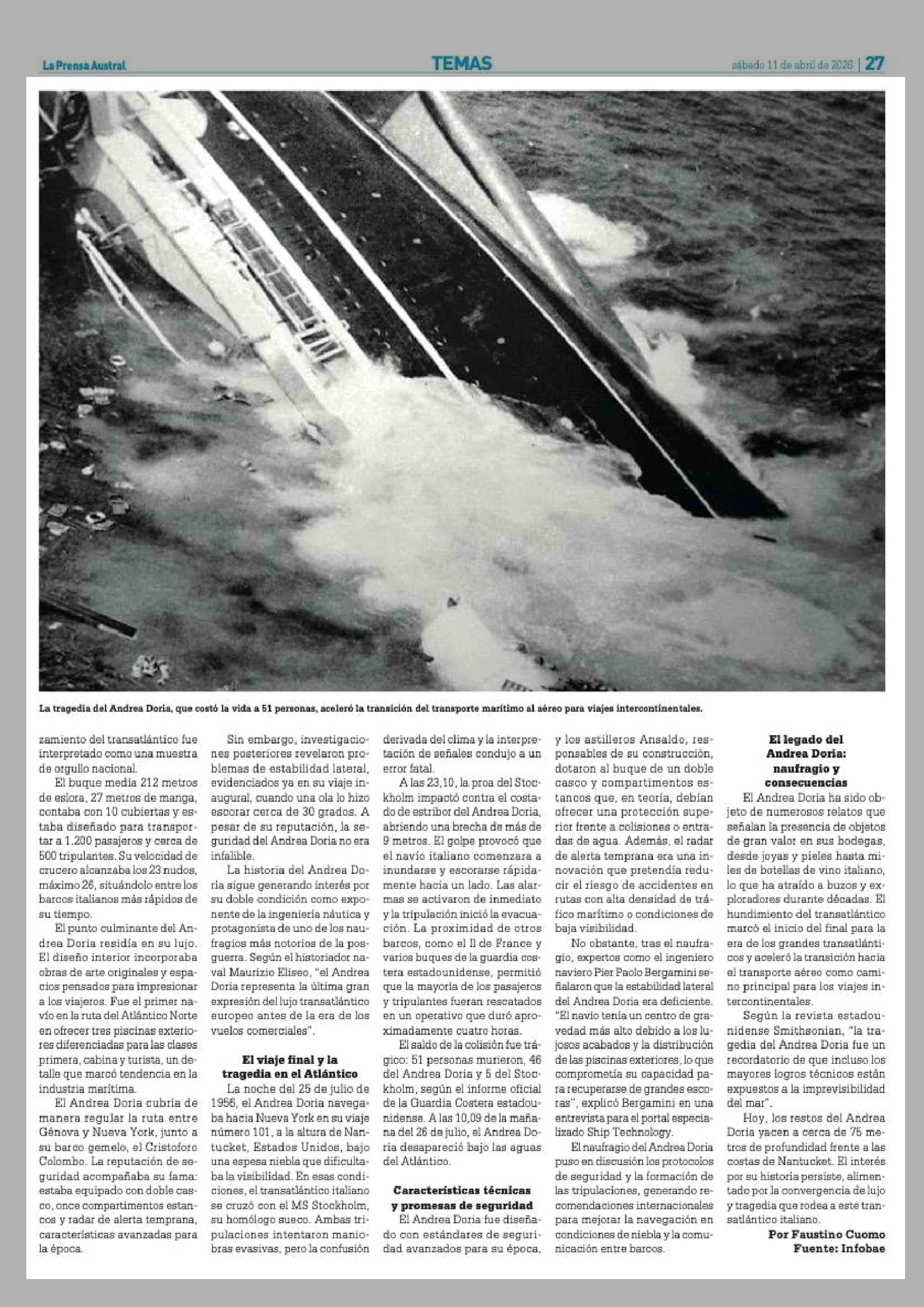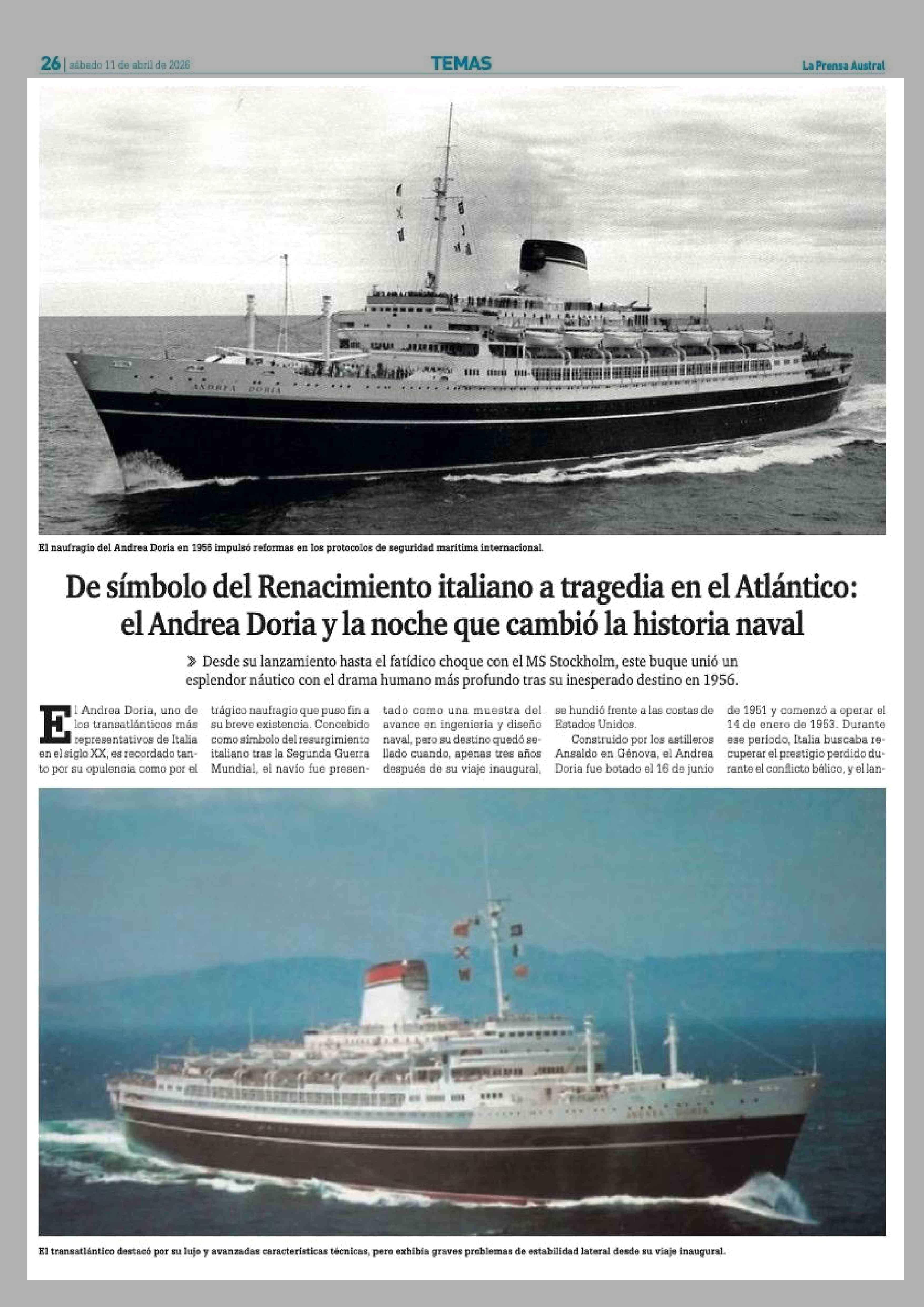 De símbolo del Renacimiento italiano a tragedia en el Atlántico: el Andrea Doria y la noche que cambió la historia naval 11-04-2026 La Prensa Austral |