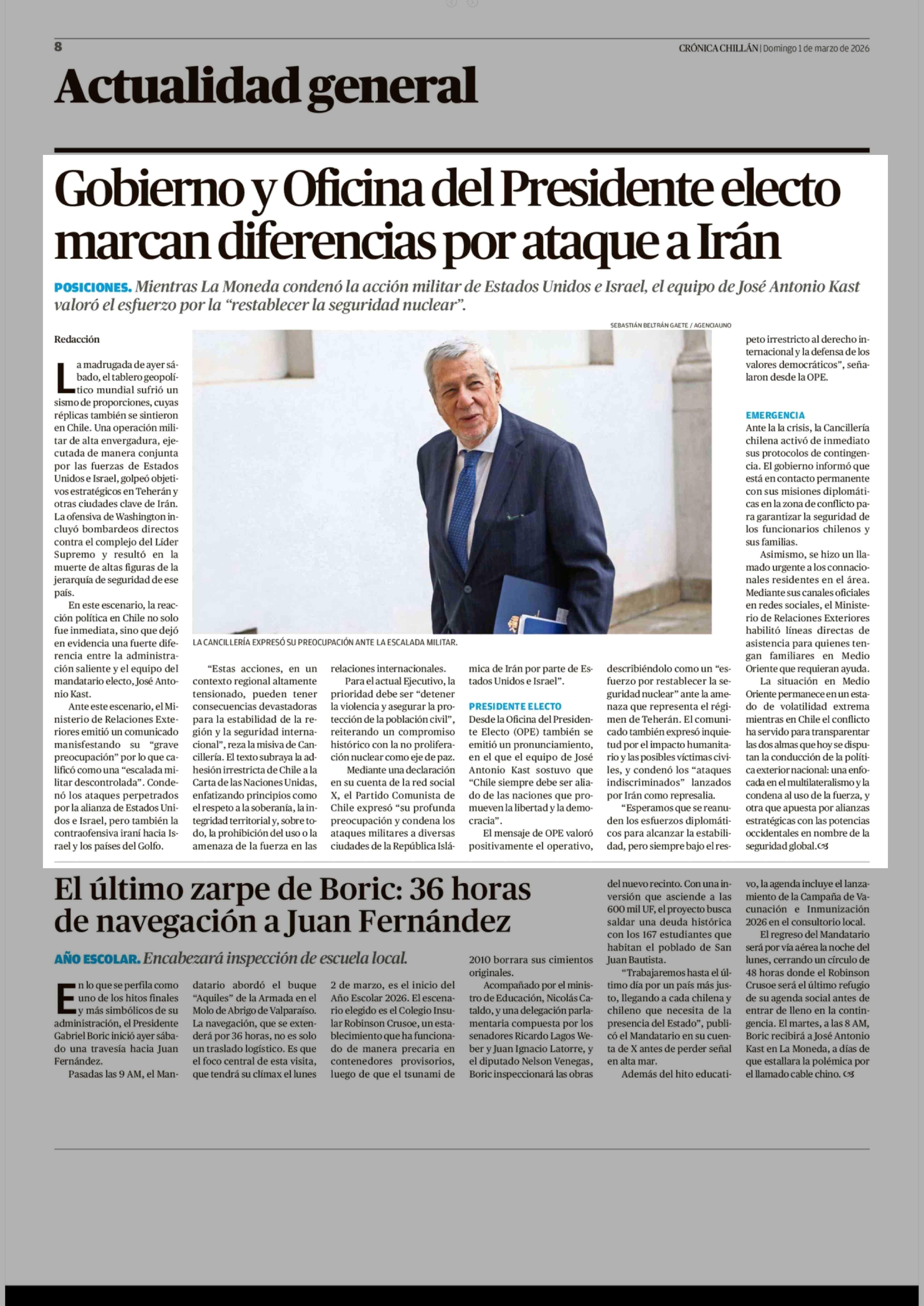 Gobierno y Oficina del Presidente electo marcan diferencias por ataque a Iran 01-03-2026 Crónica de Chillán |