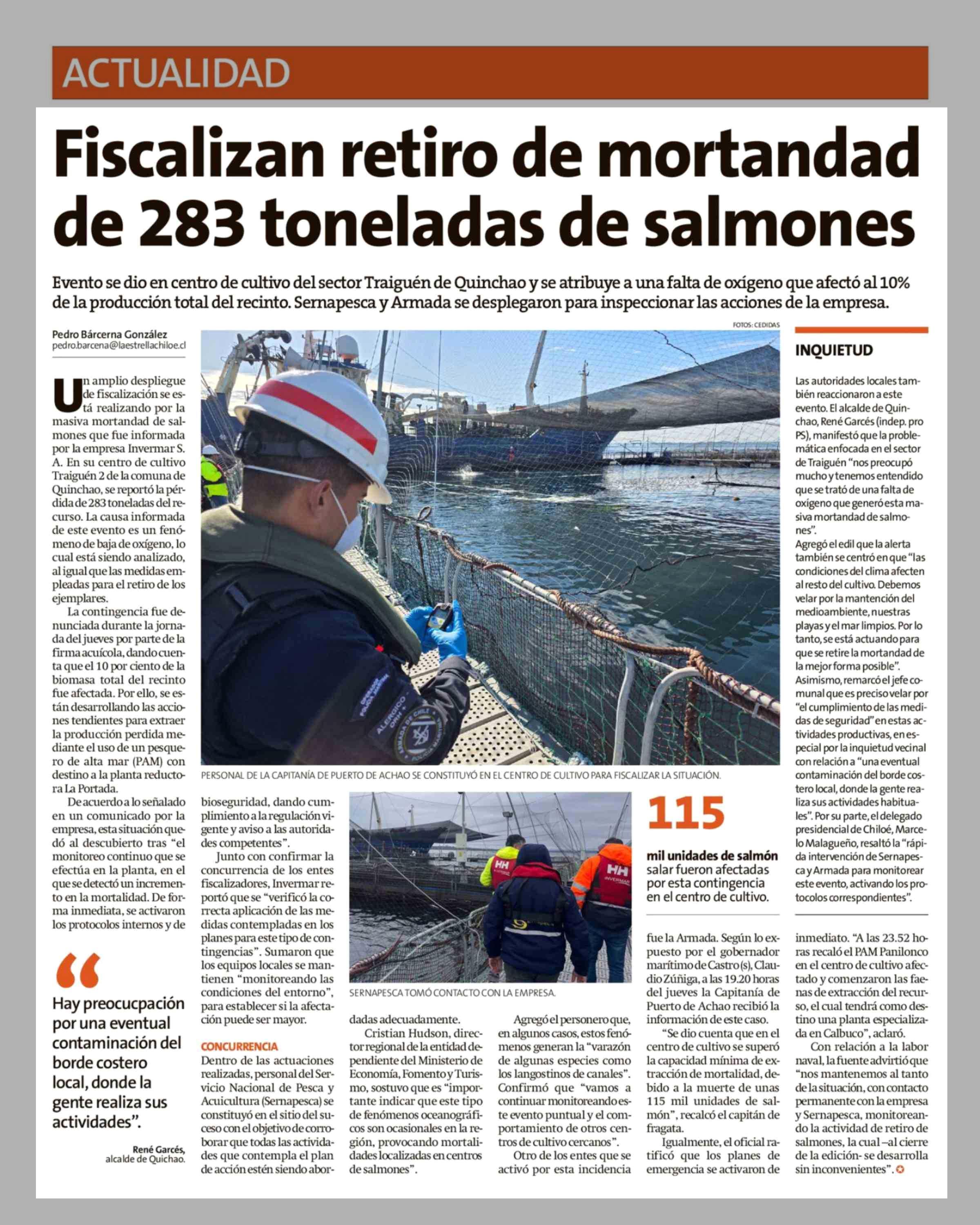 Fiscalizan retiro de mortandad de 283 toneladas de salmones 14-02-2026 La Estrella de Chiloé |