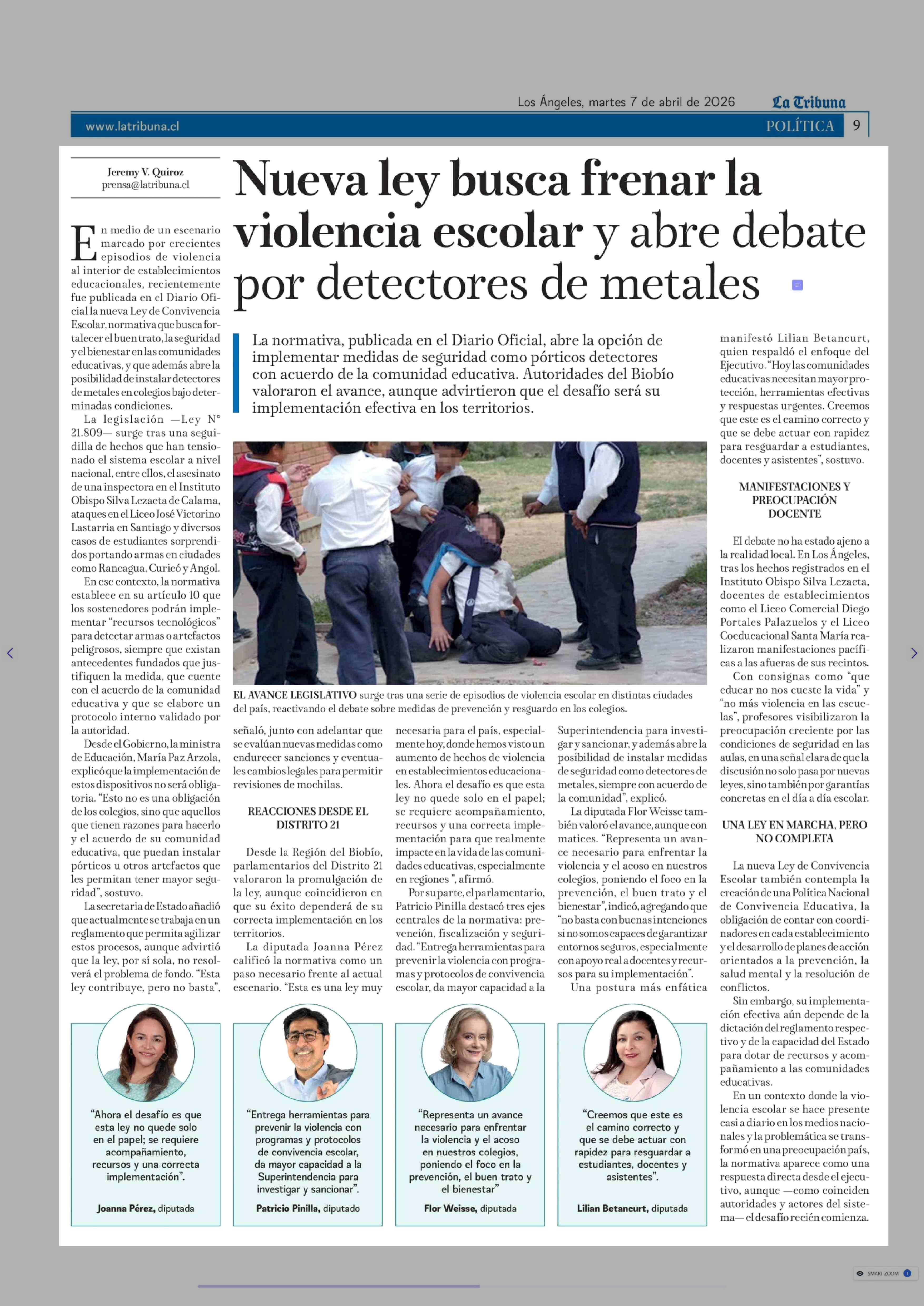 Nueva ley busca frenar la violencia escolar y abre debate por detectores de metales 07-04-2026 La Tribuna |