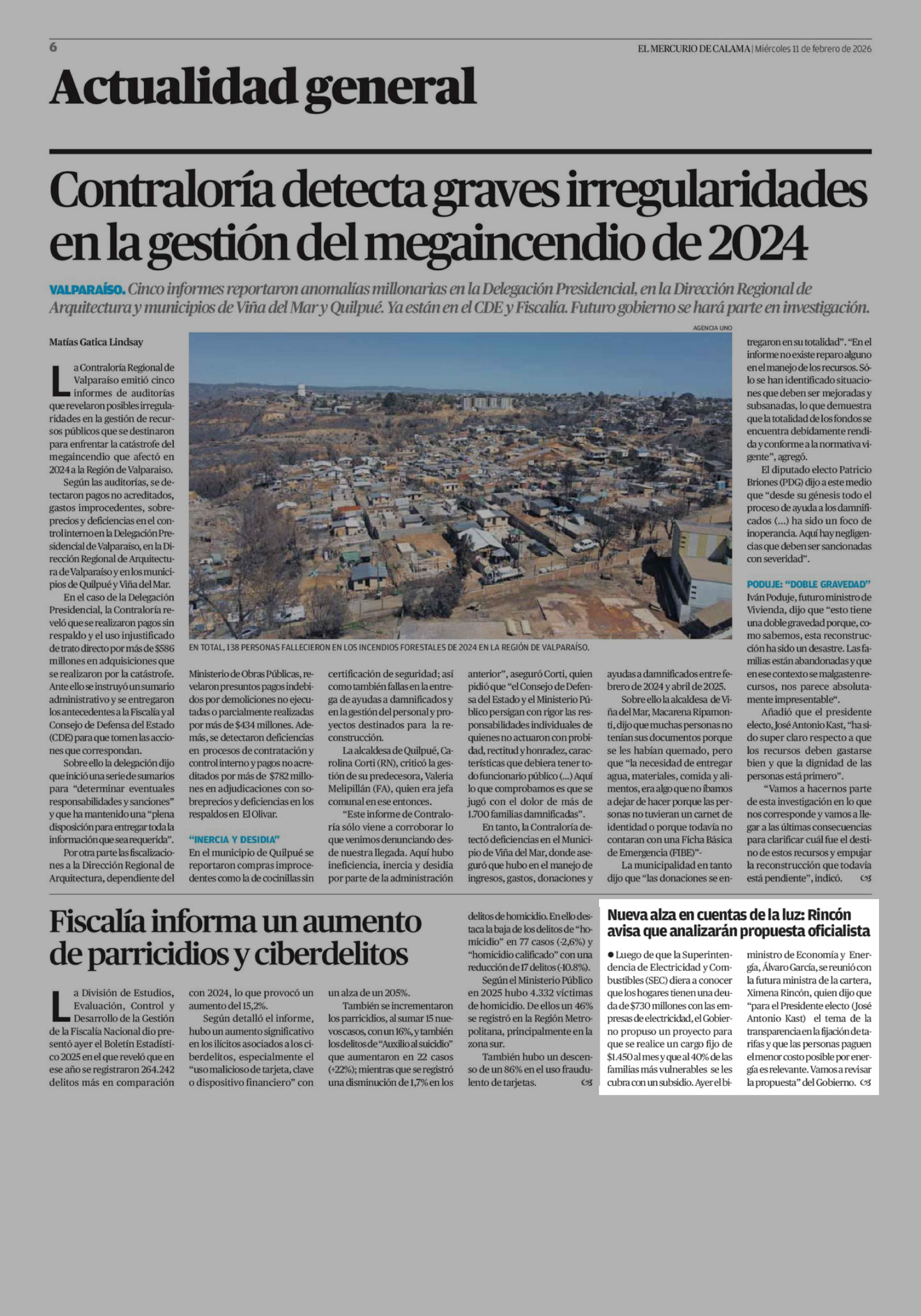 Nueva alza en cuentas de la luz: Rincón avisa que analizarán propuesta oficialista 11-02-2026 El Mercurio de Calama |