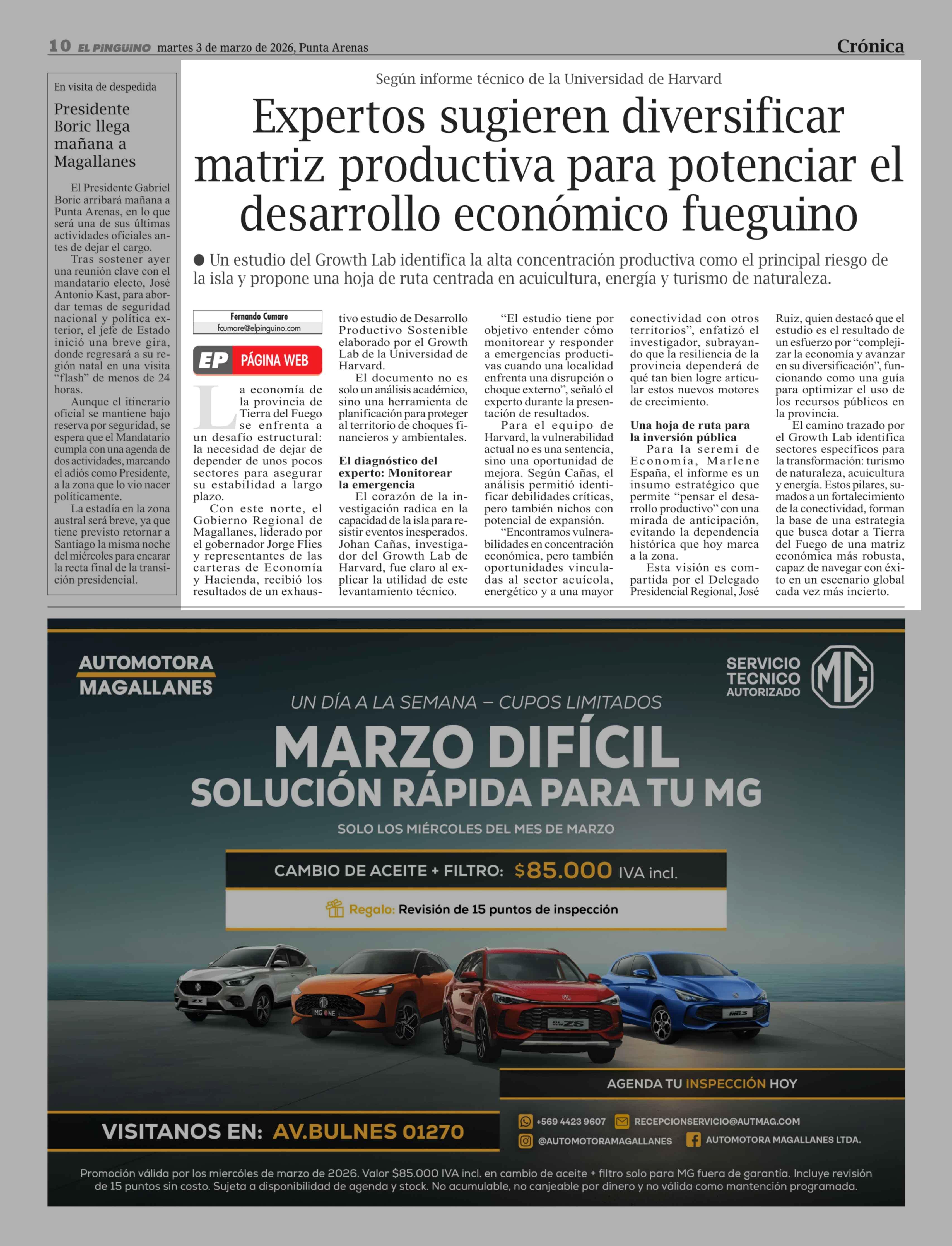 Expertos sugieren diversificar matriz productiva para potenciar el desarrollo económico fueguino 03-03-2026 El Pingüino |