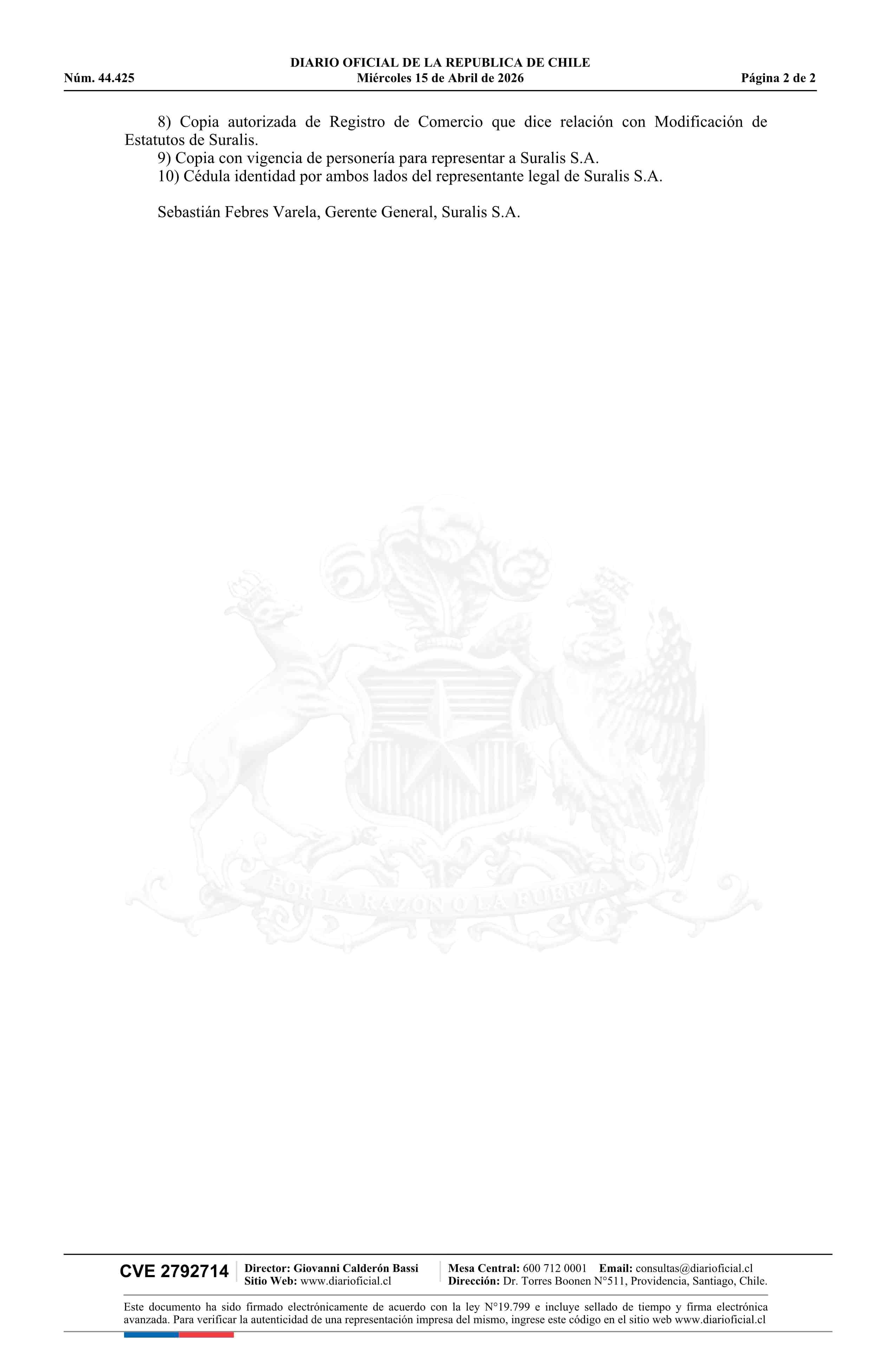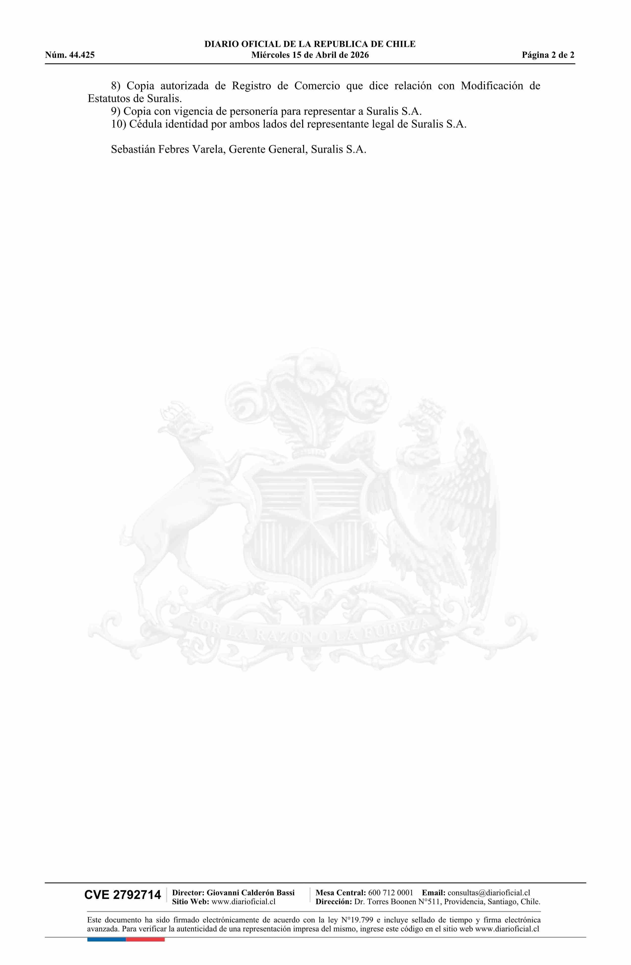 Solicitud Suralis S.A. 15-04-2026 Diario Oficial Edición Electrónica |