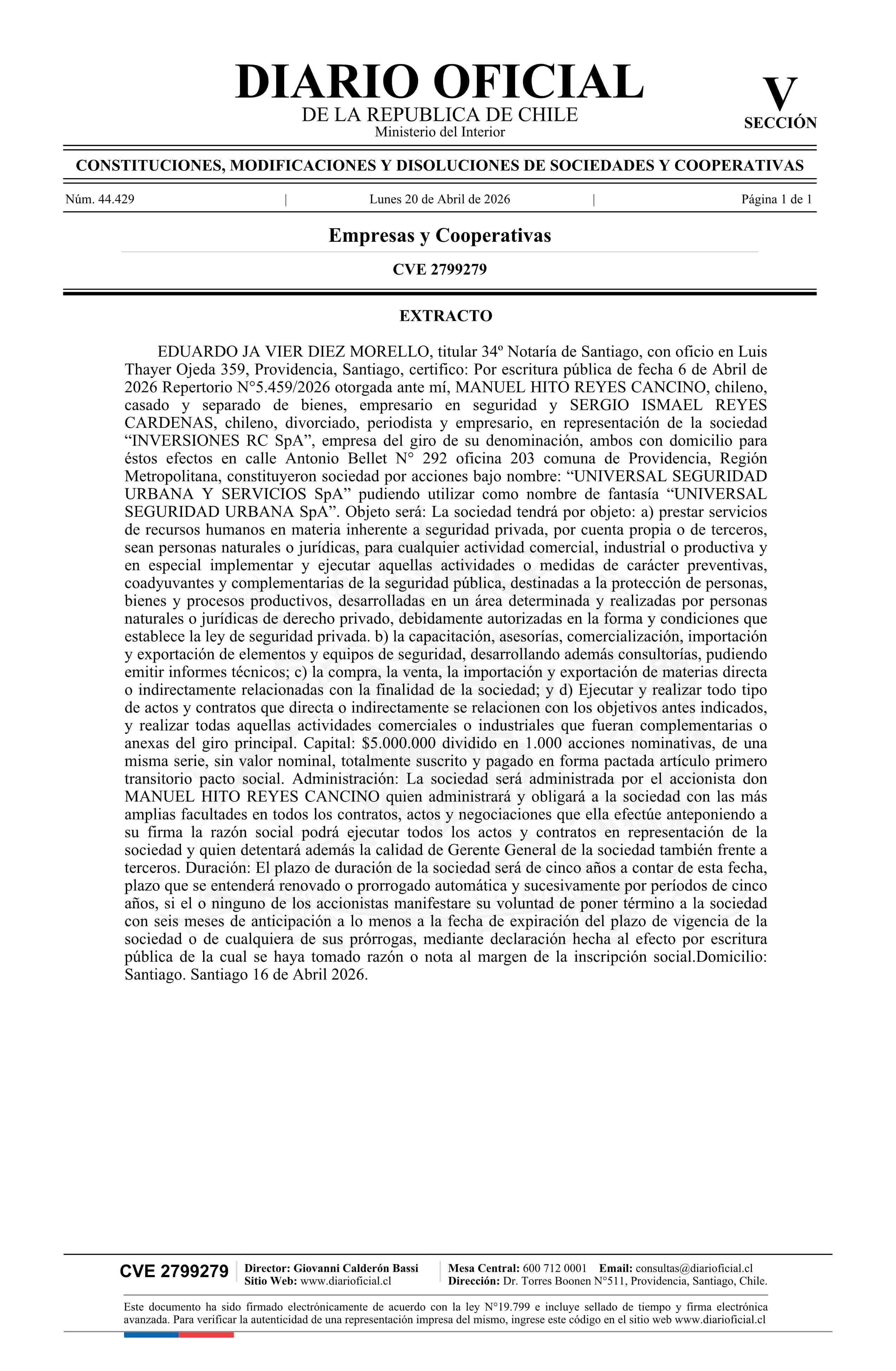 UNIVERSAL SEGURIDAD URBANA Y SERVICIOS SpA 20-04-2026 Diario Oficial Edición Electrónica |