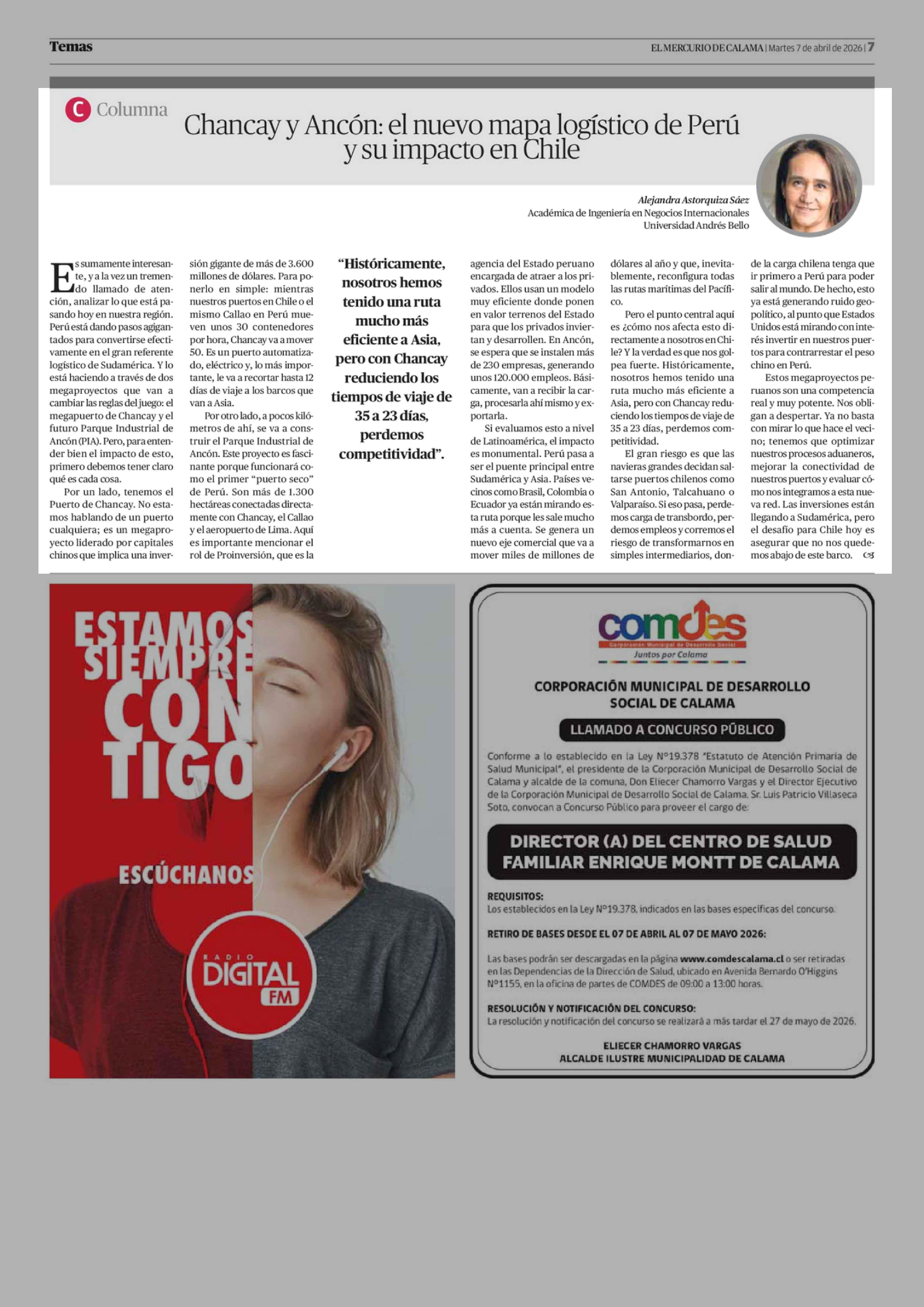 Columnas de Opinión: Chancay y Ancón: el nuevo mapa logístico de Perú y su impacto en Chile 07-04-2026 El Mercurio de Calama |