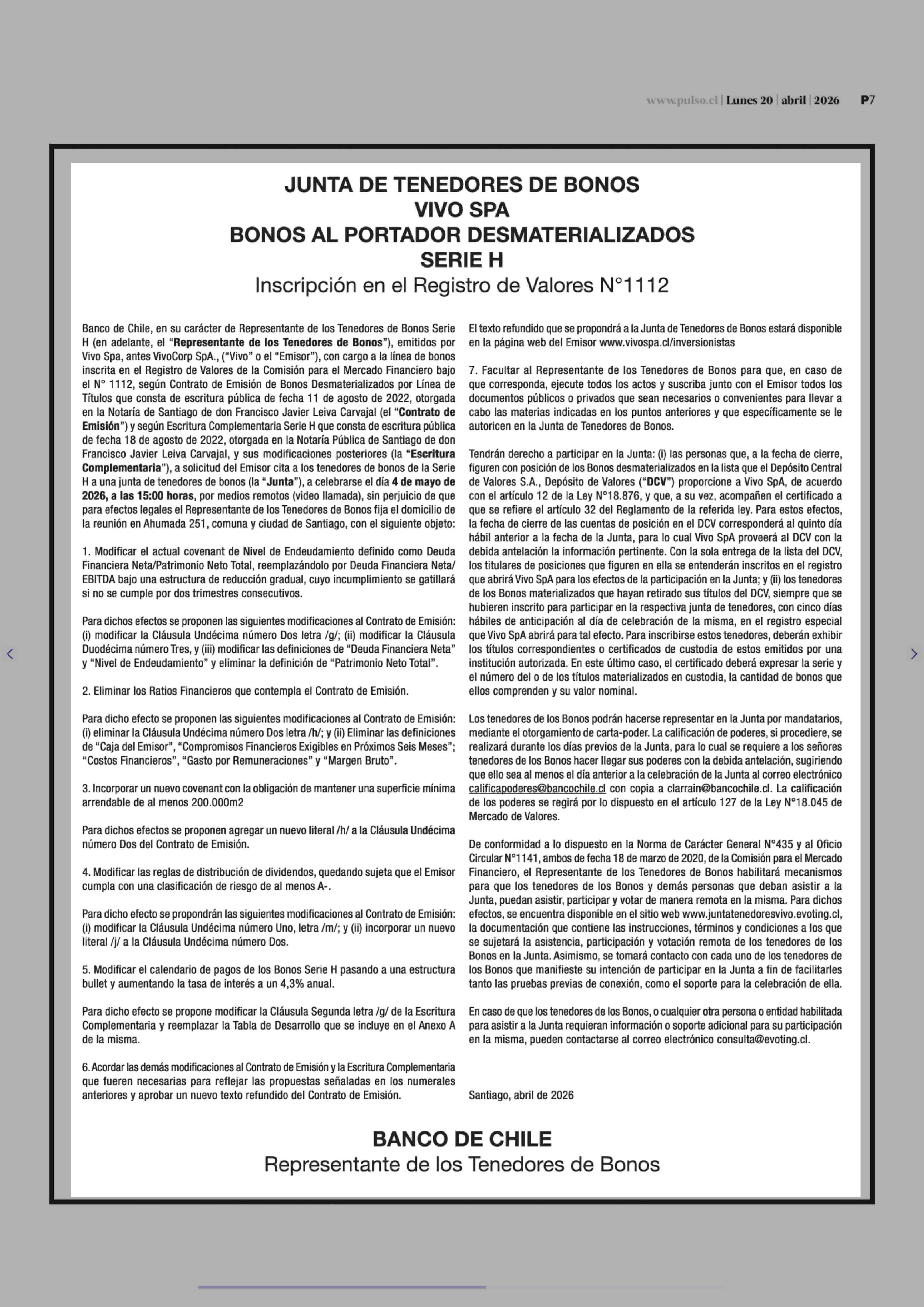 Extractos: JUNTA DE TENEDORES DE BONOS VIVO SPA BONOS AL PORTADOR DESMATERIALIZADOS SERIE H Inscripción en el Registro de Valores Nº1112