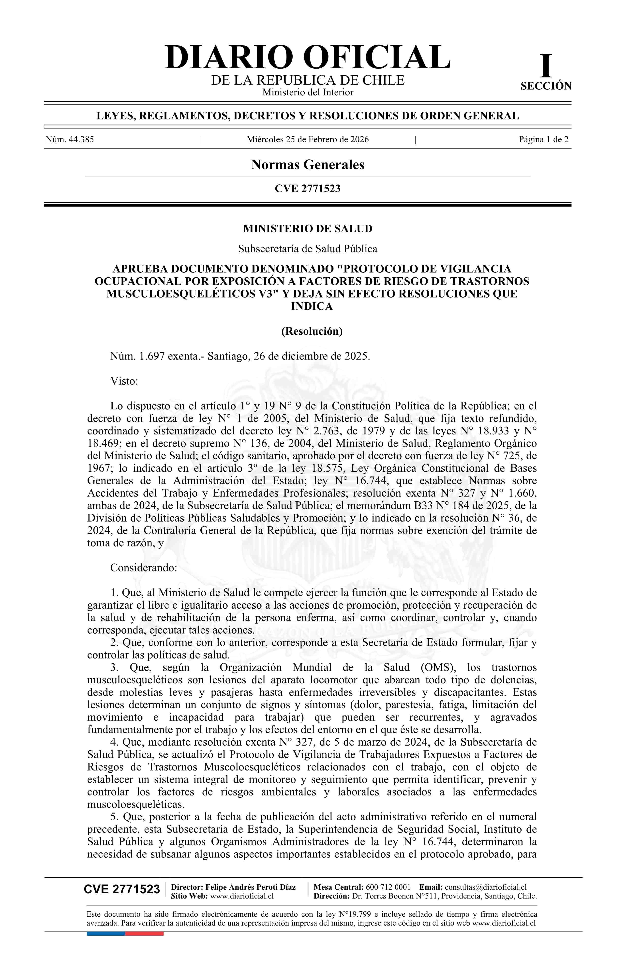 Título: Resolución exenta número 1.697, de 2025.- Aprueba documento denominado Protocolo de Vigilancia Ocupacional por Exposición a Factores de Riesgo de Trastornos Musculoesqueléticos V3 y deja sin efecto resoluciones que indica