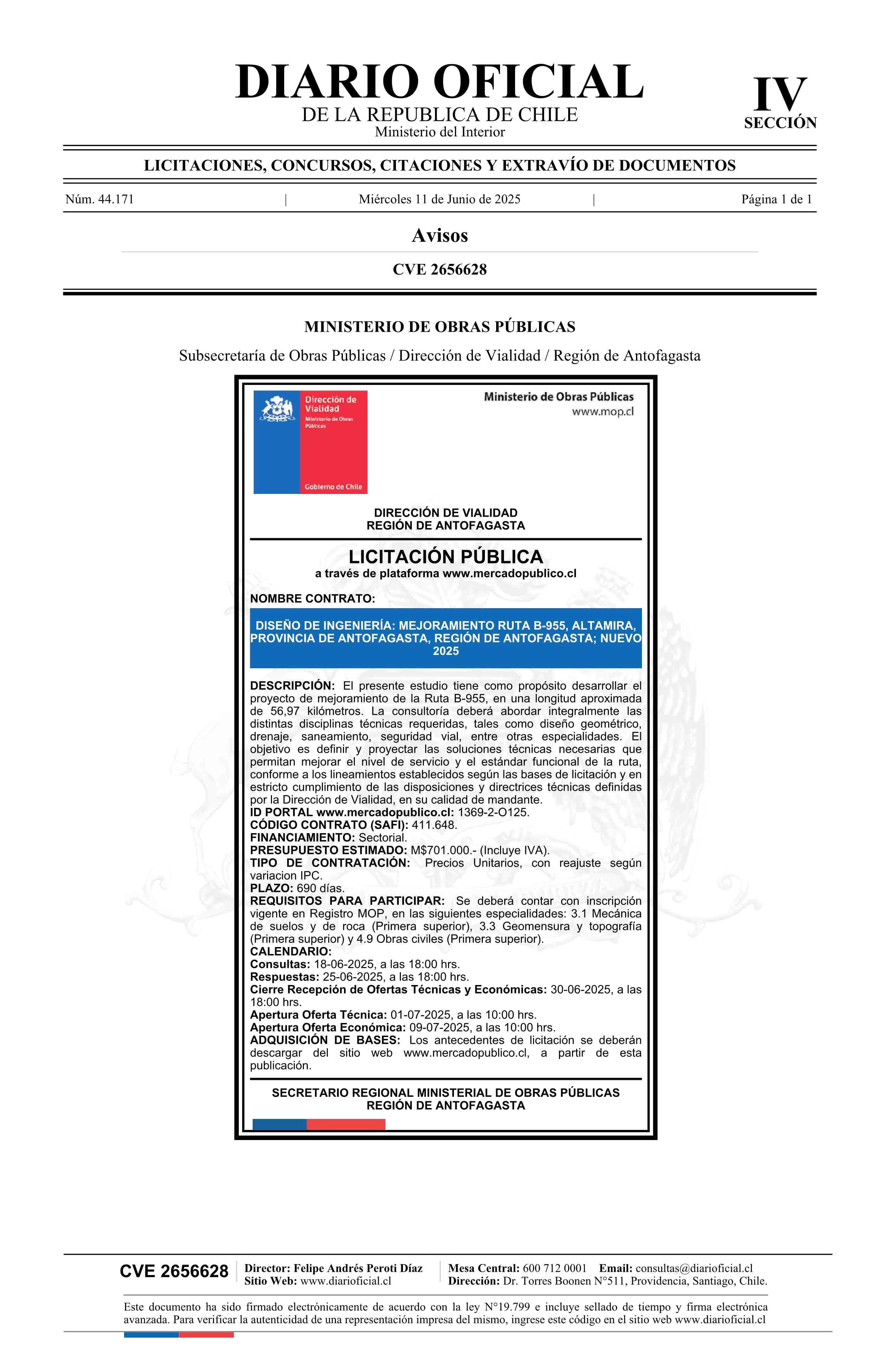 AVISO LICITACIONES: Diseño de Ingeniería: Mejoramiento Ruta B-955, Altamira, Provincia de Antofagasta, Región de Antofagasta, Nuevo 2025??????? 11-06-2025 Diario Oficial Edición Electrónica |