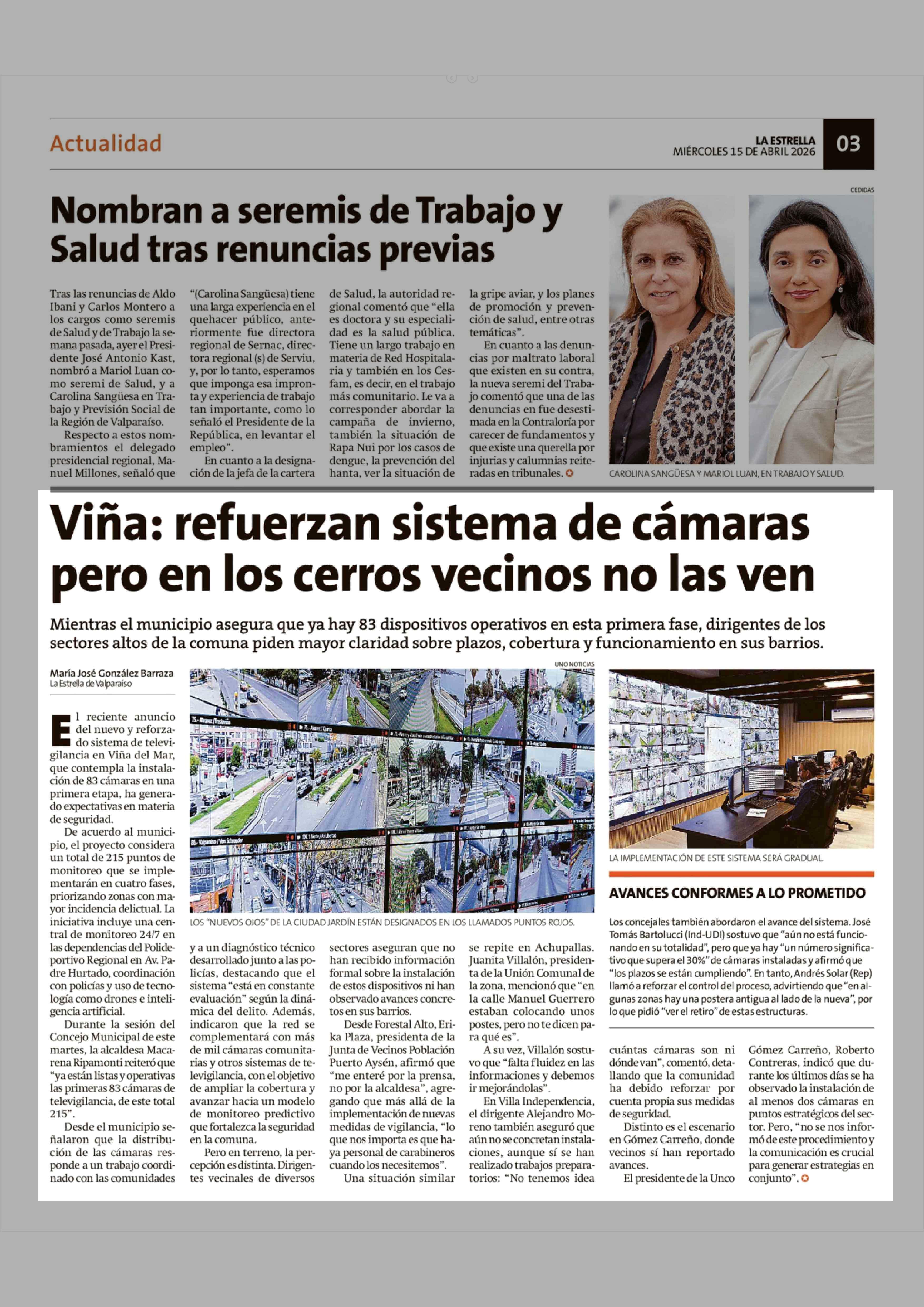 Viña: refuerzan sistema de cámaras pero en los cerros vecinos no las ven 15-04-2026 La Estrella de Valparaíso |