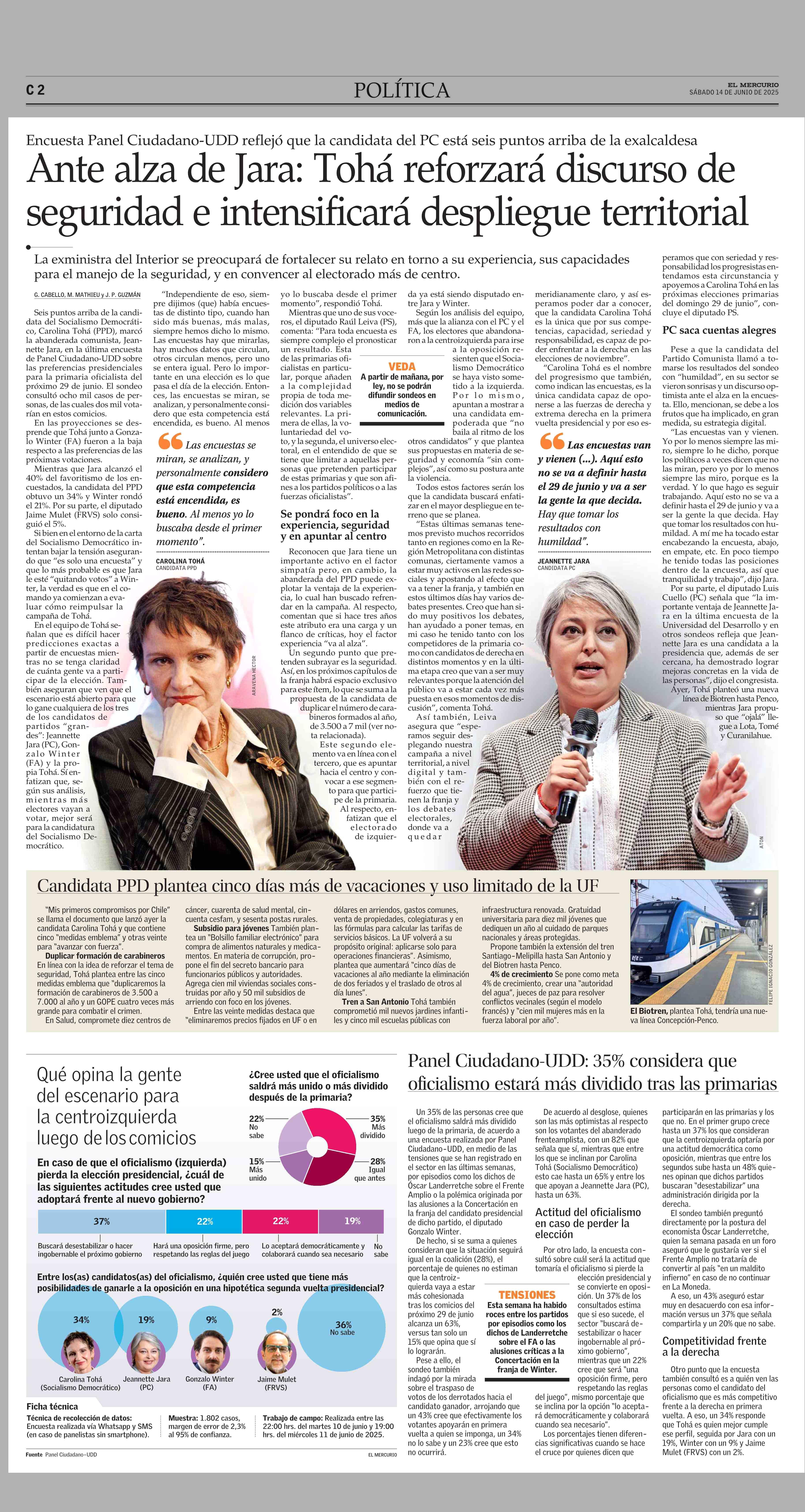 Ante alza de Jara: Tohá reforzará discurso de seguridad e intensificará despliegue territorial 14-06-2025 El Mercurio |