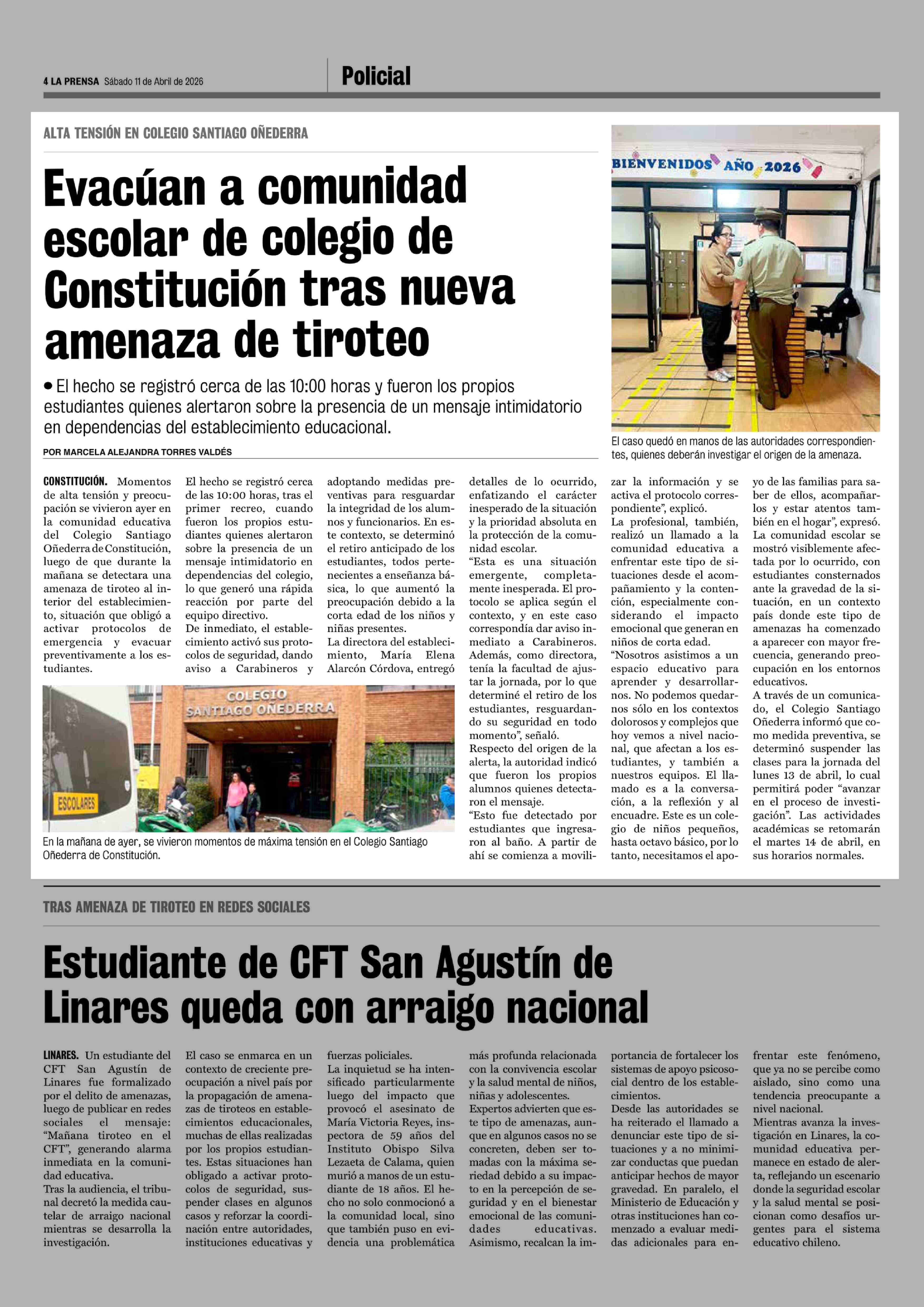 Evacúan a comunidad escolar de colegio de Constitución tras nueva amenaza de tiroteo 11-04-2026 La Prensa de Curicó |