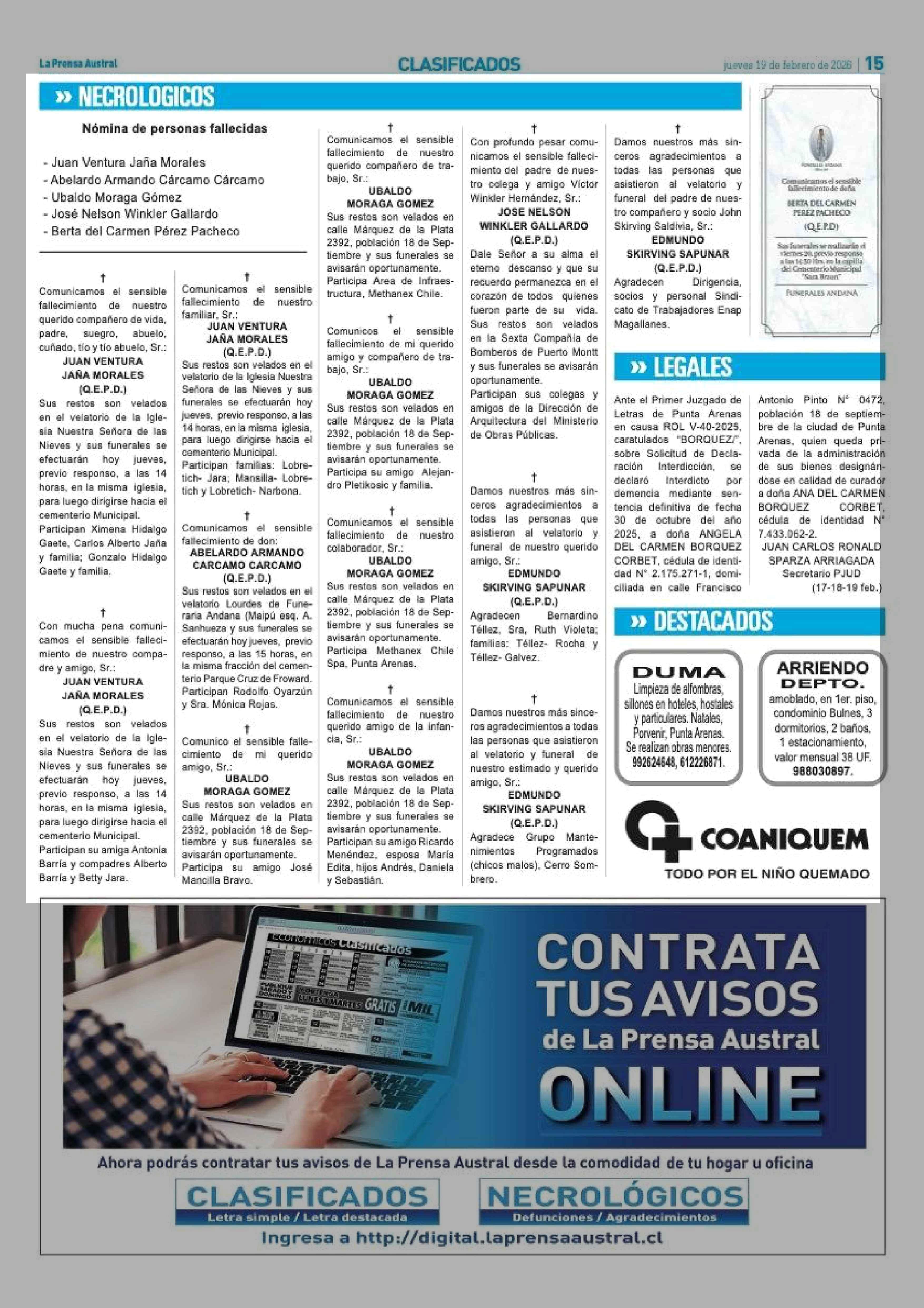 NECROLOGICOS 19-02-2026 La Prensa Austral |