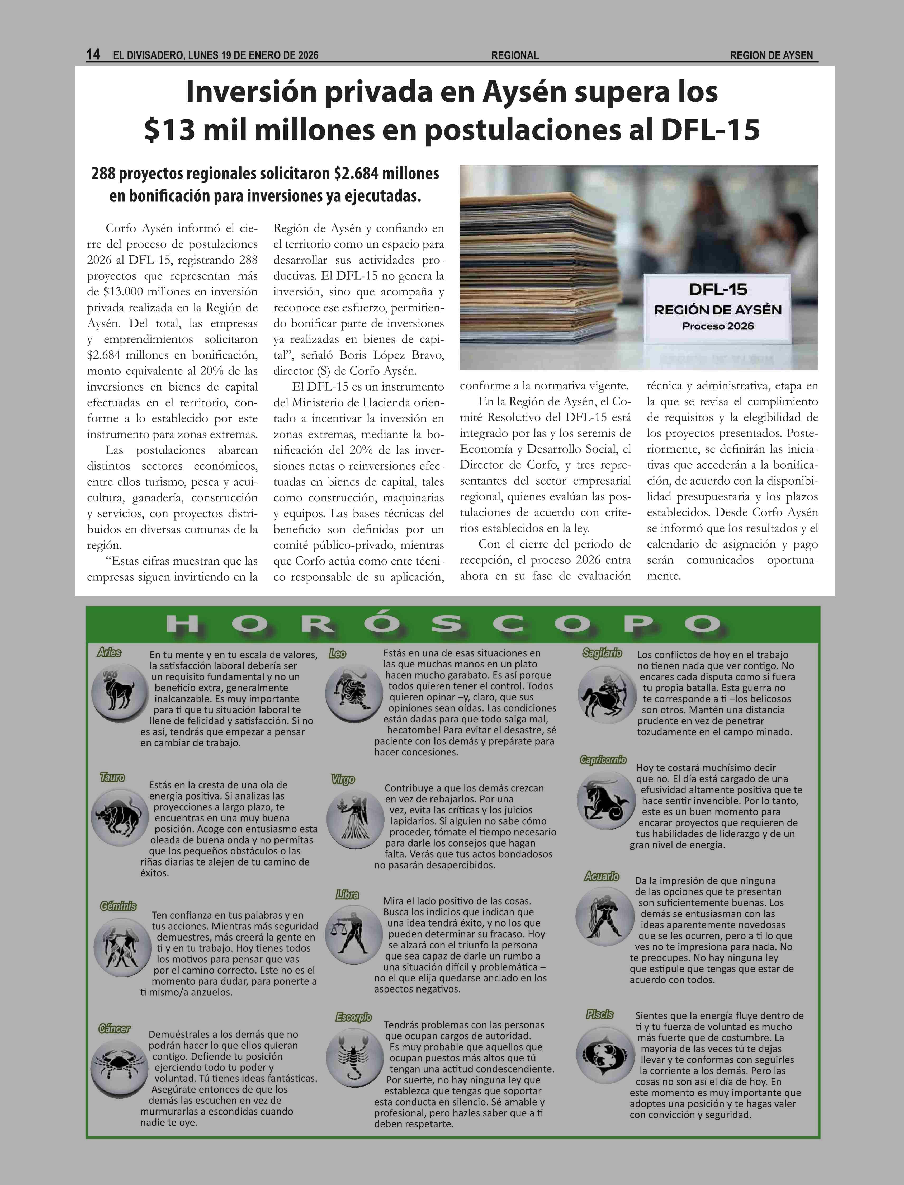 Inversión privada en Aysén supera los $13 mil millones en postulaciones al DFL-15 19-01-2026 El Divisadero |