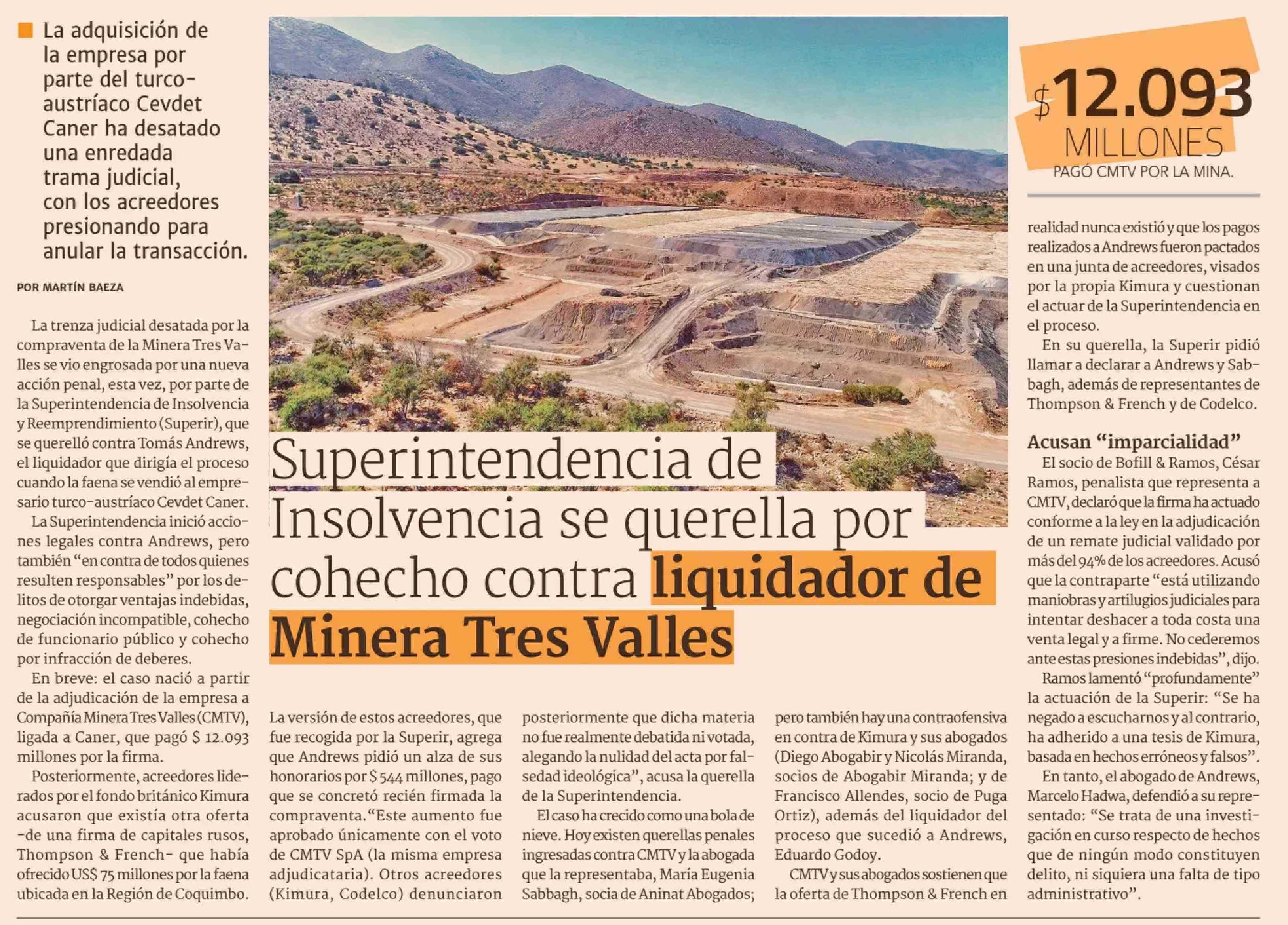 | Título: | Superintendencia de Insolvencia se querella por cohecho contra liquidador de Minera Tres Valles |