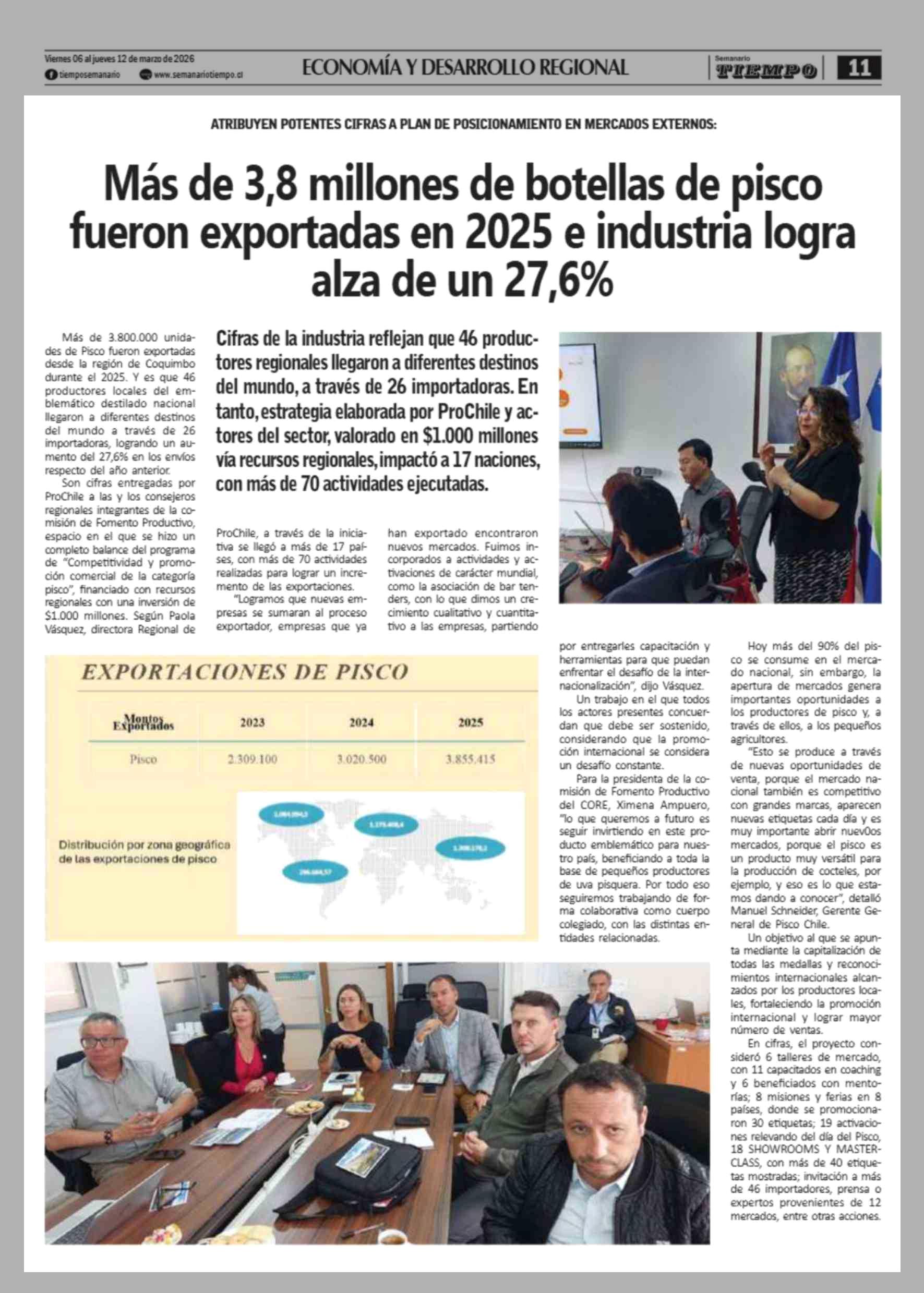 Título: Más de 3,8 millones de botellas de pisco fueron exportadas en 2025 e industria logra alza de un 27,6%