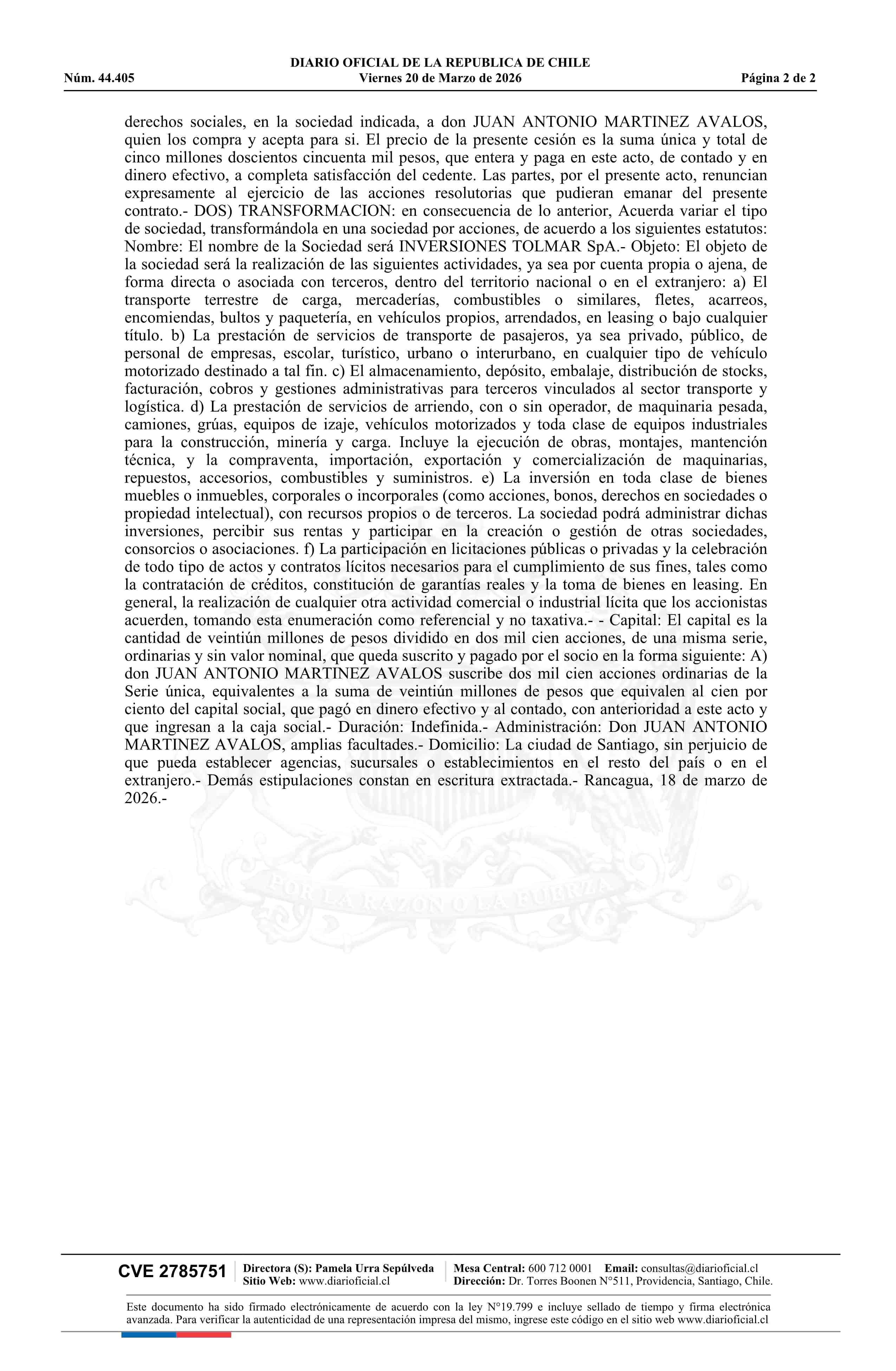 TRANSPORTES GAMAC LIMITADA 76.607.209-7* 20-03-2026 Diario Oficial Edición Electrónica |