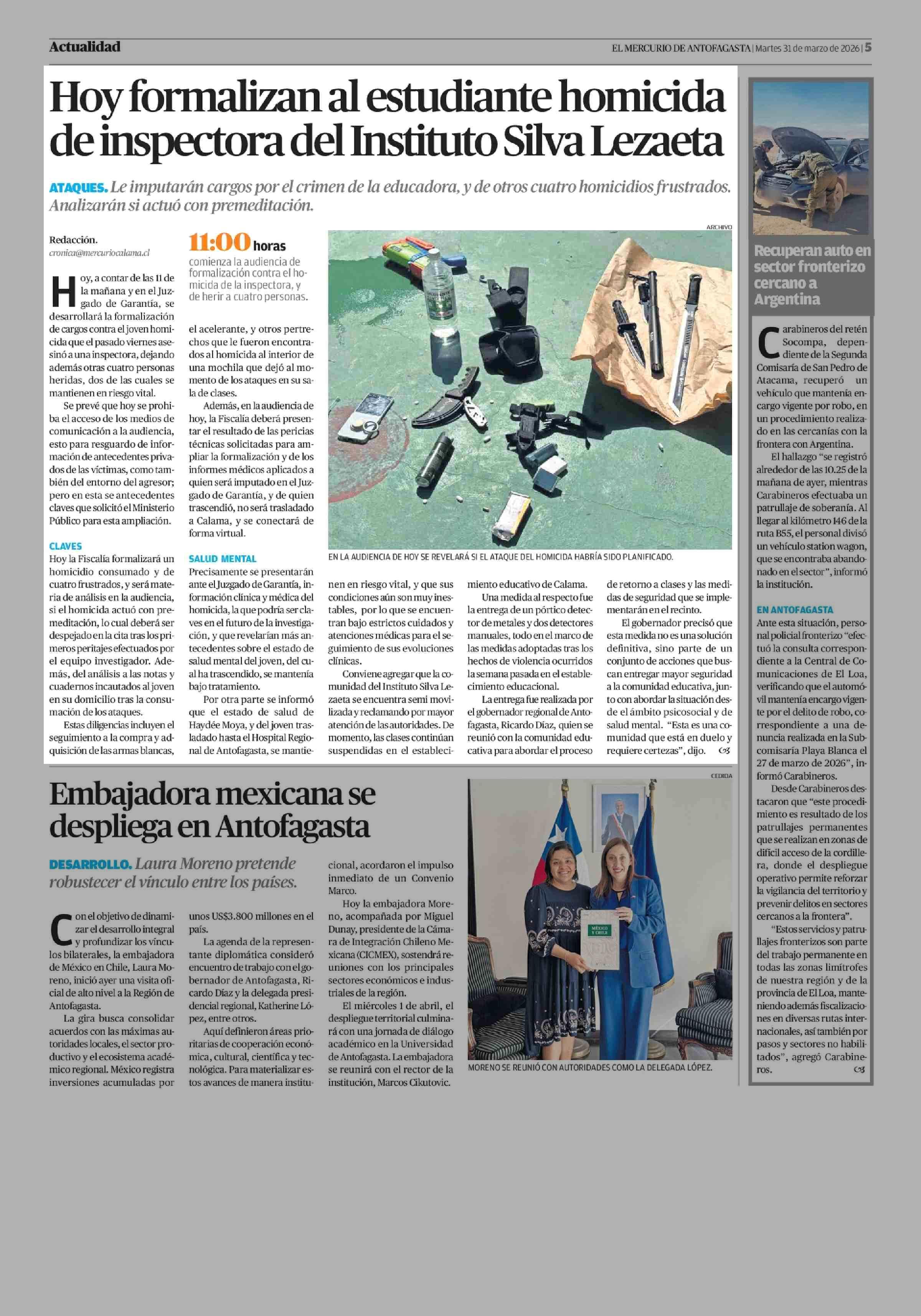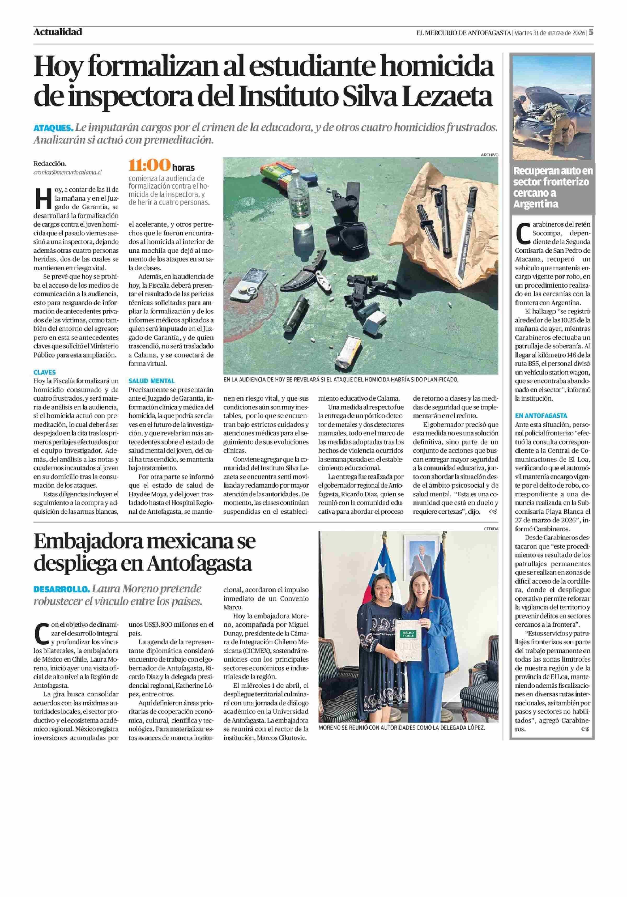 Hoy formalizan al estudiante homicida de inspectora del Instituto Silva Lezaeta 31-03-2026 El Mercurio de Antofagasta |