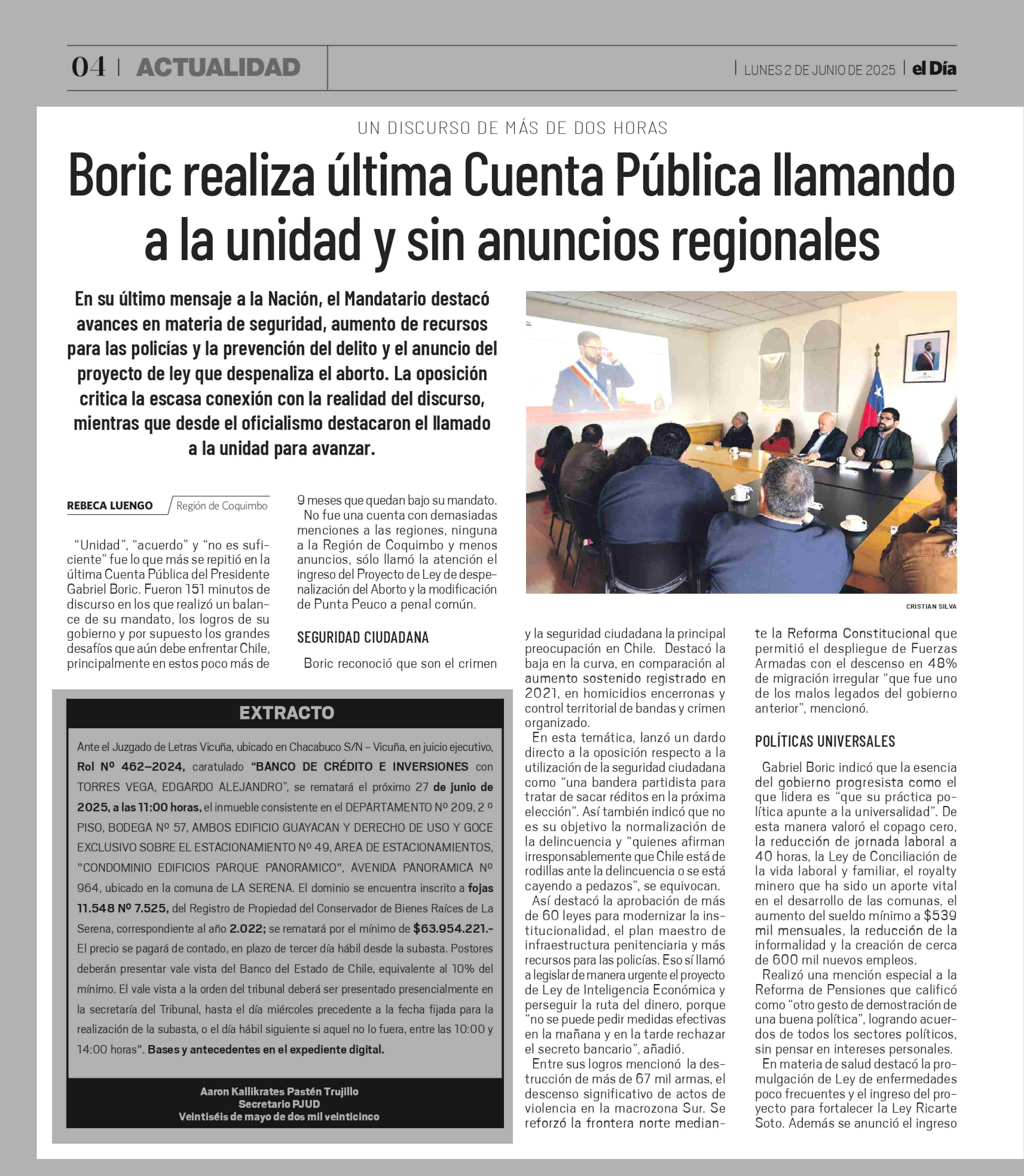 | Título: | Boric realiza última Cuenta Pública llamando a la unidad y sin anuncios regionales |