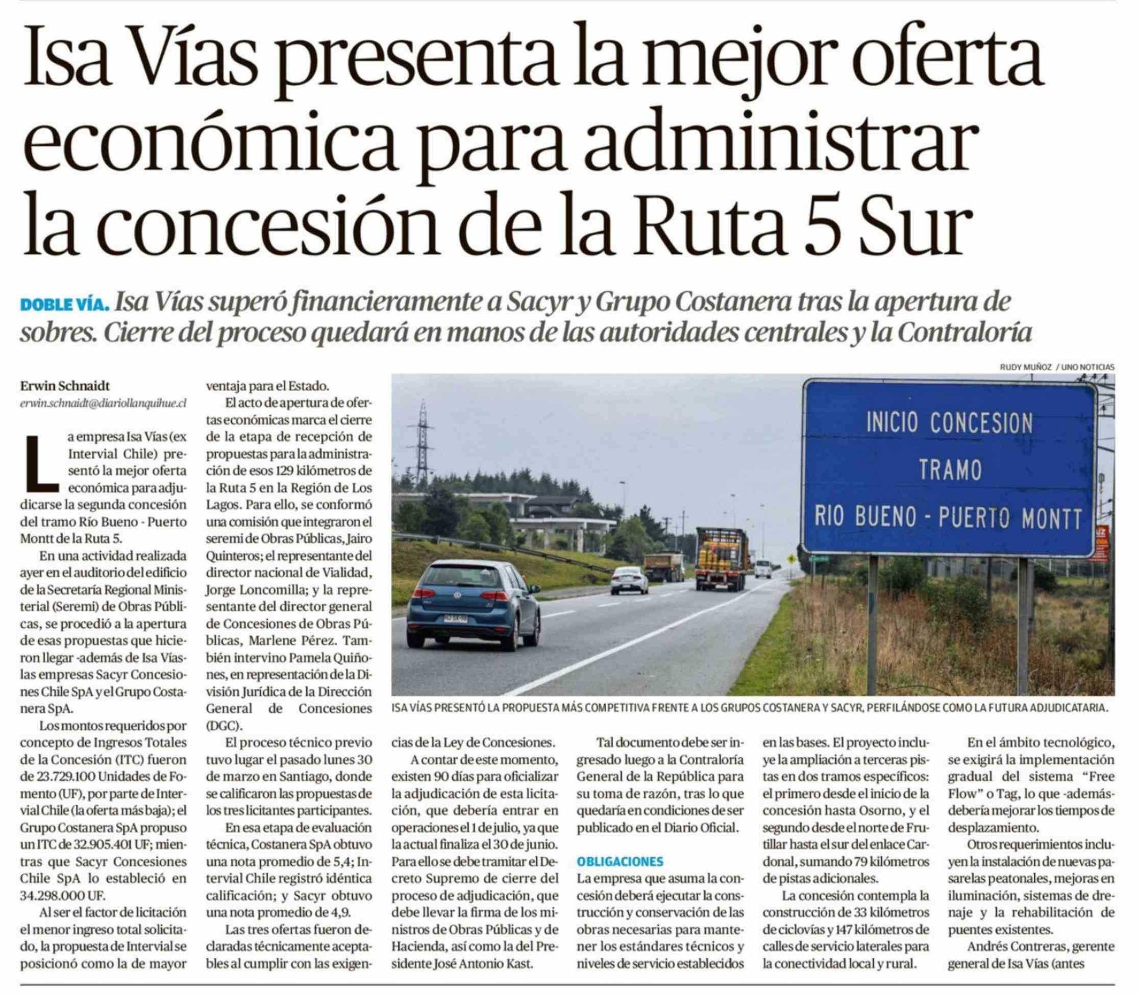 Título: Isa Vías presenta la mejor oferta económica para administrar la concesión de la Ruta 5 Sur