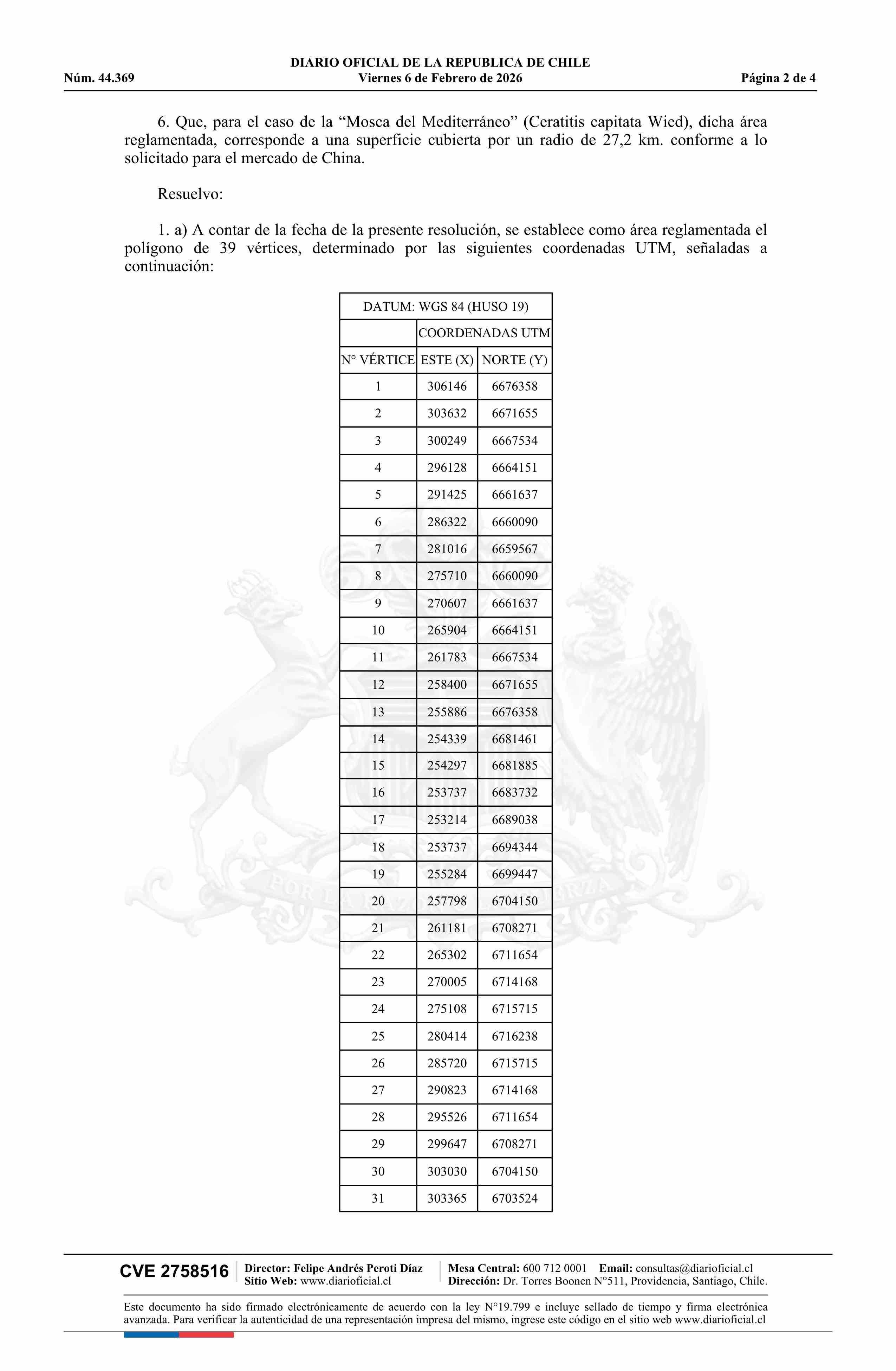 | Título: | Resolución exenta número 1.068, de 2025.- Amplia área de regulaciones cuarentenarias para el control y erradicación de la Mosca del Mediterráneo (Ceratitis capitata W.) para el mercado de China |