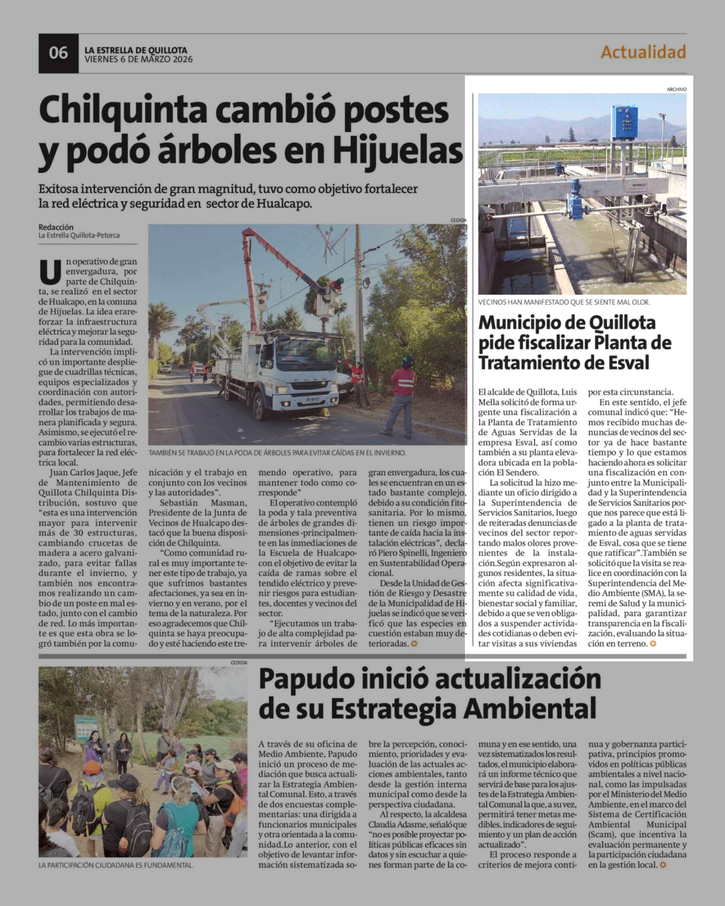 Municipio de Quillota pide fiscalizar Planta de Tratamiento de Esval 06-03-2026 La Estrella de Quillota |