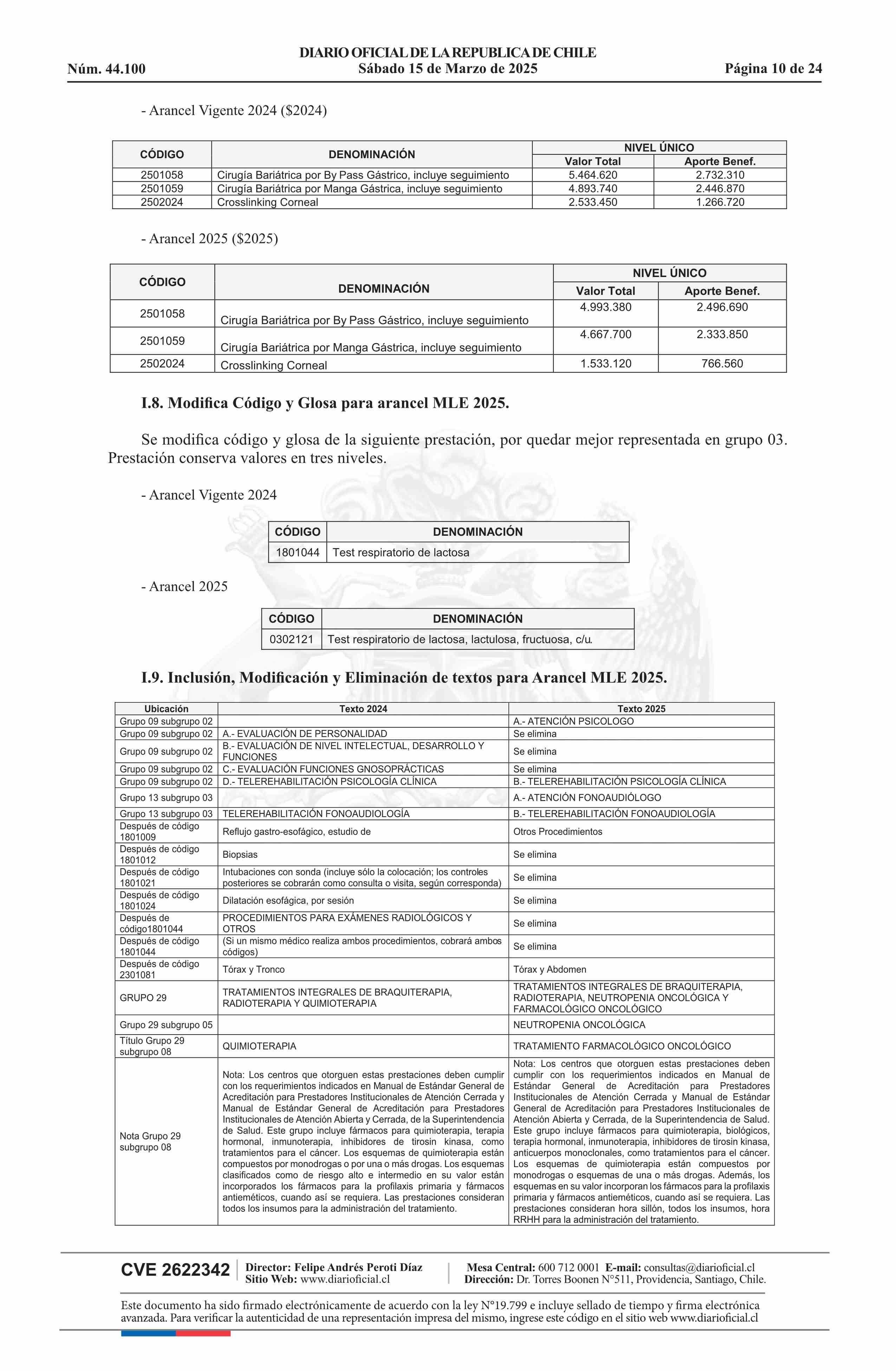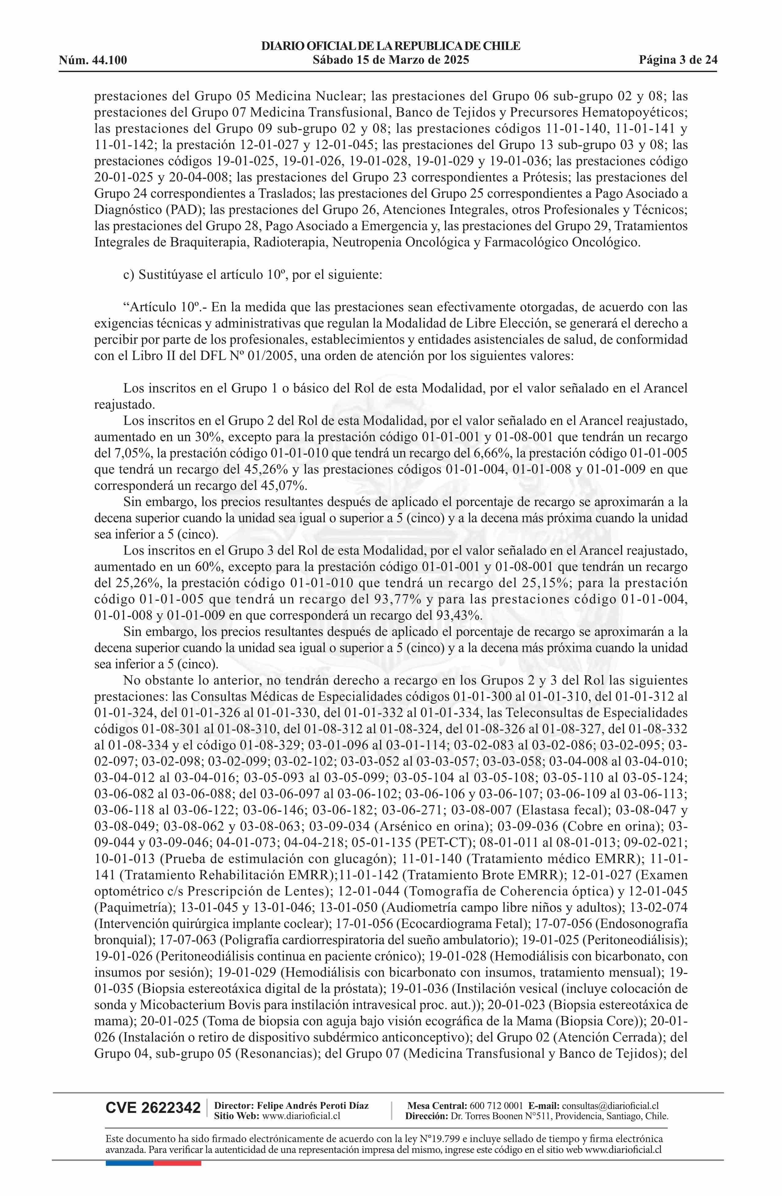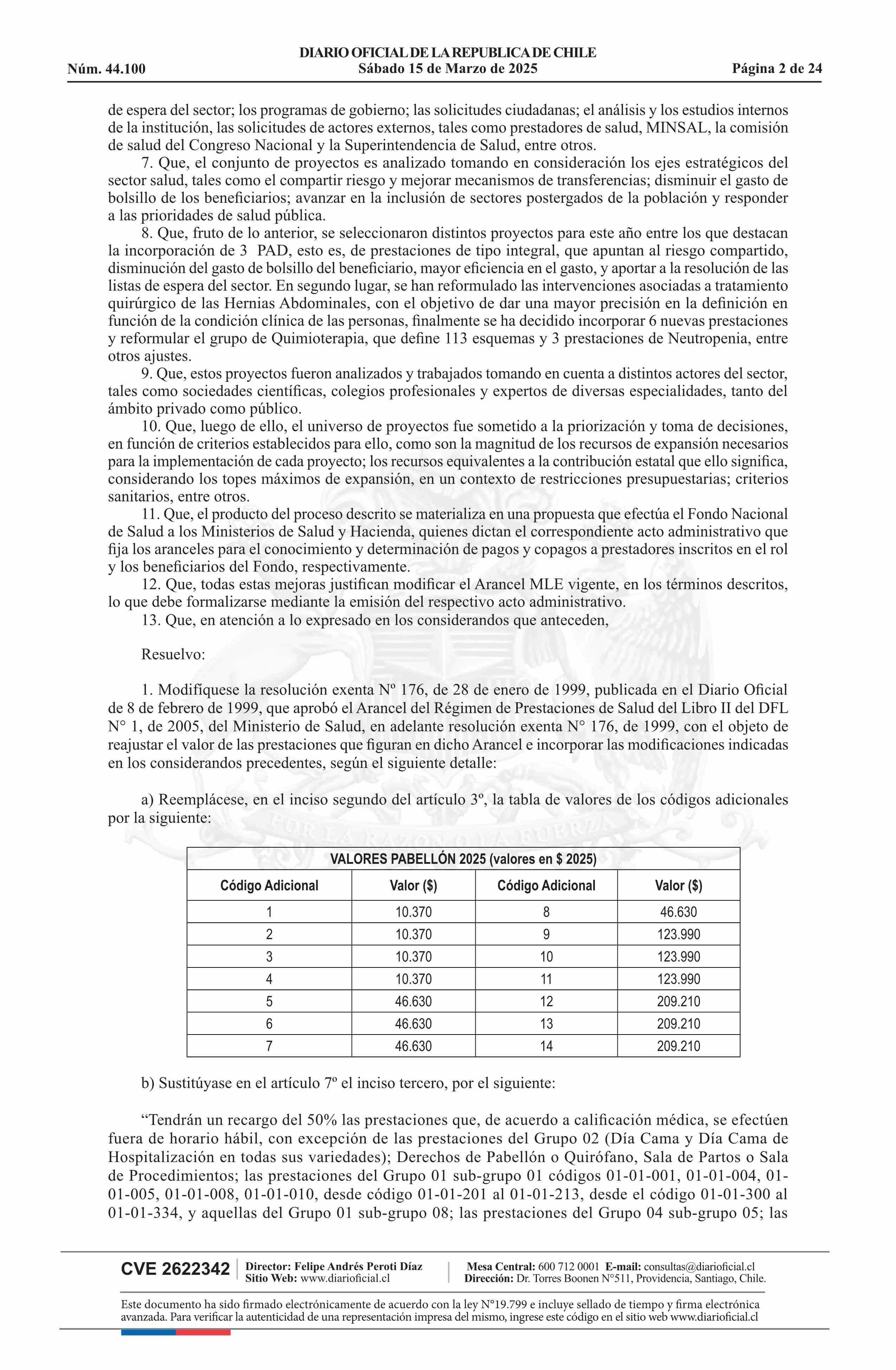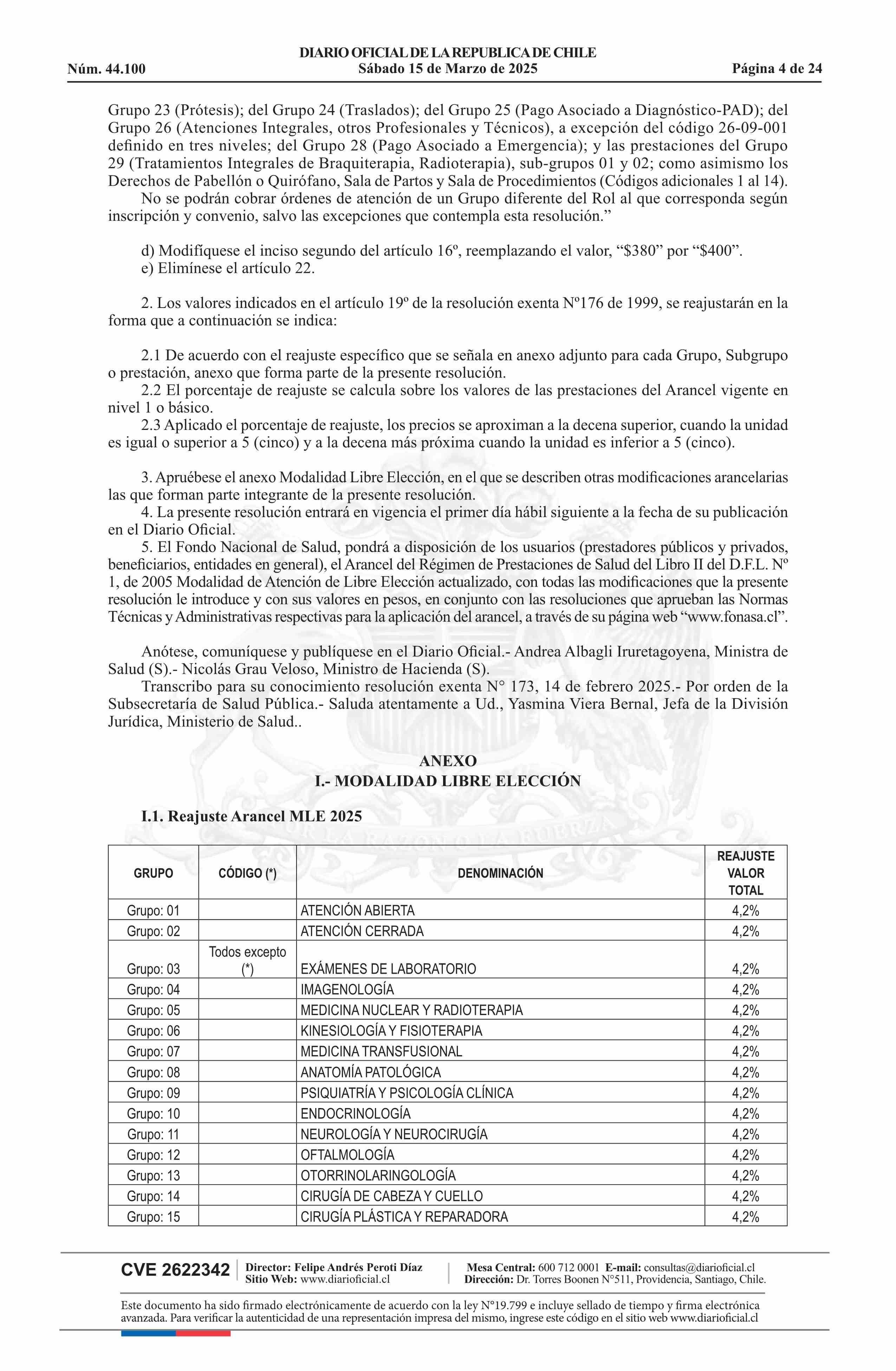 Resolución exenta número 173, de 2025.- Modifica resolución N° 176 exenta, de 1999, que aprueba el Arancel de Prestaciones de Salud, del decreto con fuerza de ley N° 1 de 2005 15-03-2025 Diario Oficial Edición Electrónica |