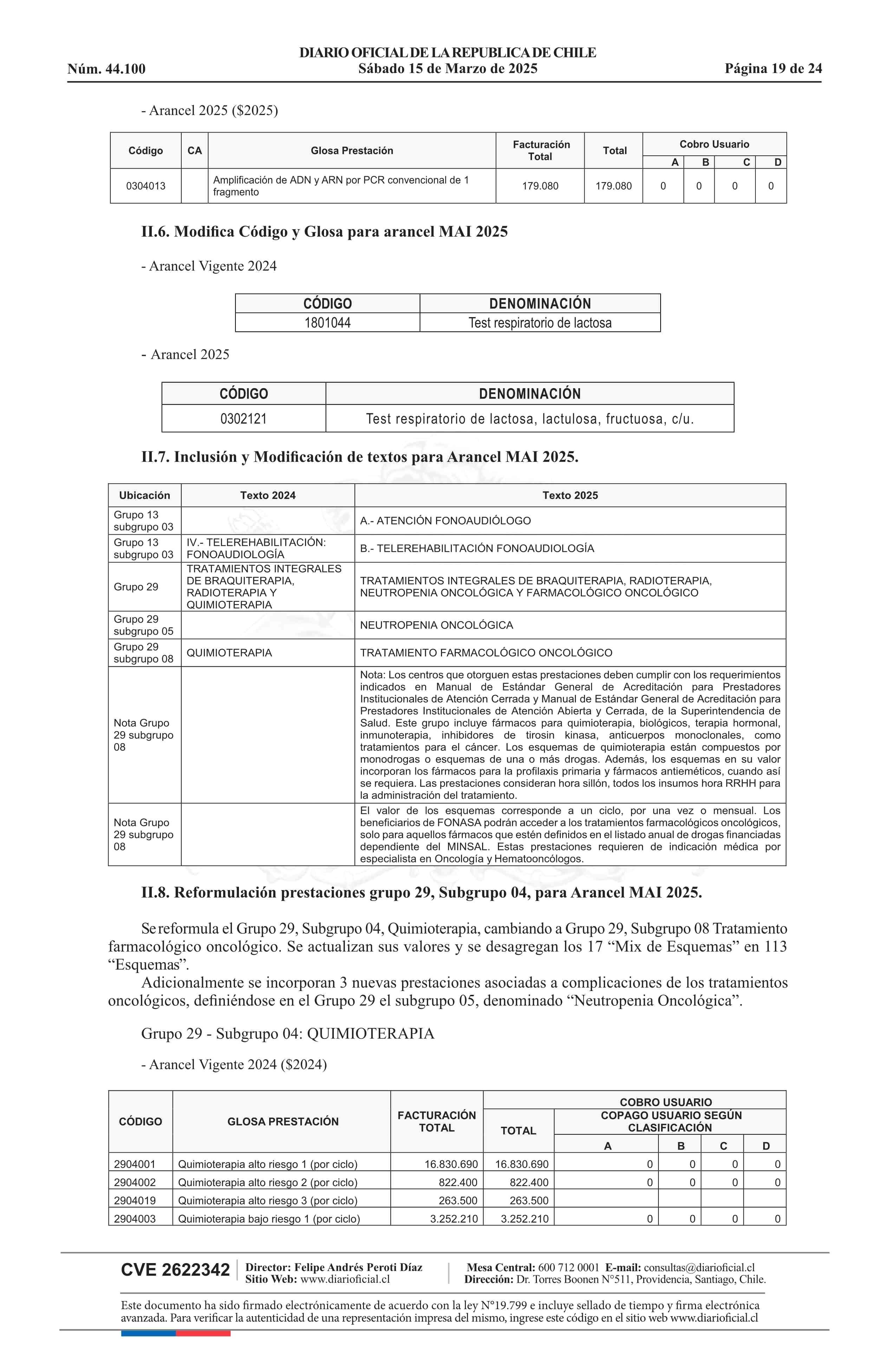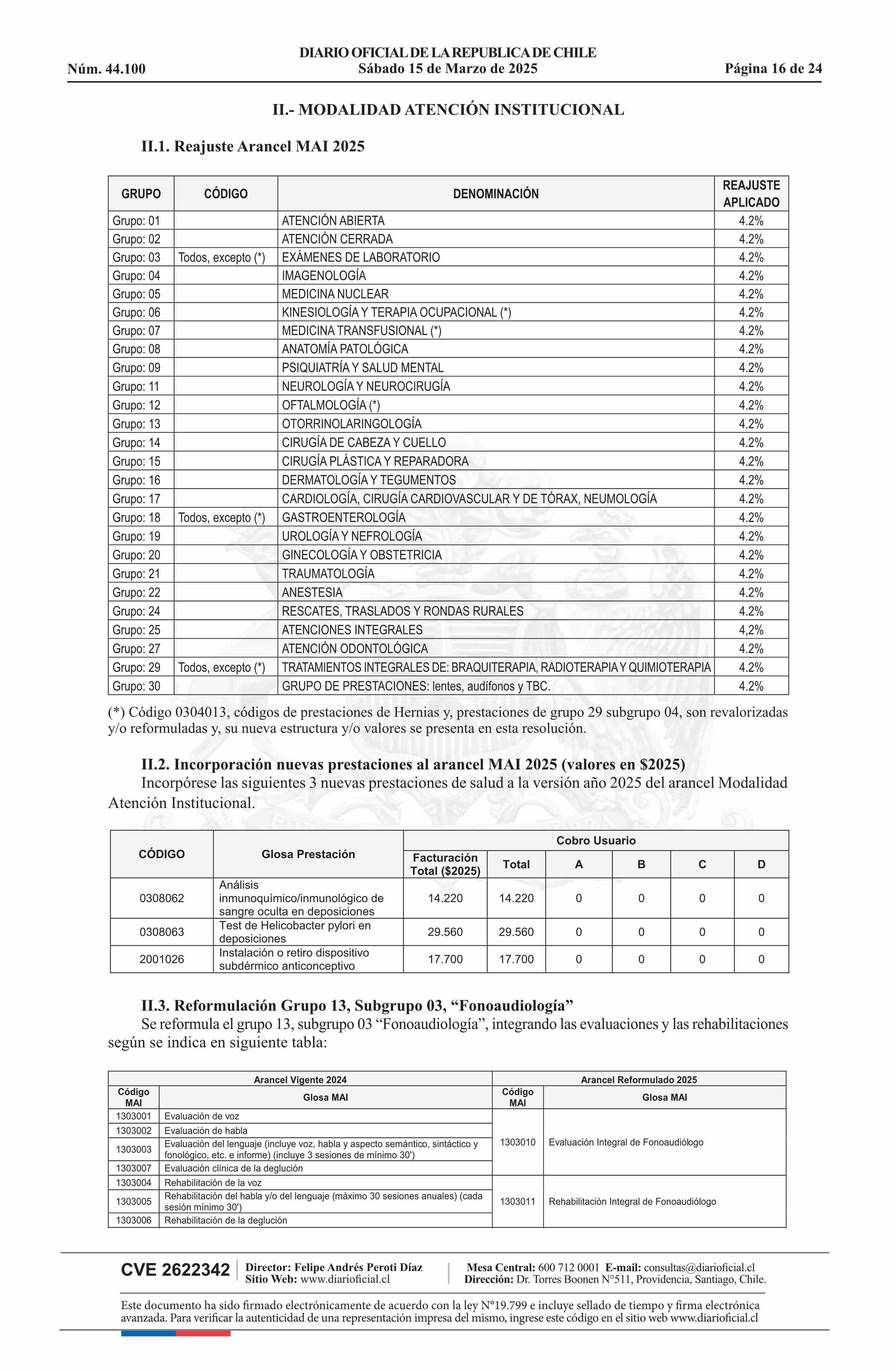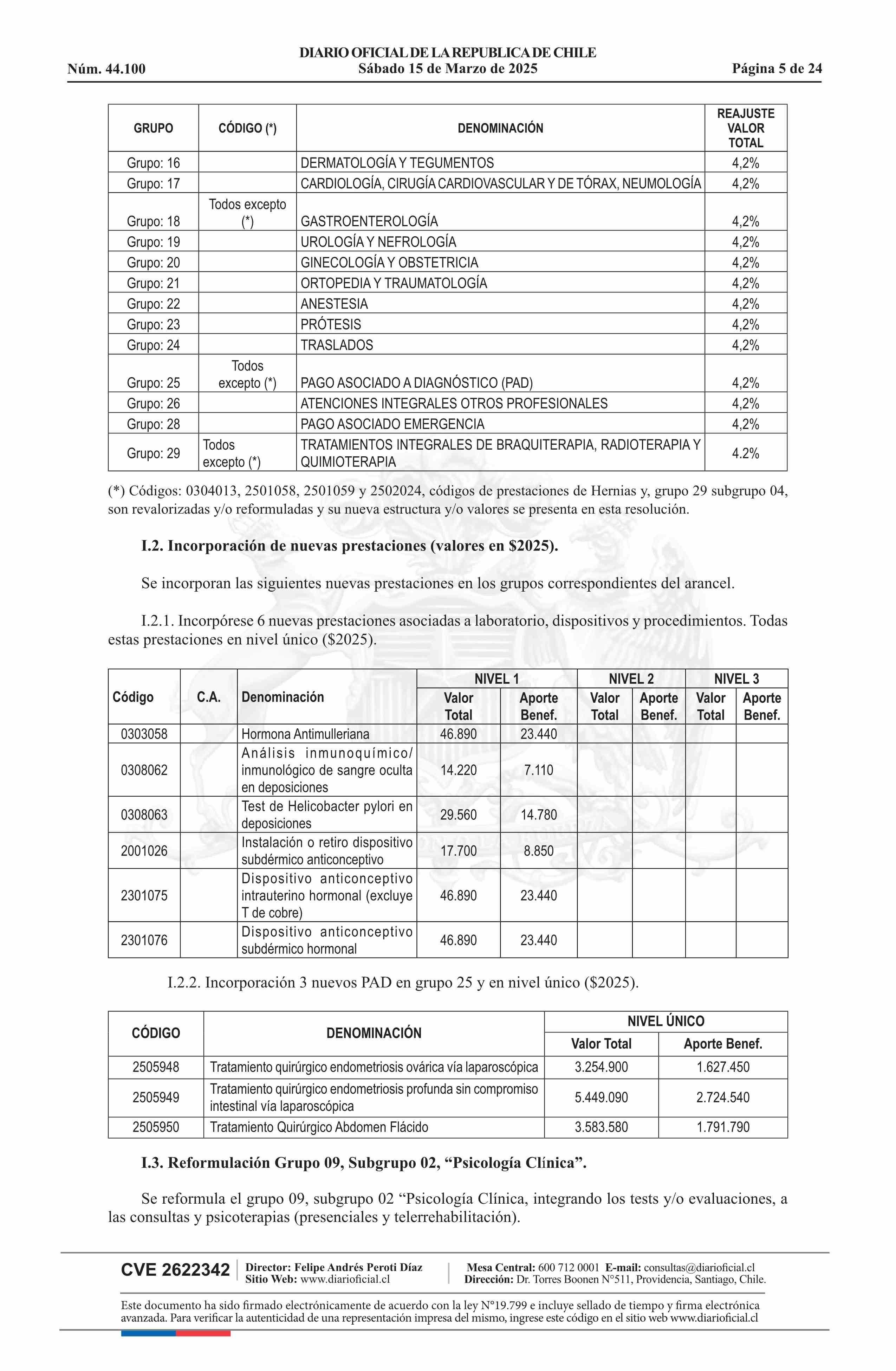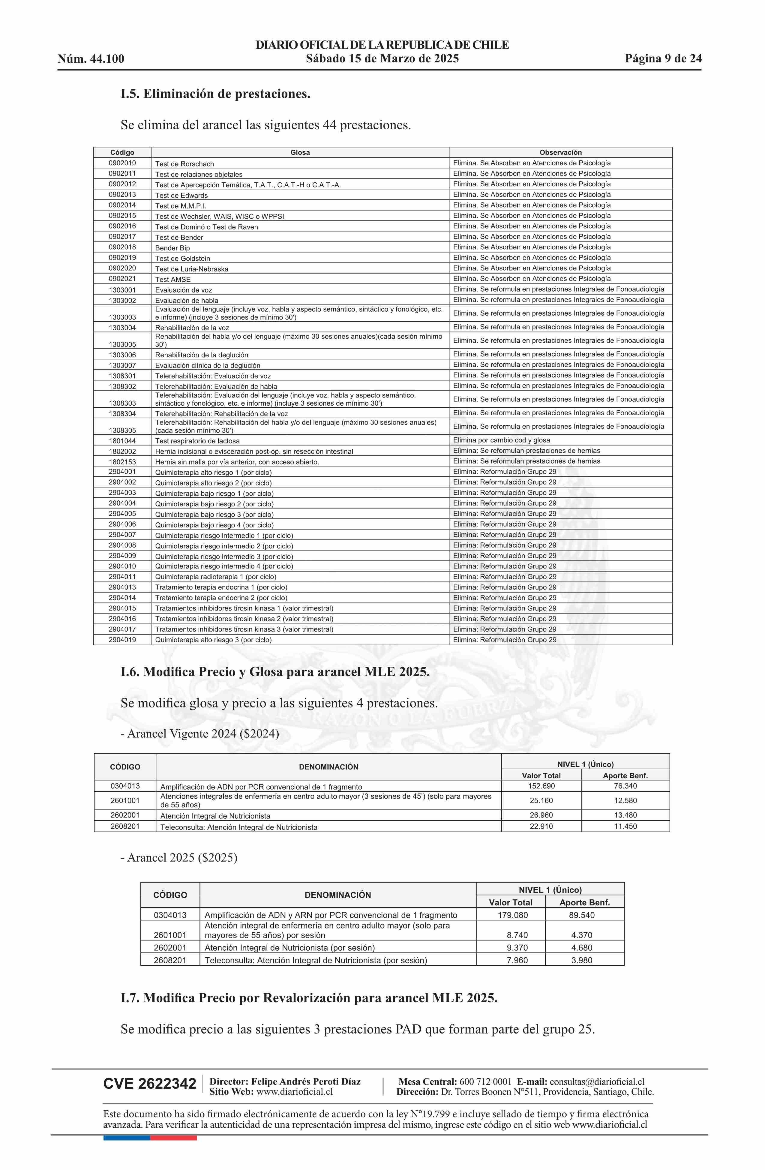 Resolución exenta número 173, de 2025.- Modifica resolución N° 176 exenta, de 1999, que aprueba el Arancel de Prestaciones de Salud, del decreto con fuerza de ley N° 1 de 2005 15-03-2025 Diario Oficial Edición Electrónica |