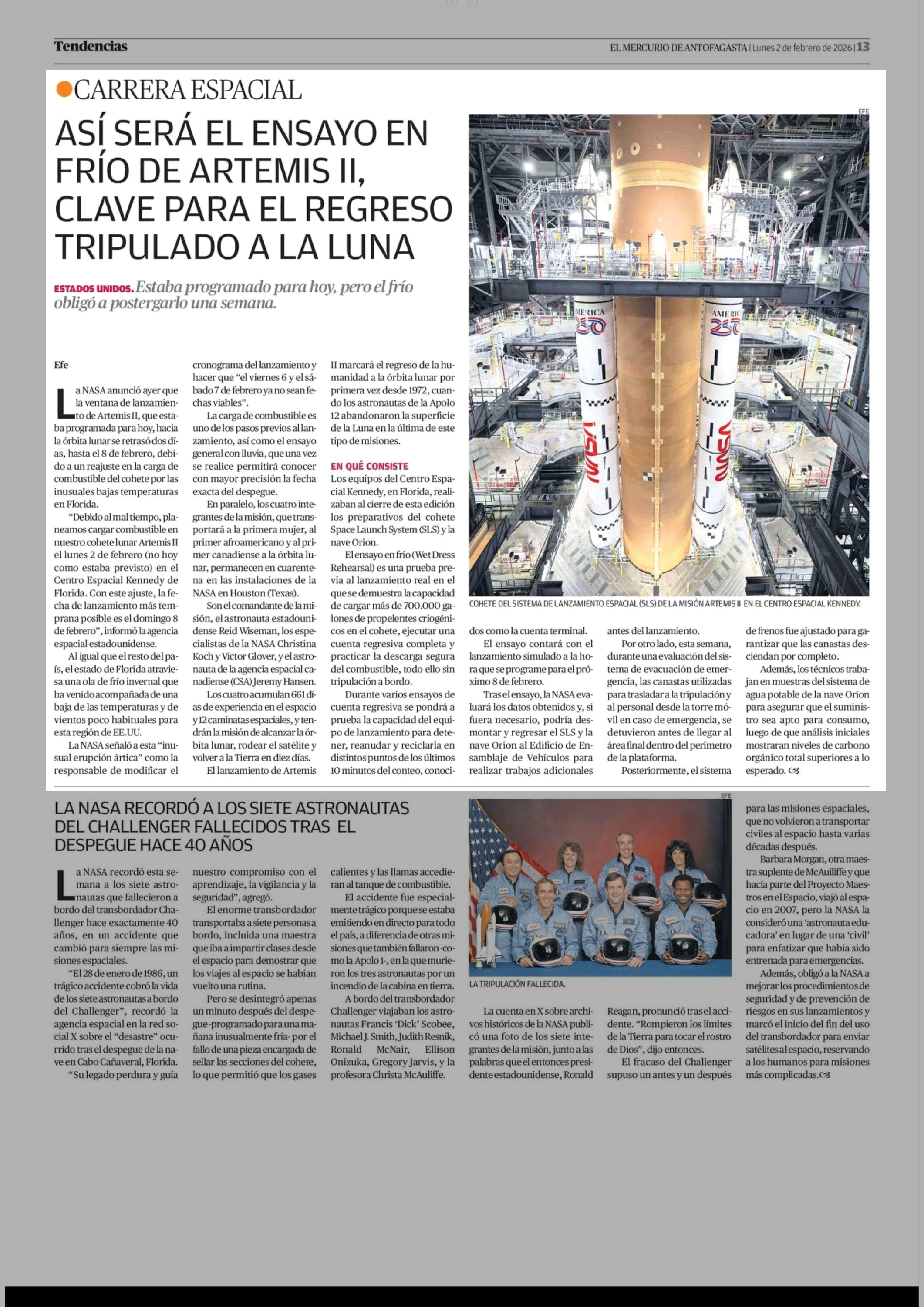 ASÍ SERÁ EL ENSAYO EN FRÍO DE ARTEMIS II, CLAVE PARA EL REGRESO TRIPULADO ALA LUNA 02-02-2026 El Mercurio de Antofagasta |