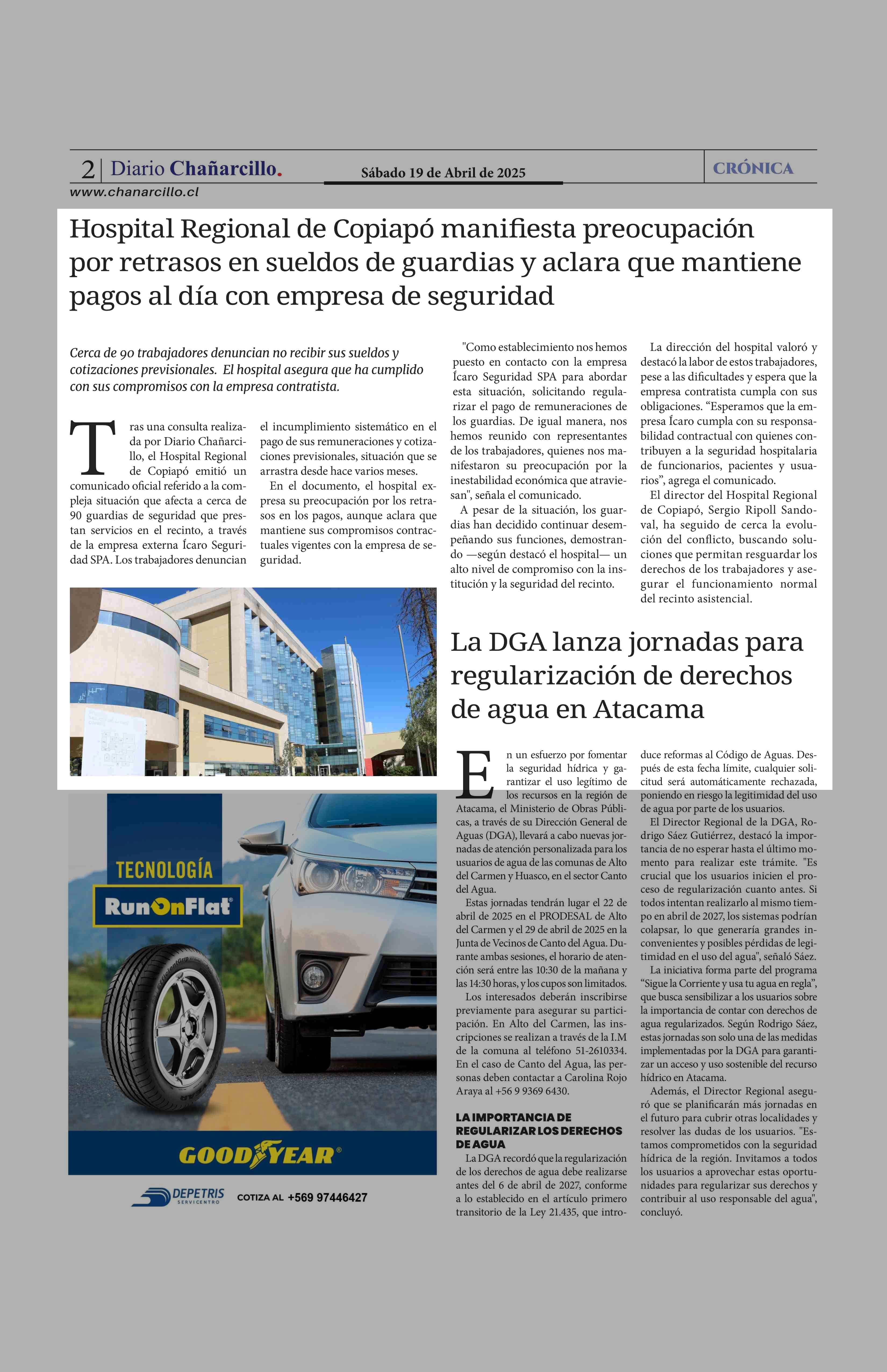 Título: Tras una consulta realizada por Diario Chañarcillo, el Hospital Regional de Copiapó emitió un comunicado oficial referido a la compleja situación que afecta a cerca de 90 guardias de seguridad que prestan servicios en el recinto, a través de la empresa externa Ícaro Seguridad SPA. Los trabajadores d