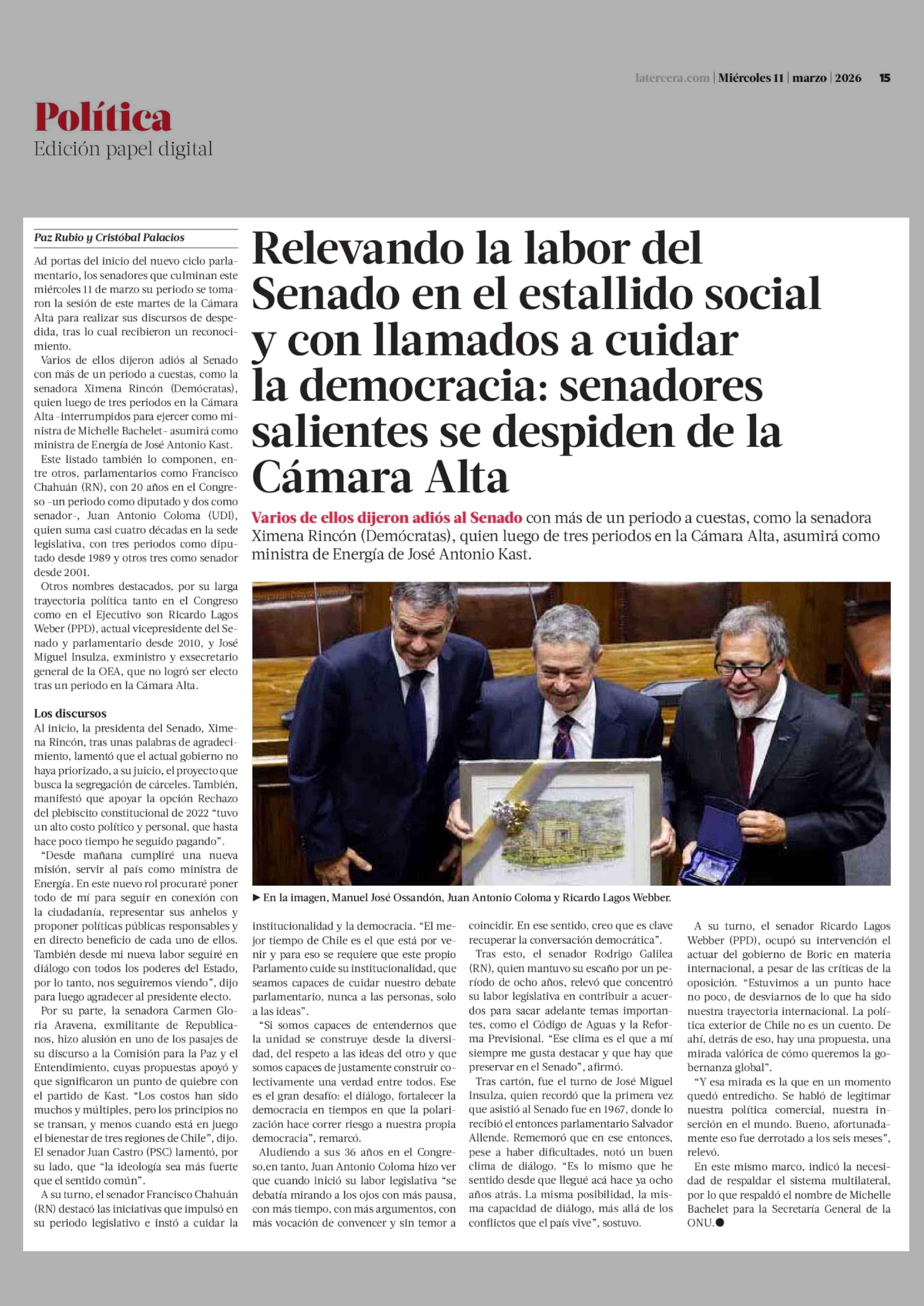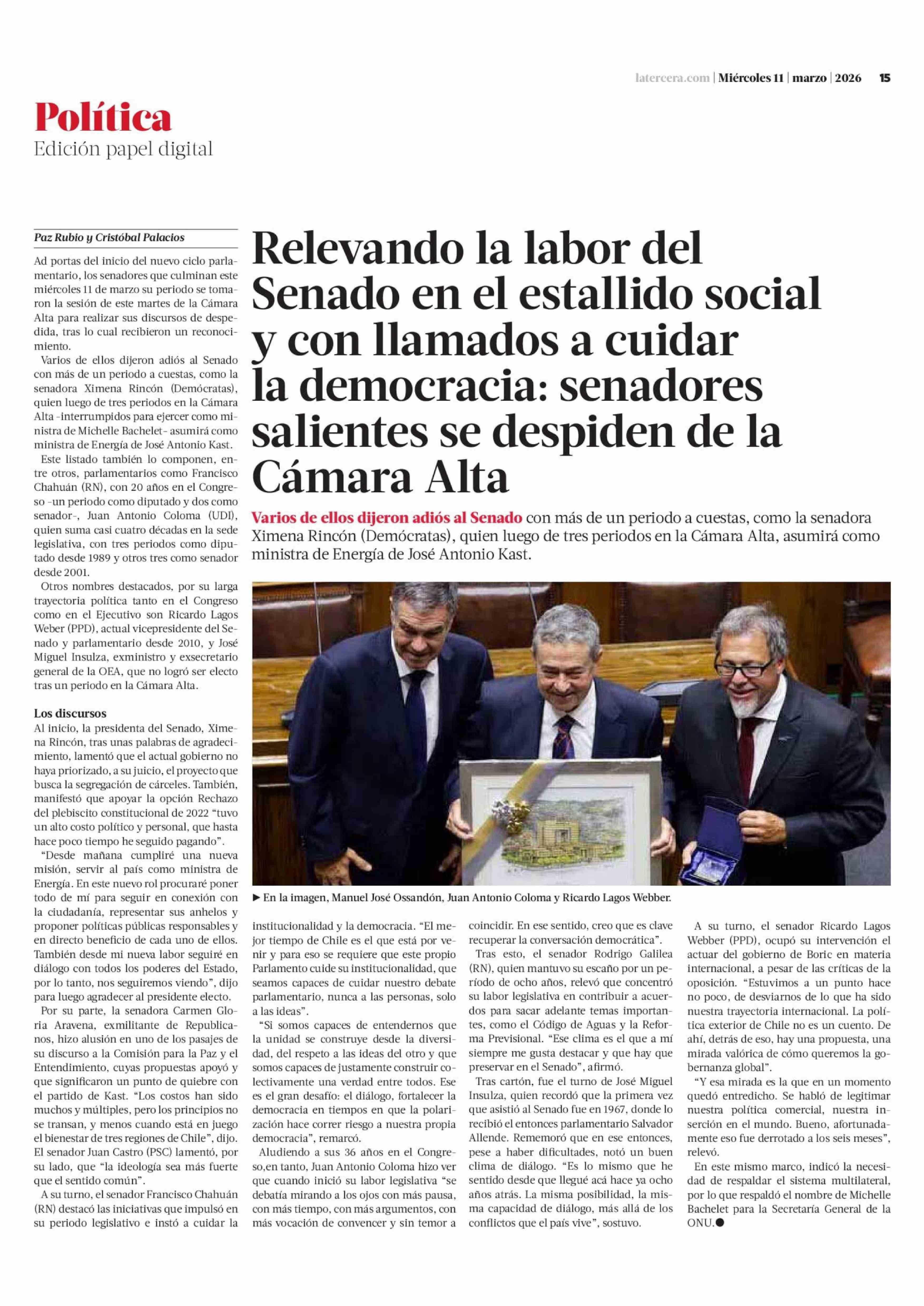 Relevando la labor del Senado en el estallido social y con llamados a cuidar la democracia: senadores salientes se despiden de la Cámara Alta 11-03-2026 La Tercera |