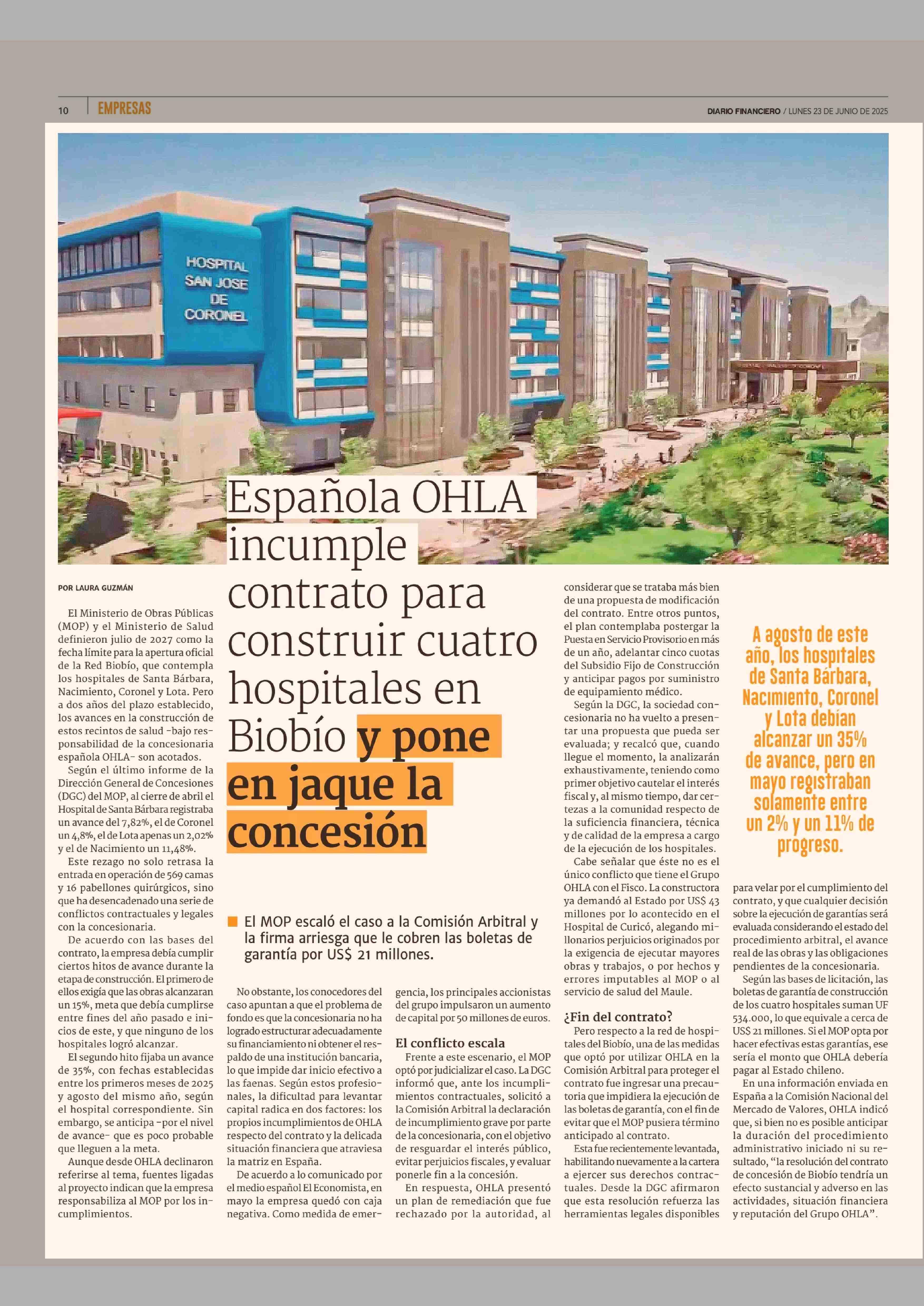 Título: Española OHLA incumple contrato para construir cuatro hospitales en Biobío y pone en jaque la concesión