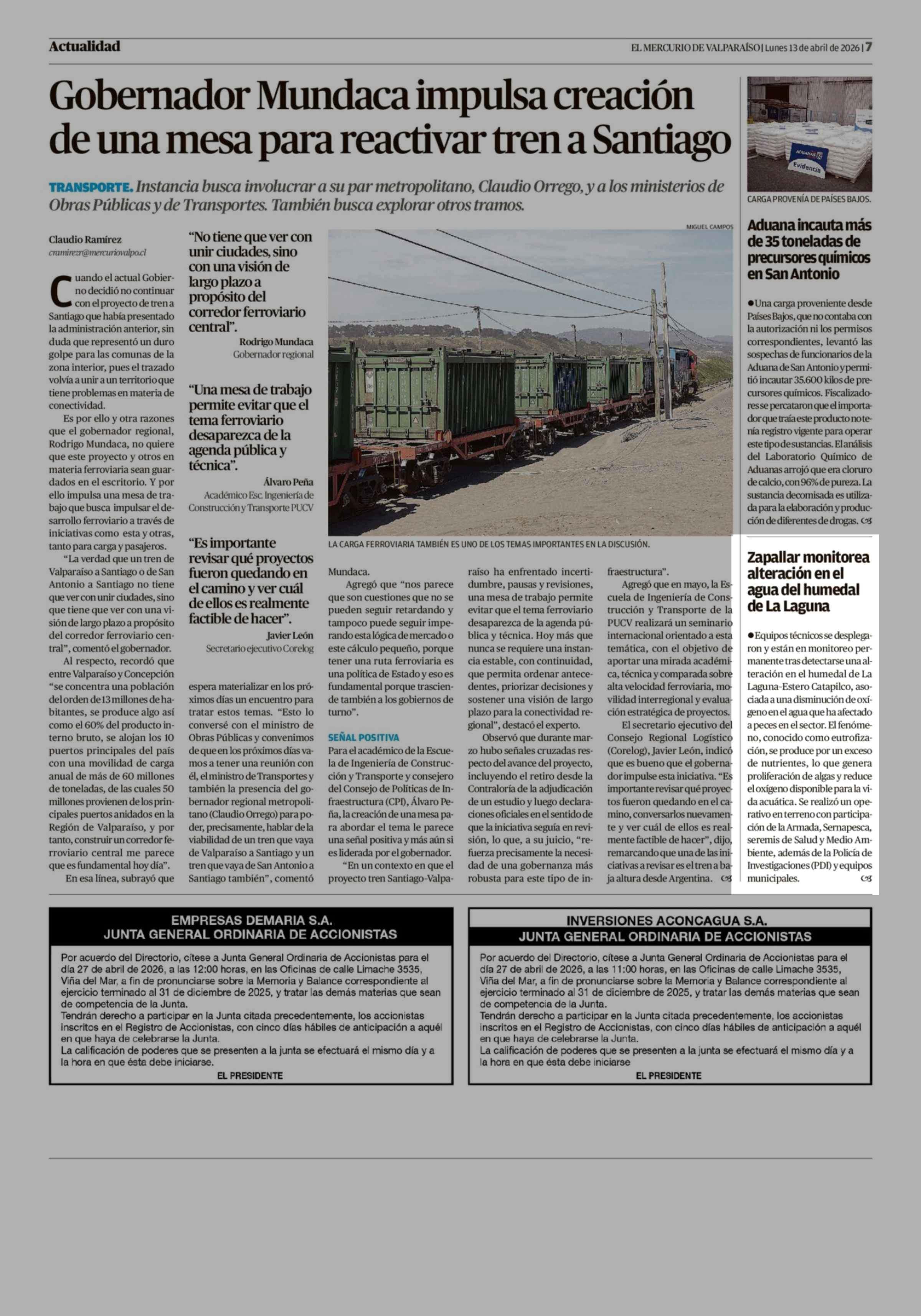 Zapallar monitorea alteración en el agua del humedal de La Laguna 13-04-2026 El Mercurio de Valparaíso |