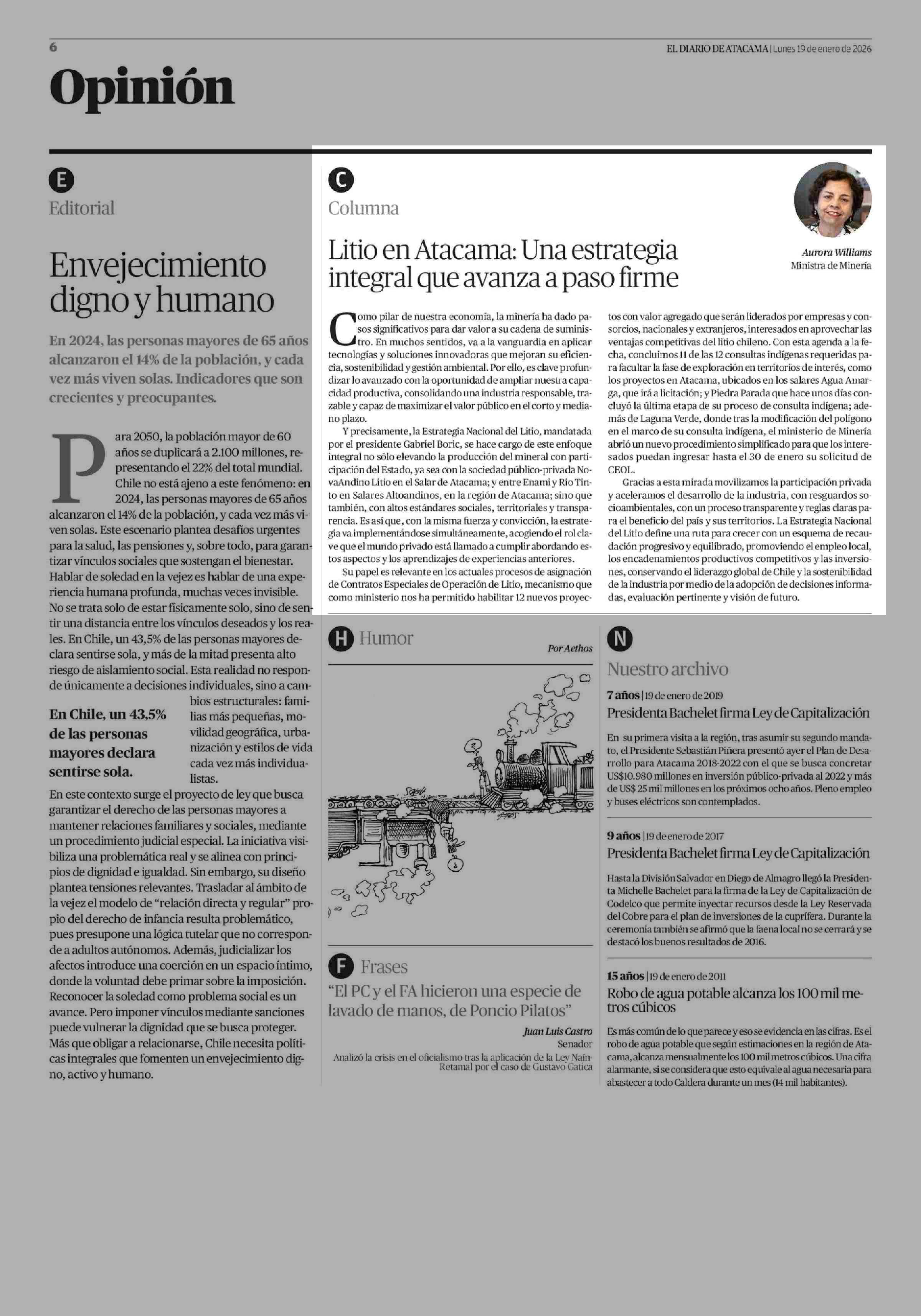 Columnas de Opinión: Litio en Atacama: Una estrategia integral que avanza a paso firme 19-01-2026 El Diario de Atacama |
