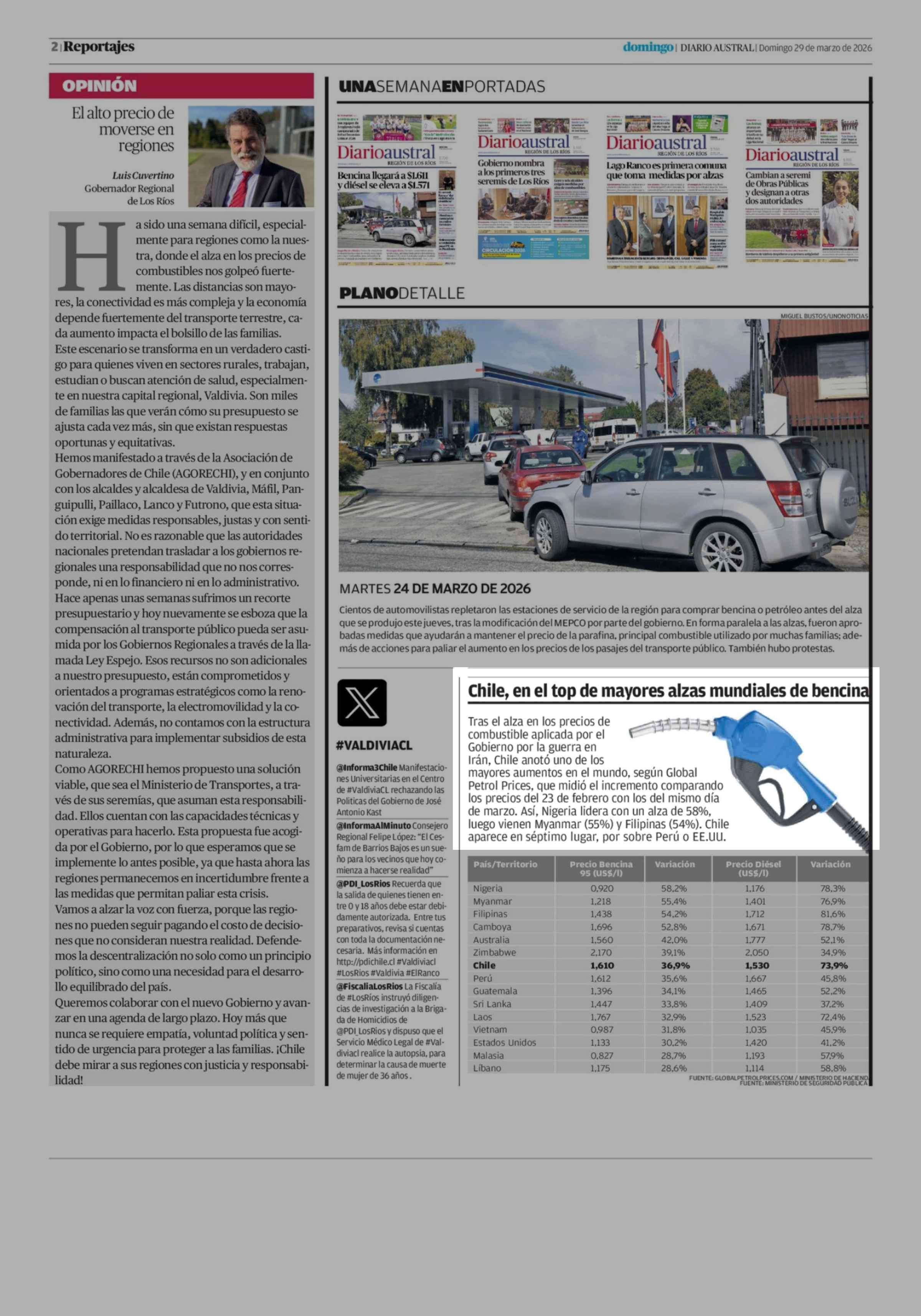 Chile, en el top de mayores alzas mundiales de bencina 29-03-2026 Diario Austral Región de Los Ríos |